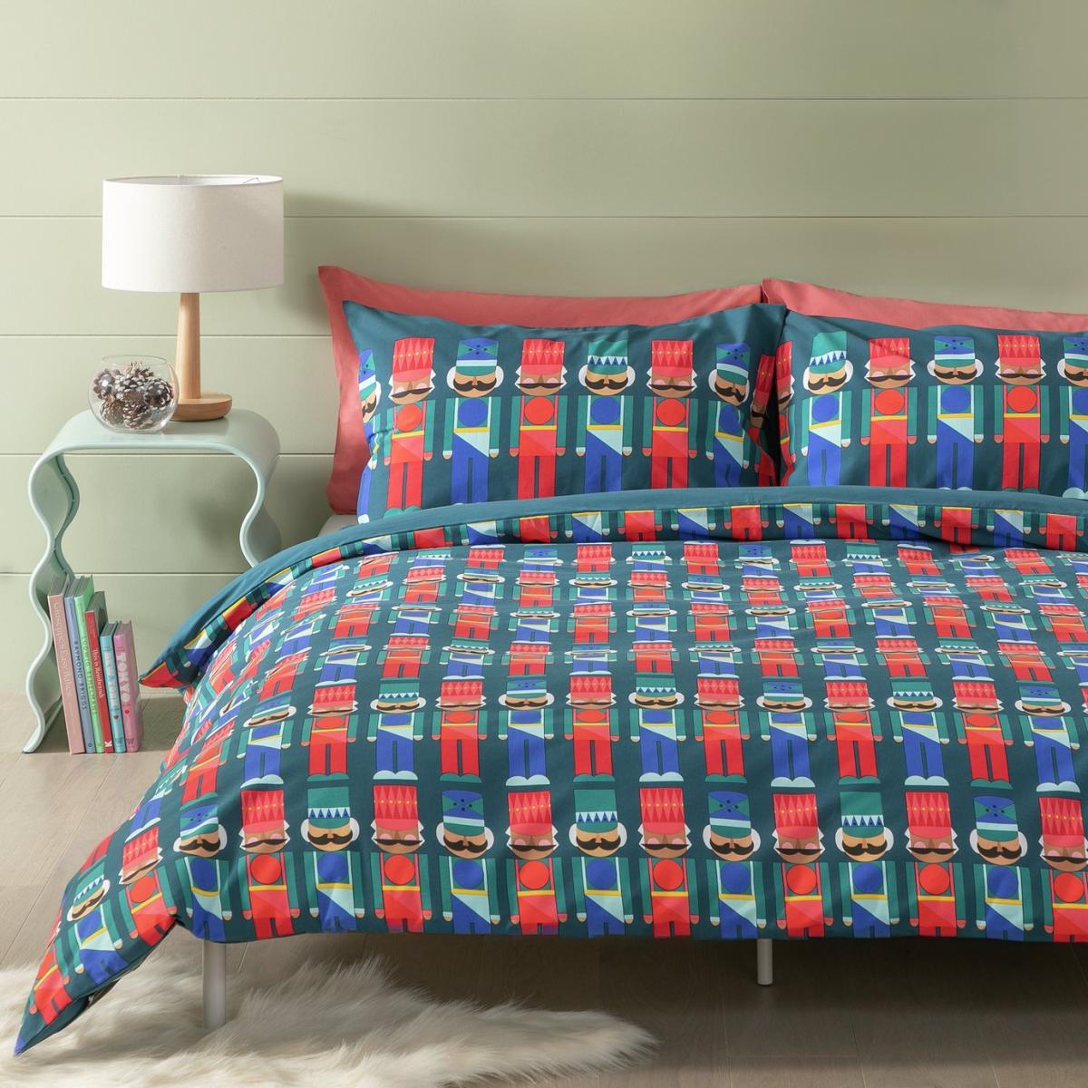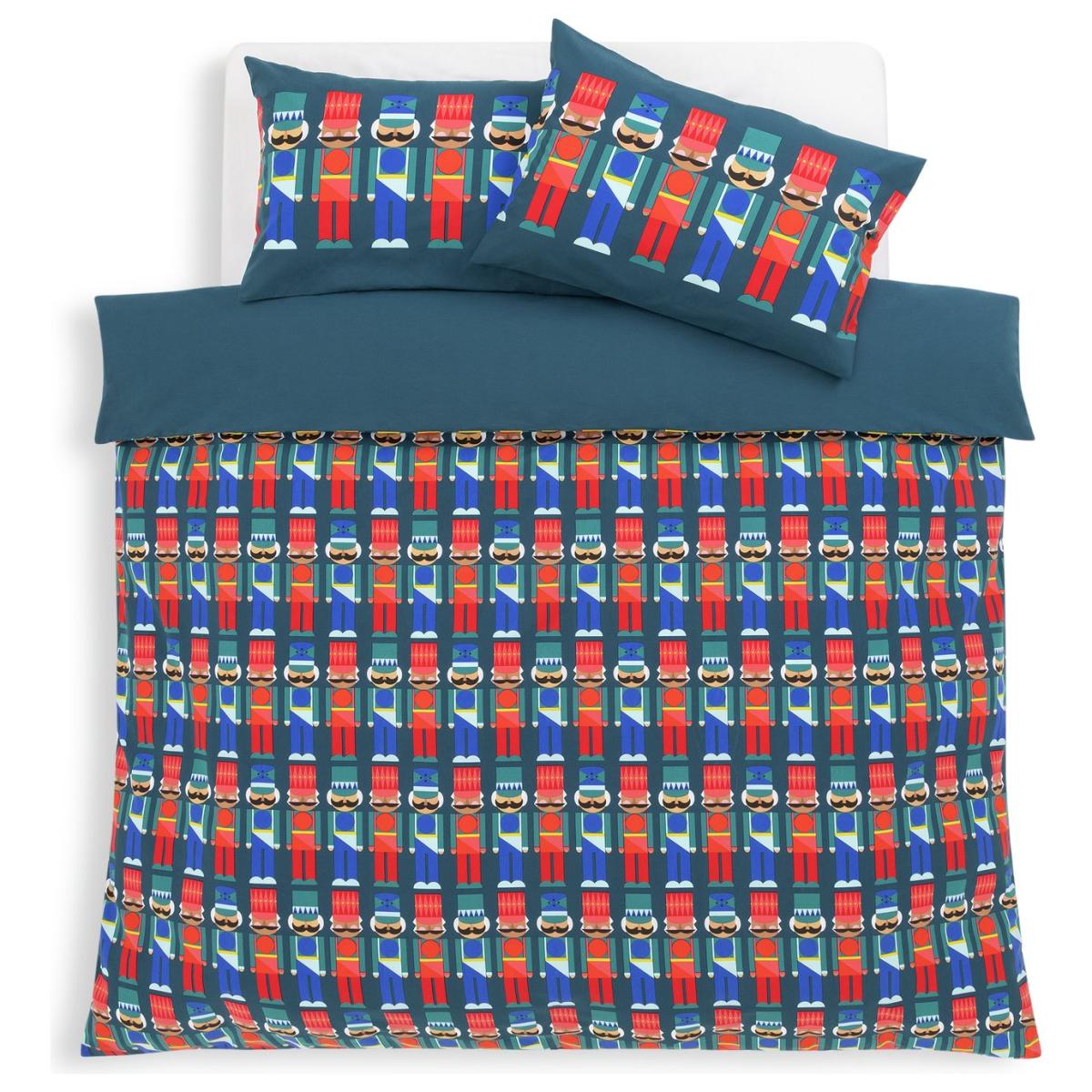 Cosy Christmas bedding with a traditional touch. Designed in classic festive colours, our Nutcracker print duvet set is warmly inviting. On the reverse, the rich block colour adds to the comforting winter feel. This item carries the STANDARD 100 by OEKO-TEX logo, which means you can be certain that every component has been tested for harmful substances and is therefore harmless to human health. 52% recycled polyester, 48% cotton. 144 thread count. Set includes 1 duvet cover and 2 pillowcases. Bed size: double. Length 200cm, Width 200cm. Buttons for fastening. Standard pillowcase (s). Pillow case length 75cm, Width 50cm. Machine washable at 40 C. Suitable for tumble drying.