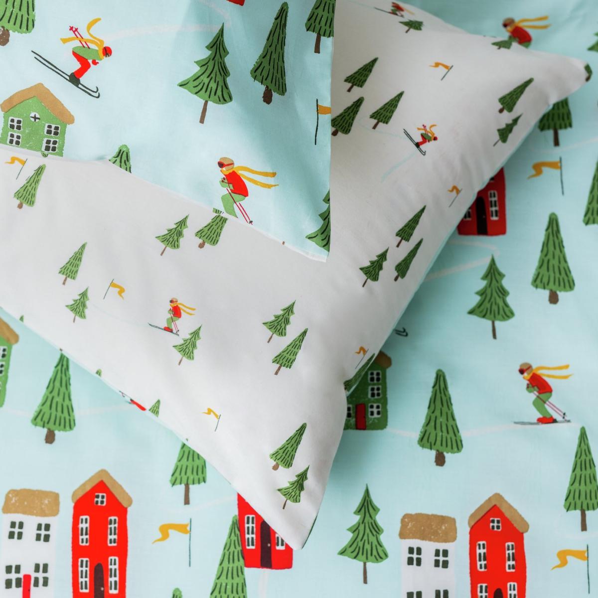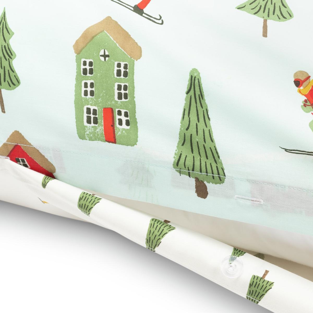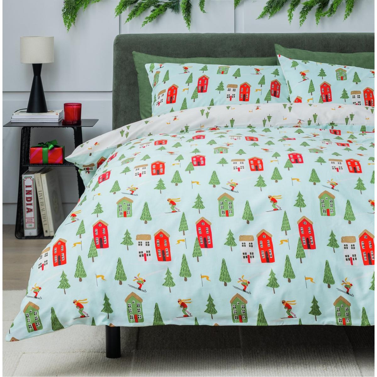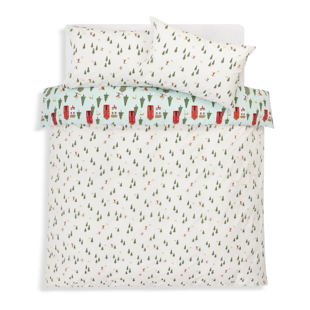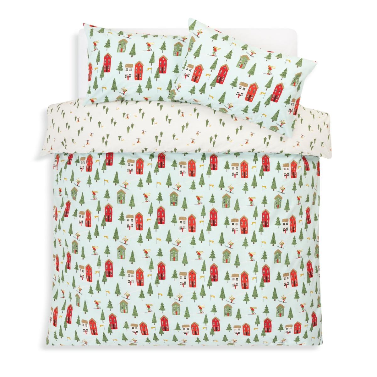 Slope off to bed and snuggle under our ski themed duvet set. Reversible with 2 different prints, so you can flip from one scene to another. Fun bedding for the winter season. This item carries the STANDARD 100 by OEKO-TEX logo, which means you can be certain that every component has been tested for harmful substances and is therefore harmless to human health. 52% recycled polyester, 48% cotton. 144 thread count. Set includes 1 duvet cover and 2 pillowcases. Bed size: double. Length 200cm, Width 200cm. Normal confection edging detail. Reversible. Buttons for fastening. Standard pillowcase (s). Pillow case length 75cm, Width 50cm. Reversible pillowcase (s). Machine washable at 40 C. Suitable for tumble drying.
