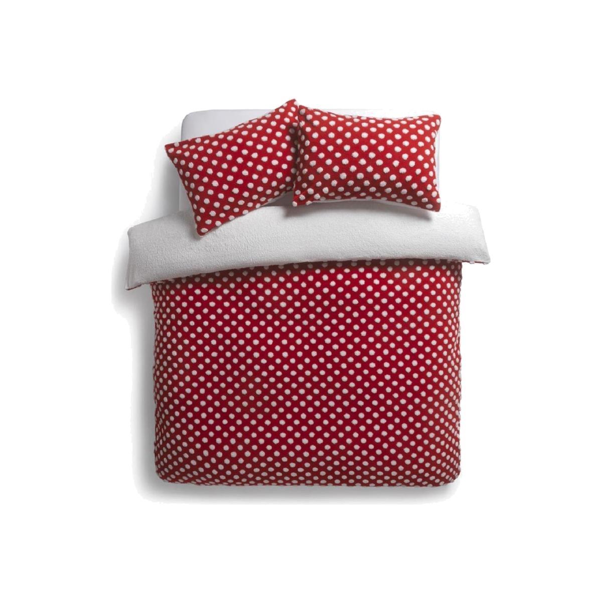 If Santa had a duvet. This delightful, dotted fleece set would be it. Too Christmassy for words this 3 piece duvet is all ready for a super snuggly sleep. It's also easy care and reversible. So don't worry if your midnight mince pies crumble or Rudolph leaves a muddy hoof print. Fun and festive, this will warmly welcome holiday house guests. Who knows, the man himself might appreciate a quick nap stop while he's there too. 3D jacquard dot and nice handle fleece. Set includes 1 duvet cover and 2 pillowcases. Machine wash as synthetic at 40 C. Suitable for tumble drying. 100% polyester. Reversible. Buttons for fastening.