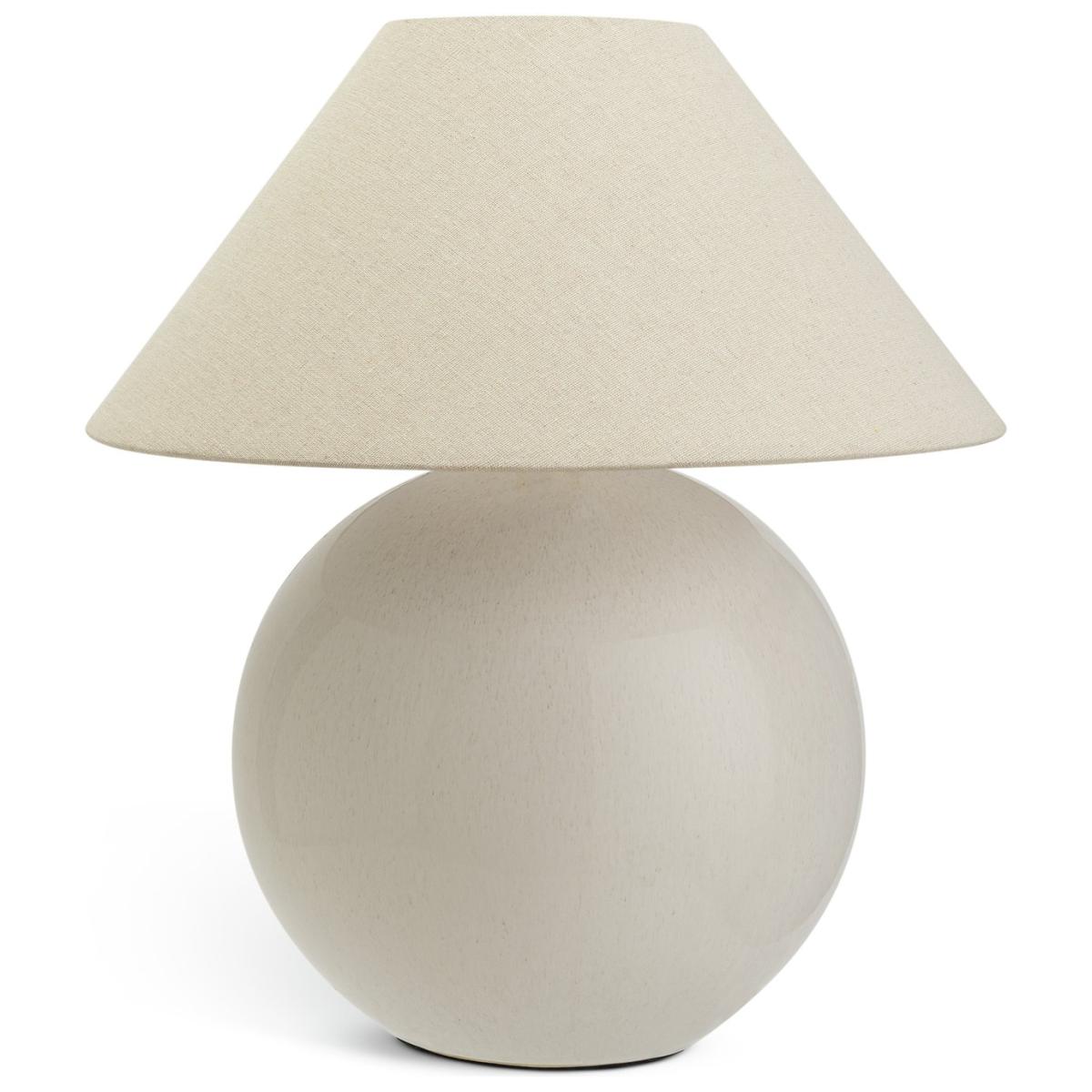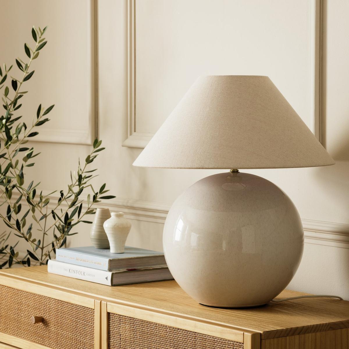 So why is this lamp one of our favourites? Purely because its neutral cream linen shade and sculptural silhouette, mean you can use it anywhere. Slip it into any colour scheme, pop it onto any surface and it will look the business. Finished in a cream reactive glaze, it throws out an elegant and warm illumination the second you switch on. Dimensions: Overall size H51, Diameter 51.5cm. Shade size H20, D46cm. Diameter of base 32.5cm. Cord length 1.8m. Bulb Information: Bulbs required 1 x classic E27 edison screw LED bulb(s) (not included). Recommended maximum wattage: 15 watts. General Information: Shade colour: cream. Base colour: cream. Shade material: linen. Base material: ceramic. In-line switch. IP rating 20 - not suitable for bathroom use. App needed for use: No. Minimal assembly. Product is mains powered plug in. This lighting product is a class 2 fitting. Manufacturer's 1 year guarantee.