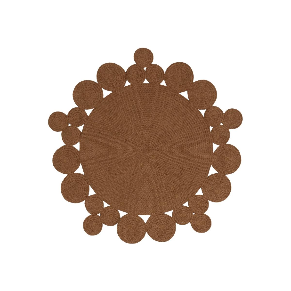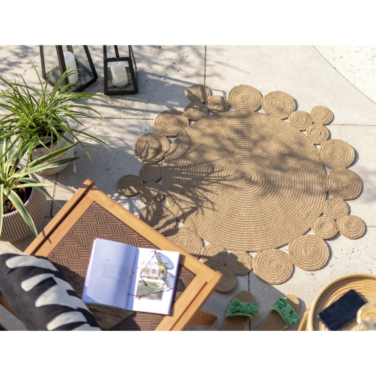 Going around in circles trying to find a distinctively different rug? Stop, you've just found it. This round rug is naturally gorgeous in both outdoor and indoor settings. The geometric design will spruce up your patio or lounge instantly. And the soothing brown shade will help bring in a boho feel. Made from polyester, this carpet will easily handle daily wear and tear. A fun, fuss-free choice for your floor. Natural. Made from recycled materials. Water resistant coating. Non-slip backing. Dust or wipe with a damp cloth only. Size L100 , 100cm. Weight 1.6kg. Cannot be cut to size. Made in India. 1 year manufacturer's guarantee.