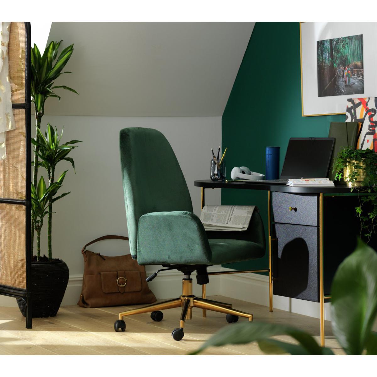 I love this green velvet office chair for adding a touch of colour and luxury to a workspace. Its rich shade works well in both modern and more traditional interiors, especially when paired with brass accents or dark woods. The velvet finish lends a sophisticated feel, making it a statement piece without overwhelming the room. Practical styling tips include keeping the surrounding decor neutral to let the chair stand out, or complementing it with a lush plant or textured textiles in similar tones. It's versatile enough to fit into a home office or a desk in a stylish communal space, bringing both comfort and visual interest.