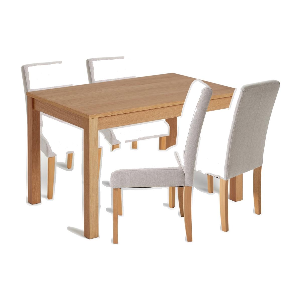 Gather round, it's time to dine. Welcome to Clifton, our smart, oak effect dining set that's roomy enough for 4 but won't crowd the room. With 4 comfy padded chairs upholstered in cream fabric and solid wood legs, it's a smart set that ticks all the boxes. Now, ready for some tempting tableware to go with your new dining set? Table: Table size H74, W80, L120cm. Wood effect table with wood effect legs. Wood effect table top finish. Self-assembly - 2 people recommended. Chair: Includes 4 chairs. Size of each chair H95, W45, D54cm. Seat height 46cm. Wood effect frame with solid wood legs. Fabric seat pad. Minimum assembly. Maximum user weight per chair 130kg. Individual chair weight 7.7kg. Package Dimensions: Table package 1 size H13, W137, D89cm. Individual chair package size H46, W98, D32cm. General information: We are excited to be welcoming some of our favourite HOME products into the Habitat range. Your product may arrive in Habitat or HOME packaging. Dust or wipe with a damp cloth only.