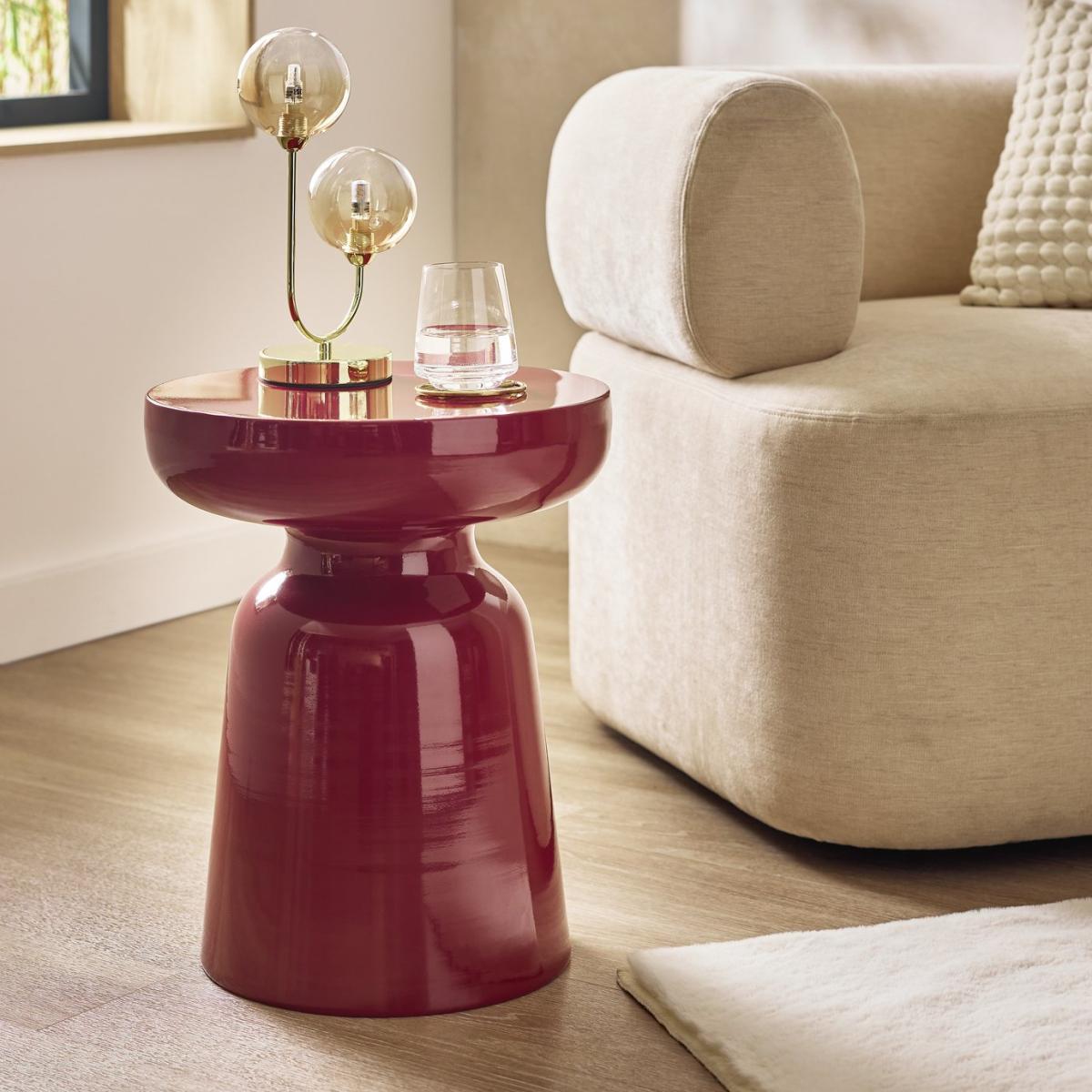 I love the vibrant pomegranate colour of this side table - it adds a lively pop of colour to any interior. It's versatile enough to work well in both contemporary and eclectic spaces, providing a striking focal point or complementing softer, neutral palettes. Practical styling tips include using it as a stand for statement lamps, small plants, or decorative objects to emphasise its colour. Its sturdy shape makes it ideal for placing beside a sofa or armchair, and it’s durable enough for everyday use. Pairing it with minimalist accessories allows the colour to really stand out, while mixing it with patterned textiles can create a playful, layered look.