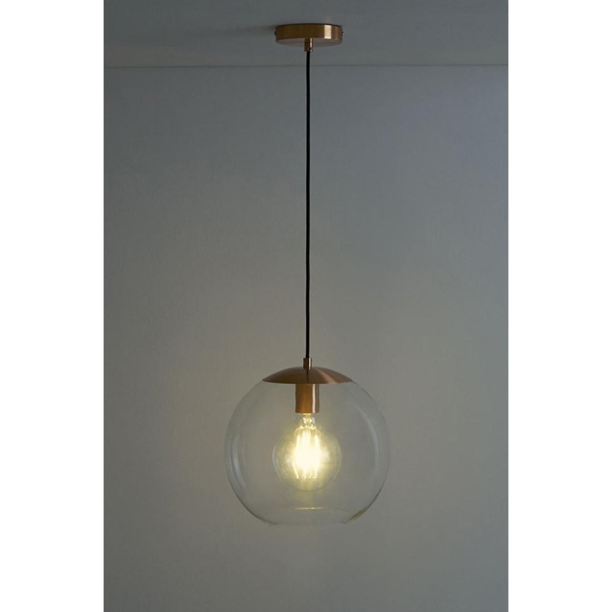 I love this pendant light for its clean, modern aesthetic combined with the warm copper finish, which adds a touch of richness without feeling heavy. Its simple design makes it versatile, working well in both contemporary and transitional interiors. It’s particularly great over kitchen islands, dining tables, or in a living space where you want a statement piece that doesn’t overpower. For styling, consider pairing it with matte or textured finishes to enhance the copper detail or hang a filament bulb for an industrial edge. Keep the surroundings minimalist to really let the glass and copper shine, or add complementary accents in warm tones to create a cohesive look.