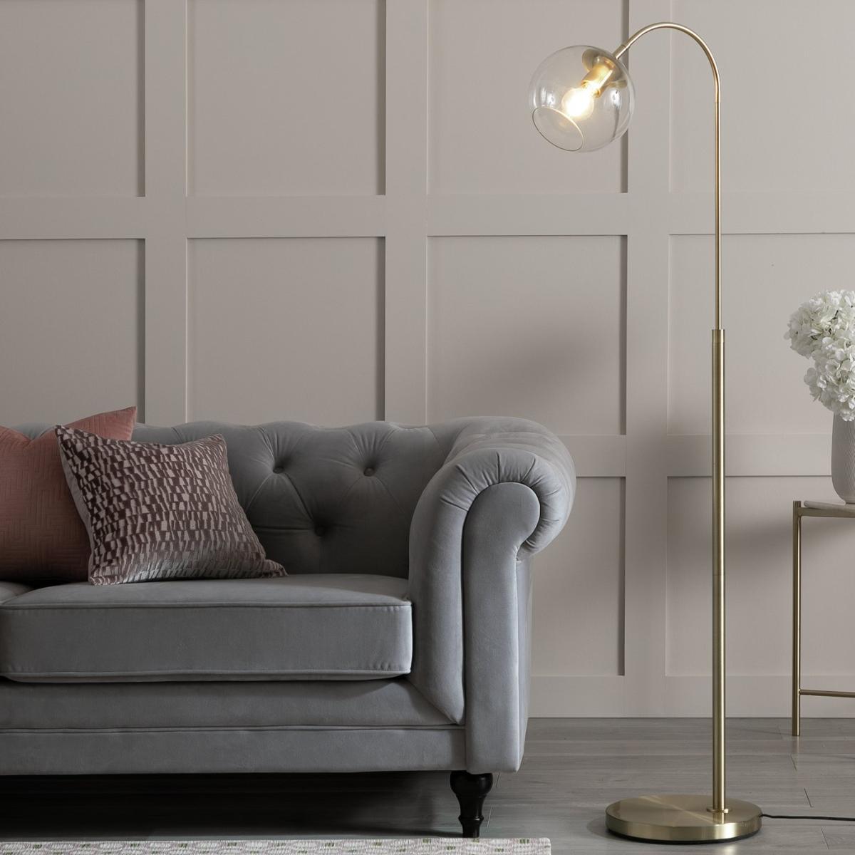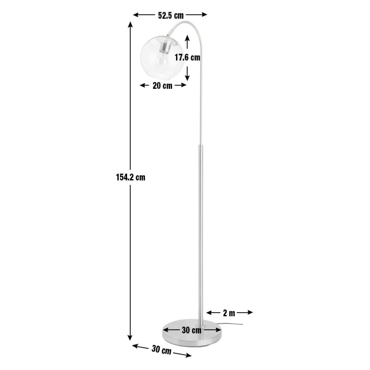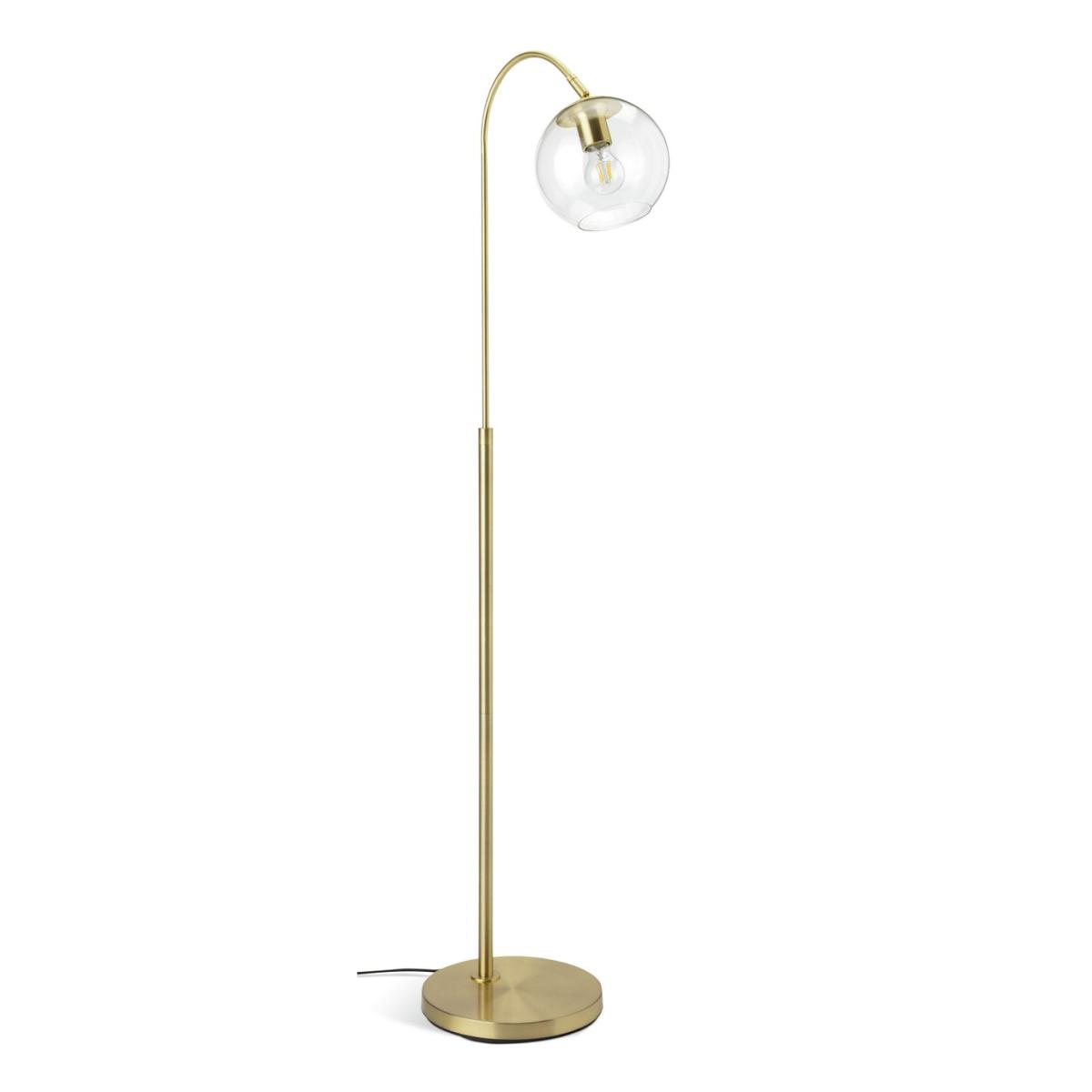 Own the room with this simple yet striking floor lamp. The rounded clear glass bowl together with the contemporary brass base successfully combines modern minimalism with a comfortably retro warmth. Complete the look with a filament bulb for an extra touch of ta dah! Dimensions: Size H154.2, W52.5, D30cm. Diameter of base 30cm. Shade size H17.6, D20cm. Cord length 2m. Bulb Information: Bulb required 1 x globe E27 edison screw LED (not included). 10 watts. (bulb not included). Adjustable head. General Information: Shade material: glass. Base material: metal. In-line switch. IP 20 -. Self-assembly. Product is mains powered plug in. This lighting product is a class 2 fitting. Weight 5.78kg. Manufacturer's 1 year guarantee.