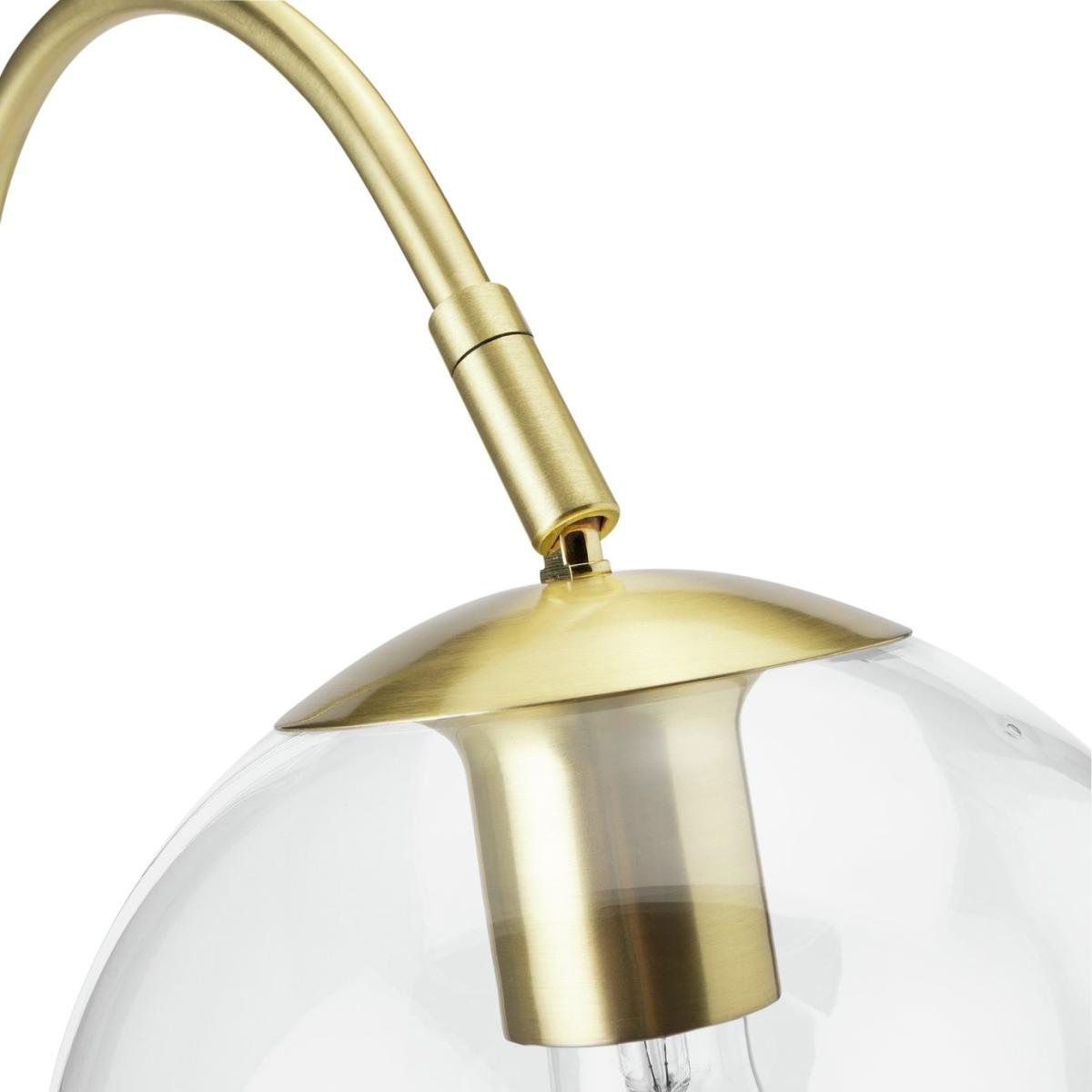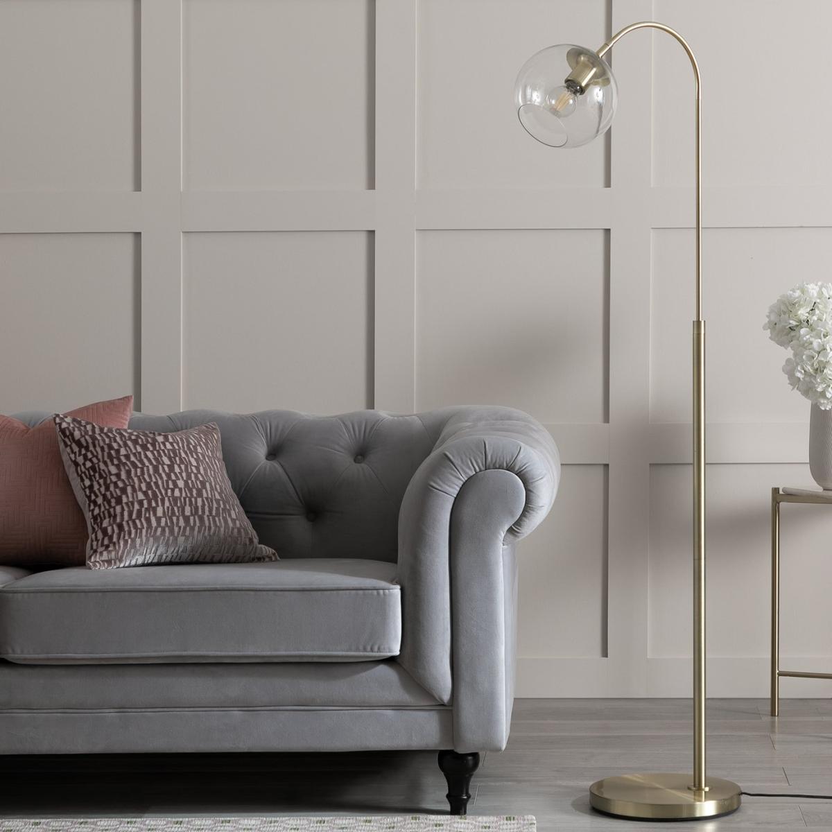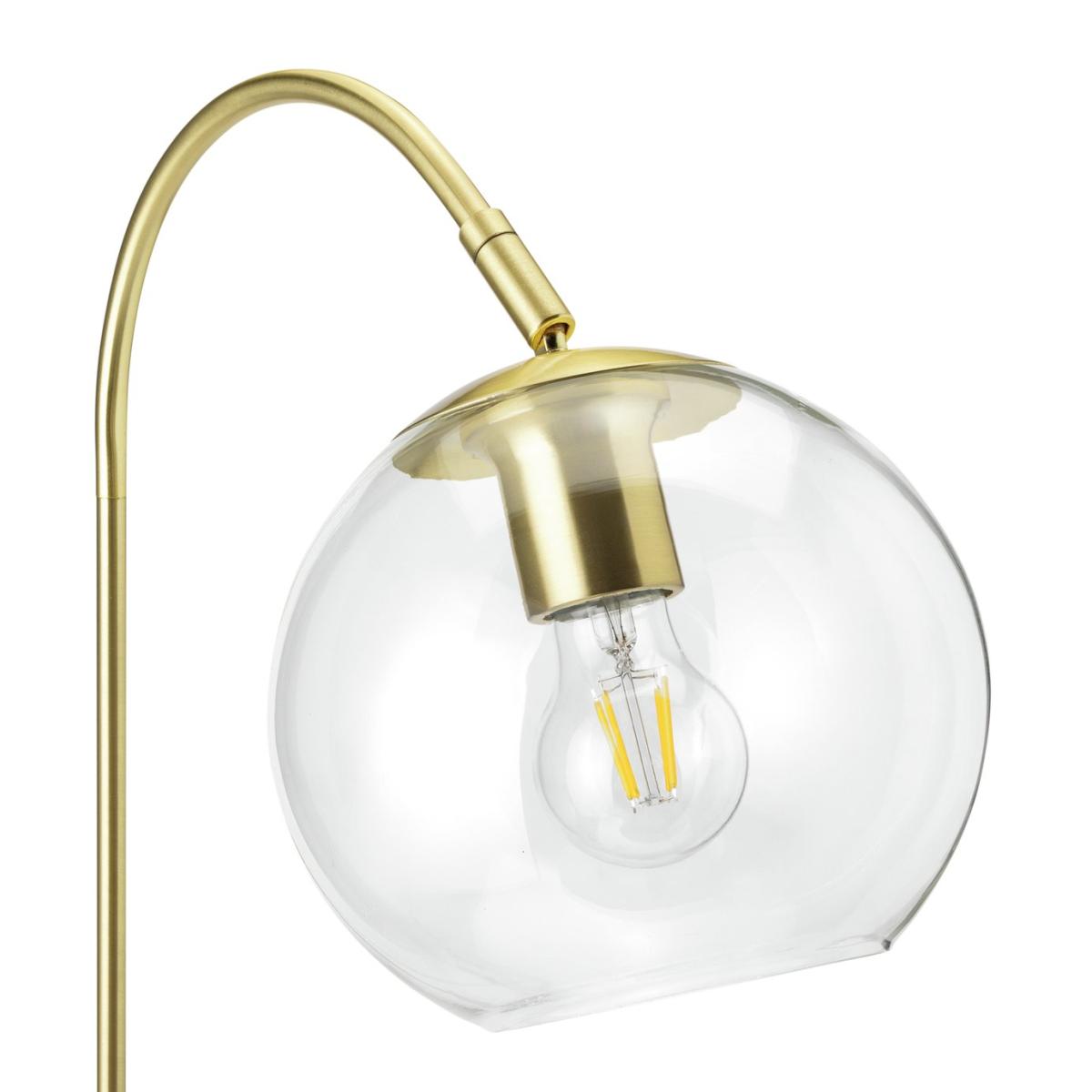 Own the room with this simple yet striking floor lamp. The rounded clear glass bowl together with the contemporary brass base successfully combines modern minimalism with a comfortably retro warmth. Complete the look with a filament bulb for an extra touch of ta dah! Dimensions: Size H154.2, W52.5, D30cm. Diameter of base 30cm. Shade size H17.6, D20cm. Cord length 2m. Bulb Information: Bulb required 1 x globe E27 edison screw LED (not included). 10 watts. (bulb not included). Adjustable head. General Information: Shade material: glass. Base material: metal. In-line switch. IP 20 -. Self-assembly. Product is mains powered plug in. This lighting product is a class 2 fitting. Weight 5.78kg. Manufacturer's 1 year guarantee.