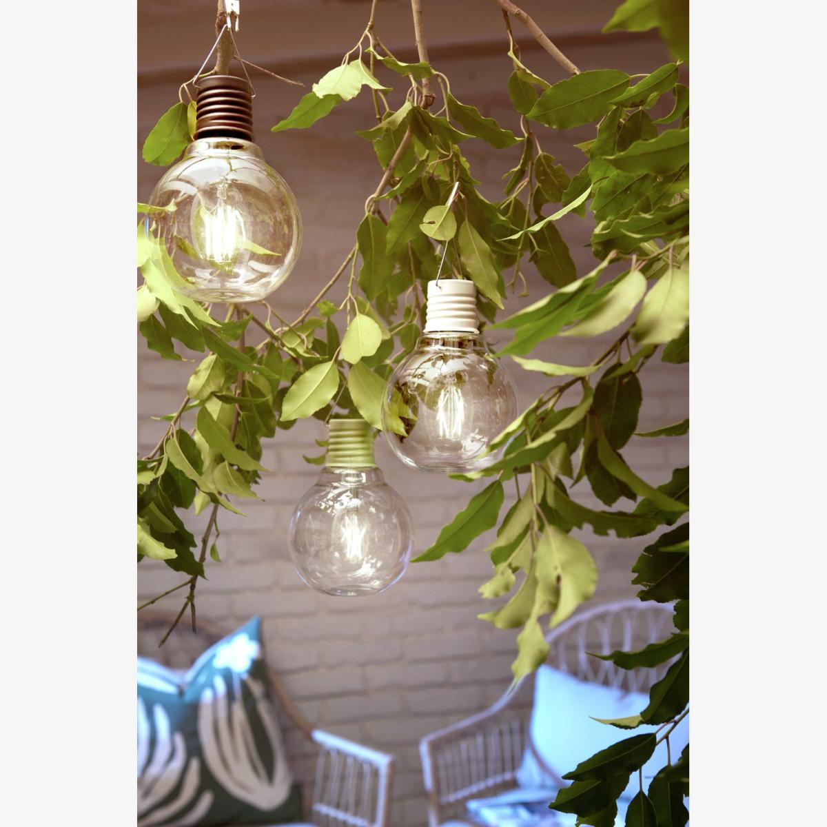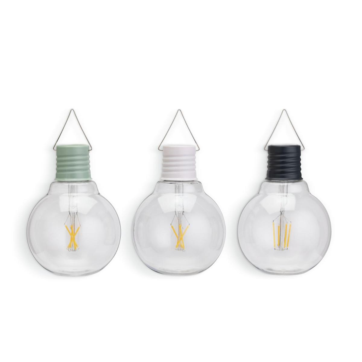 Warm white filament LED per light With the versatility to be hung pretty much anywhere in your garden, this 3 pack of Solar Lightbulbs are perfect for spreading some colour and light. Each lightbulb has a different vibrant block colour at the top, creating a cool and retro effect. By day, they look trendy and colourful, and by night, they add some sparkle to your garden. Solar powered. 3 lights included in the pack. Includes handle for hanging light. On and off switch. Automatically turns on at dusk. 6 hours run time if fully charged. 8 hours of full sun light required to fully charge battery. Battery is recharged via the solar panel. Requires 3 x rechargeable battery (included). Filament LED bulbs (included). Size: H16cm, W12cm, D12cm. Warm white light emitted. Suitable for outdoor use only. 1 year manufacturer's guarantee.