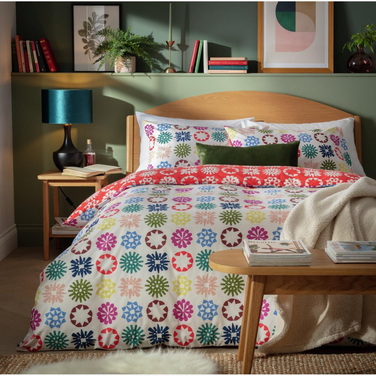 Slip into the festive spirit. Deck out your bed with this bright woven duvet set. The jolly snowflake pattern adds a perky pop of colour. And turn over to reveal the same seasonal print in vibrant red. Perfect to help keep you toasty through cold winter nights. Happy holidays. Cheers to a warm and cosy winter. Explore our thermal blackout blinds that help you have smooth, uninterrupted sleep. Finish: woven. 50% polyester , 50% cotton. 144 thread count. Set includes 1 duvet cover and 2 pillowcases. Bed size: king size. Length 220cm, Width 230cm. Reversible. Buttons for fastening. Standard pillowcase (s). Pillow case length 75cm, Width 50cm. Reversible pillowcase (s). Machine washable at 40 C. Suitable for tumble drying.