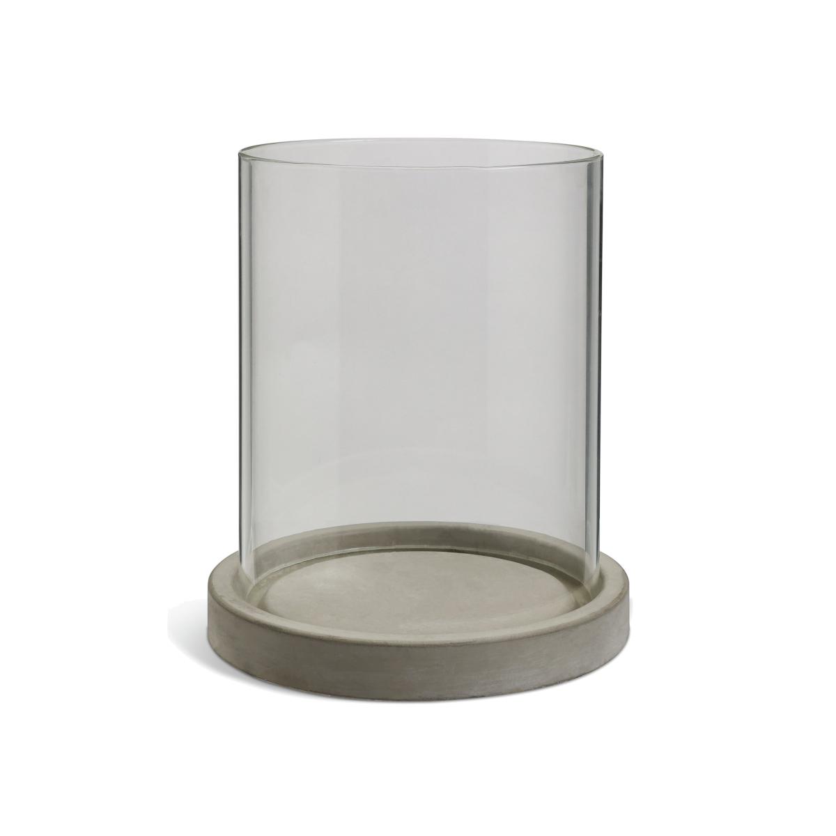 Sitting pretty. Our cylindrical glass candle holder on a grooved, concrete base comes complete with pillar candle. Beautifully simple with a protected, flickering flame it is contemporary and elegant. Very easy to theme the looks with some coloured glass pebbles for a special occasion. Alternatively, you could remove the candle and fill with twinkling LED lights. Never a dull moment with this one. Size H12.3, W5.8, D5.8cm. Diameter 5.8cm.
