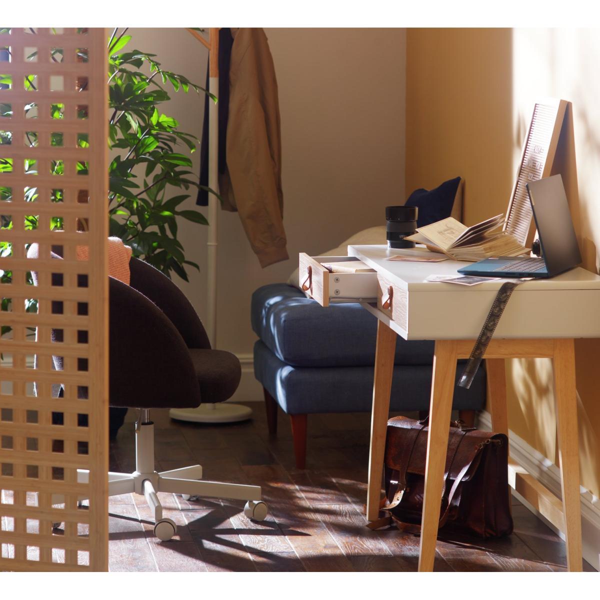 I love this little desk for its modern yet subtle Nordic aesthetic, making it versatile across various interiors. Its two-tone design adds visual interest without overwhelming a space, making it suitable for both minimalist and more eclectic settings. It works particularly well in smaller home offices or cosy nooks where pared-back furniture helps maximise space. For styling, consider keeping the surface clutter-free with essential organisers or a sleek lamp, and add a touch of greenery or colourful accessories to personalise it. The light wood tones also pair nicely with natural textiles and neutral palettes, creating a calm, inviting workspace.