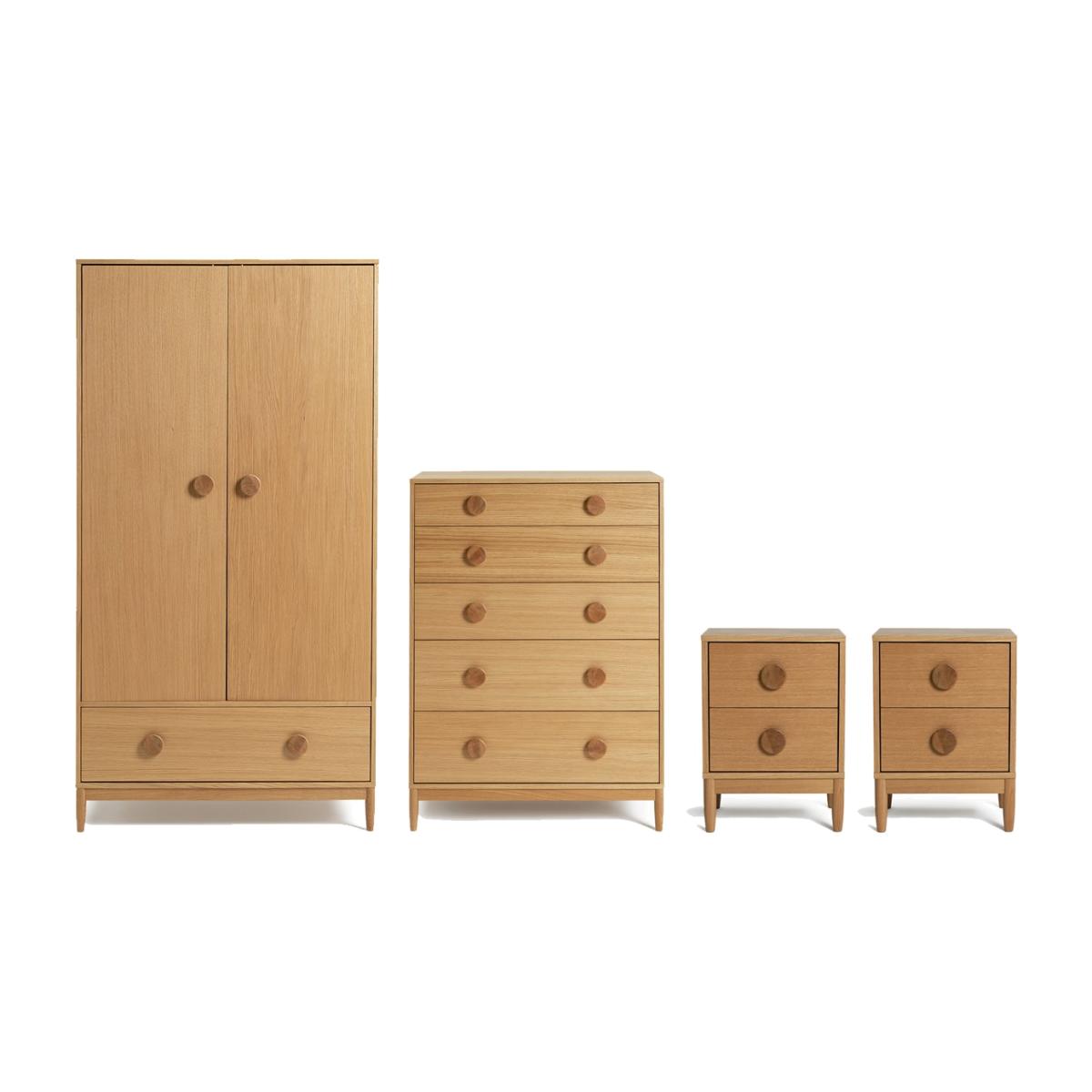 Cornelia's here to give your bedroom a classic country style reboot. This 4-piece bedroom furniture set has a wonderfully rustic oak finish which shows off the natural grain. There's a double wardrobe with shelf and bottom drawer, a 5-drawer dresser and 2 bedside cabinets. And all 10 drawers glide open effortlessly on metal runners. With good wood looks and big button handles Cornelia brings a warm, welcoming feel to a bedroom. Part of the Cornelia collection. Wardrobe: Size H190, W100, D62cm. Internal hanging space H136, W56.5, D96cm. 1 fixed hanging rail. Rail holds up to 40kg. Wardrobe has 2 doors and 1 drawer. Packed flat - requires 2 people (wall fixings included). Weight 83kg. Chest of drawers: Size H123.6, W90, D52cm. Internal drawer size H20, W81.2, D43.2cm. 5 drawers. Packed flat - requires 2 people (wall fixings included). Weight 62.5kg. Bedside table: Size H54, W39, D37cm. Internal drawer size H13.5, W30.2, D28.2cm. 2 drawers. Packed flat requires 1 person (wall fixings included). Weight 14kg. General information: Made from wood veneer. If this product is over 60cm high it must be securely attached to the wall to prevent overturning. FSC certified meaning the materials used for this product are responsibly sourced. Manufacturer's 1 year guarantee.