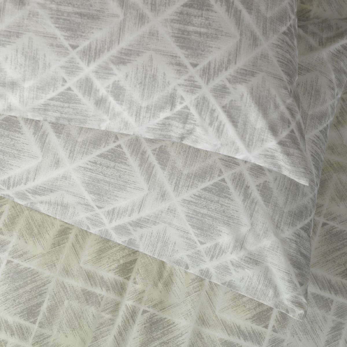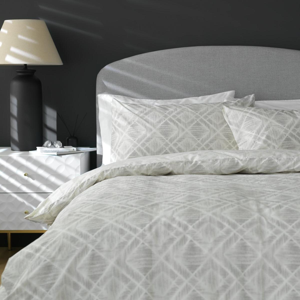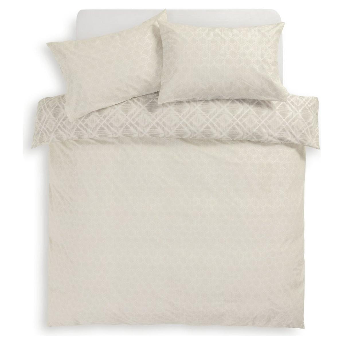 Go glam with our geo print bedding. Subtle and sophisticated, this elegant duvet set will bring a serene style to your space. Made from a 100% cotton, with a soft sheen, the laid-back pallet is ideal for a touch of luxe lounging. Fancy a change? Just flip over for a lighter colour combo. Slip in for a bit of refined relaxation. Match with sumptuous throws and padded cushions with chrome and mirrored accessories for a high-end hotel feel at home. This item carries the STANDARD 100 by OEKO-TEX logo, which means you can be certain that every component has been tested for harmful substances and is therefore harmless to human health. 100% cotton. 200 thread count. Set includes 1 duvet cover and 1 pillowcase. Bed size: single. Length 200cm, Width 135cm. Reversible. Buttons for fastening. Standard pillowcase (s). Pillow case length 75cm, Width 50cm. Reversible pillowcase (s). Machine washable. Suitable for tumble drying.