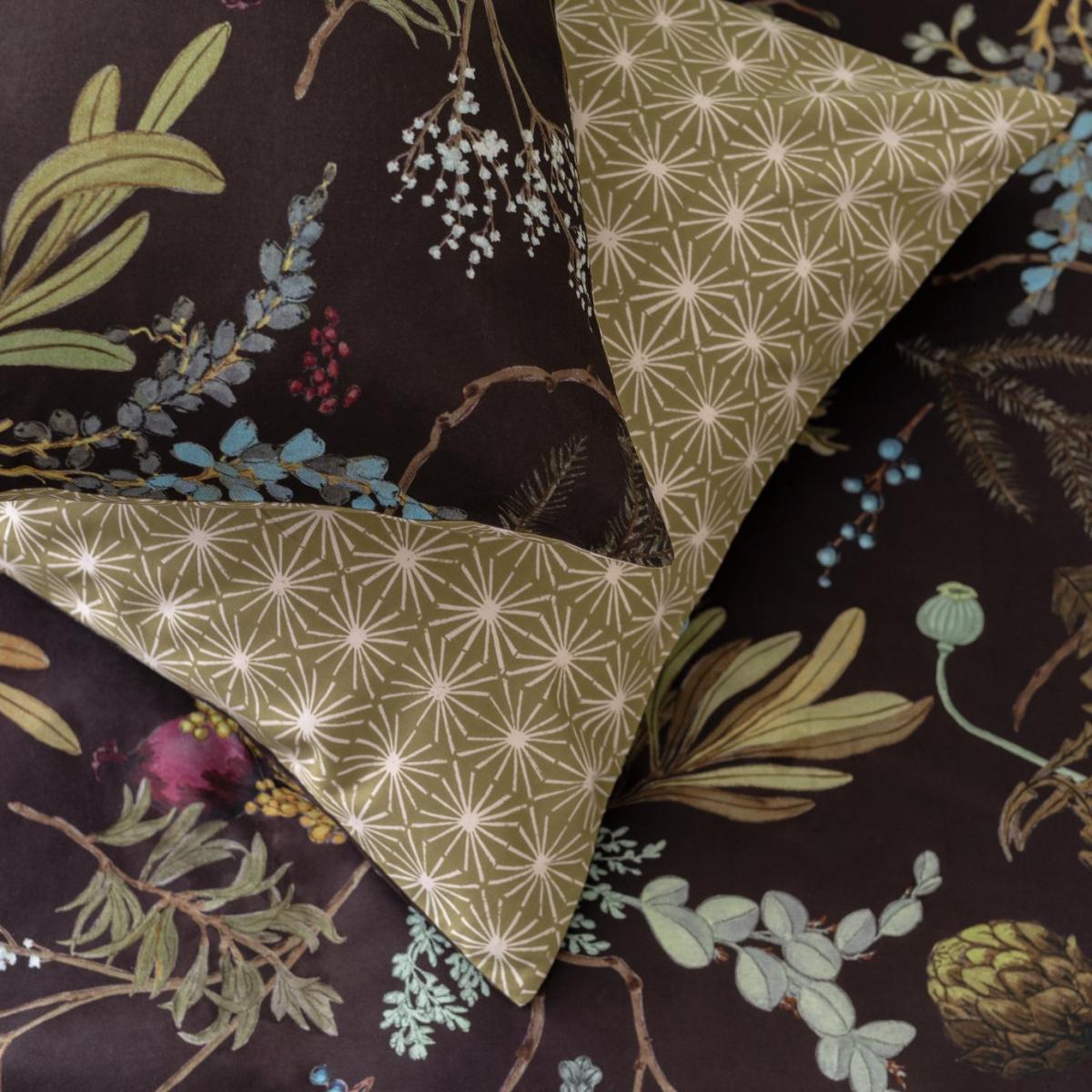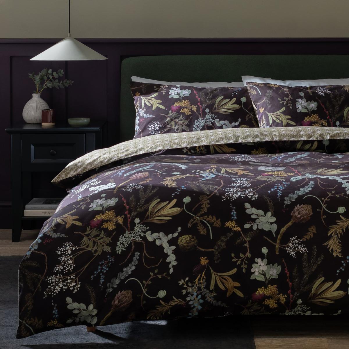 Sink into sheer opulence. Our cotton bedding set features intricate illustrations of winter botanicals in rich tones. Backed with a beautiful geometric design. Just turn down the duvet for contrast and flip over for a change. This item carries the STANDARD 100 by OEKO-TEX logo, which means you can be certain that every component has been tested for harmful substances and is therefore harmless to human health. Finish: percale. 100% cotton. 180 thread count. Set includes 1 duvet cover and 2 pillowcases. Bed size: double. Length 200cm, Width 200cm. Normal confection edging detail. Buttons for fastening. Standard pillowcase (s). Pillow case length 75cm, Width 50cm. Machine washable. Suitable for tumble drying.