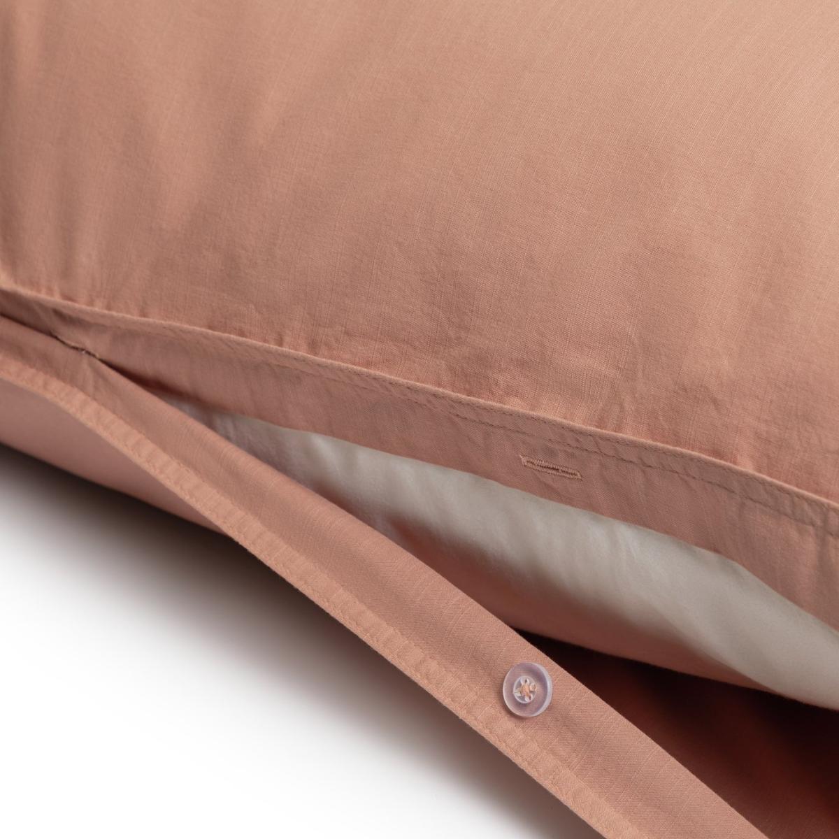 In a subdued cinnamon tone, our cotton bedding set is warm and inviting with the fresh look of linen. Perfect to slip into and curl up for a comfy night's sleep. This item carries the STANDARD 100 by OEKO-TEX logo, which means you can be certain that every component has been tested for harmful substances and is therefore harmless to human health. Finish: linen look. 100% cotton. 144 thread count. Set includes 1 duvet cover and 2 pillowcases. Bed size: double. Length 200cm, Width 200cm. Normal confection edging detail. Buttons for fastening. Standard pillowcase (s). Pillow case length 75cm, Width 50cm. Machine washable. Suitable for tumble drying.