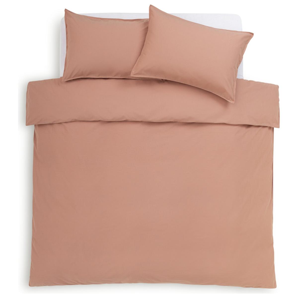 In a subdued cinnamon tone, our cotton bedding set is warm and inviting with the fresh look of linen. Perfect to slip into and curl up for a comfy night's sleep. This item carries the STANDARD 100 by OEKO-TEX logo, which means you can be certain that every component has been tested for harmful substances and is therefore harmless to human health. Finish: linen look. 100% cotton. 144 thread count. Set includes 1 duvet cover and 1 pillowcase. Bed size: single. Length 200cm, Width 135cm. Normal confection edging detail. Buttons for fastening. Standard pillowcase (s). Pillow case length 75cm, Width 50cm. Machine washable. Suitable for tumble drying.