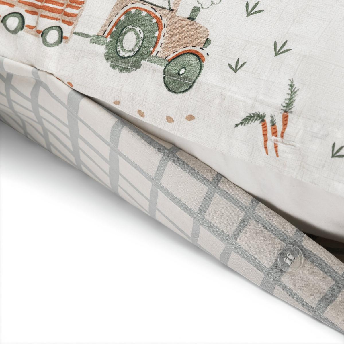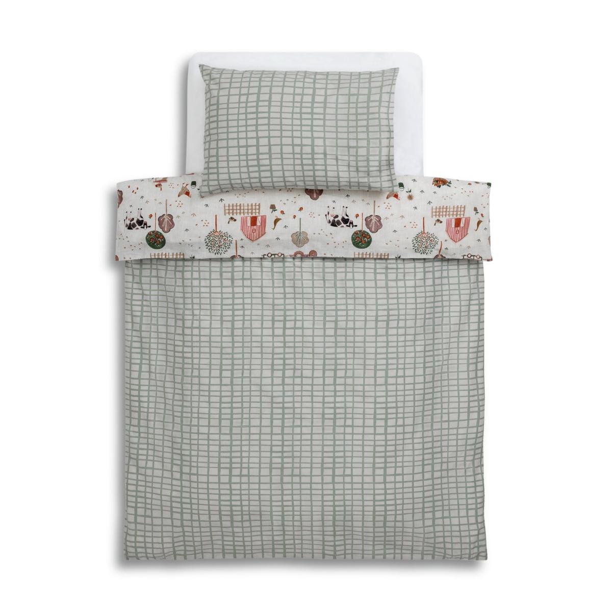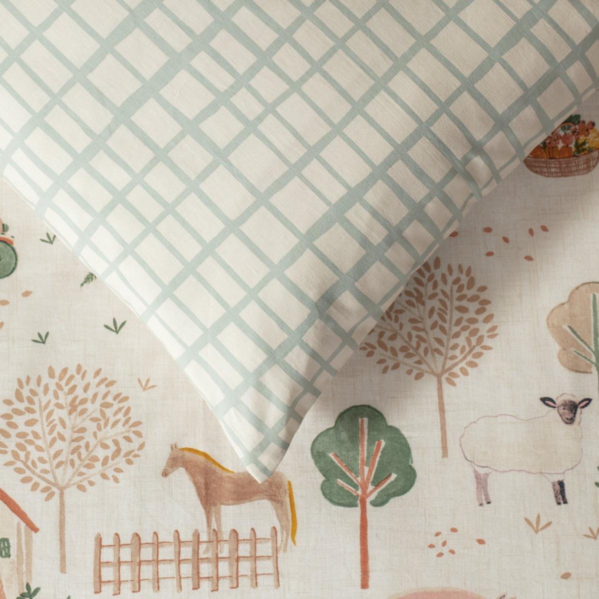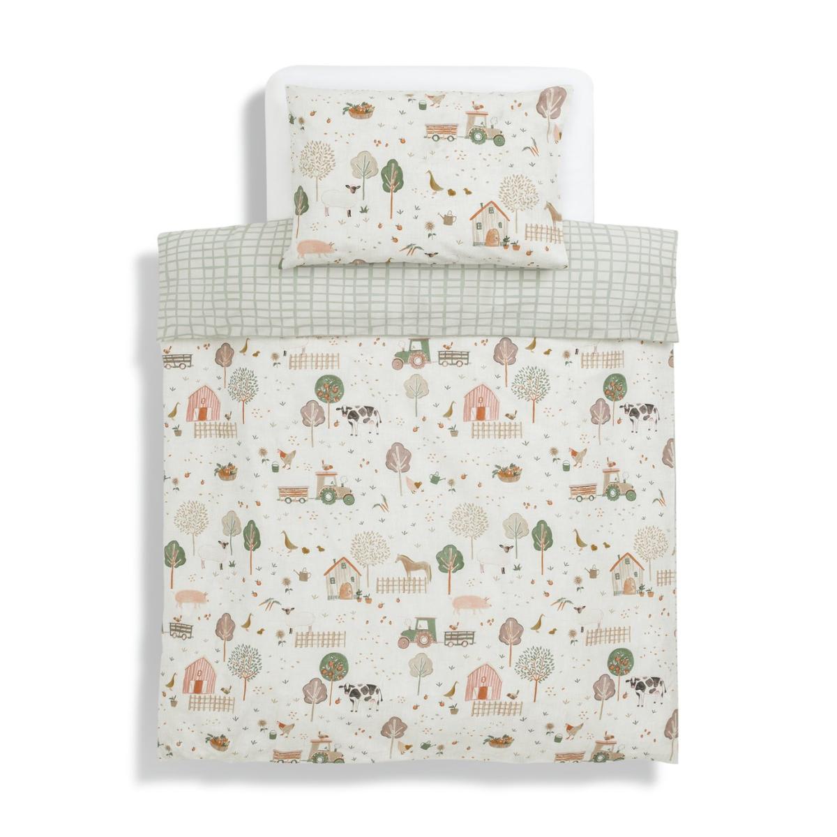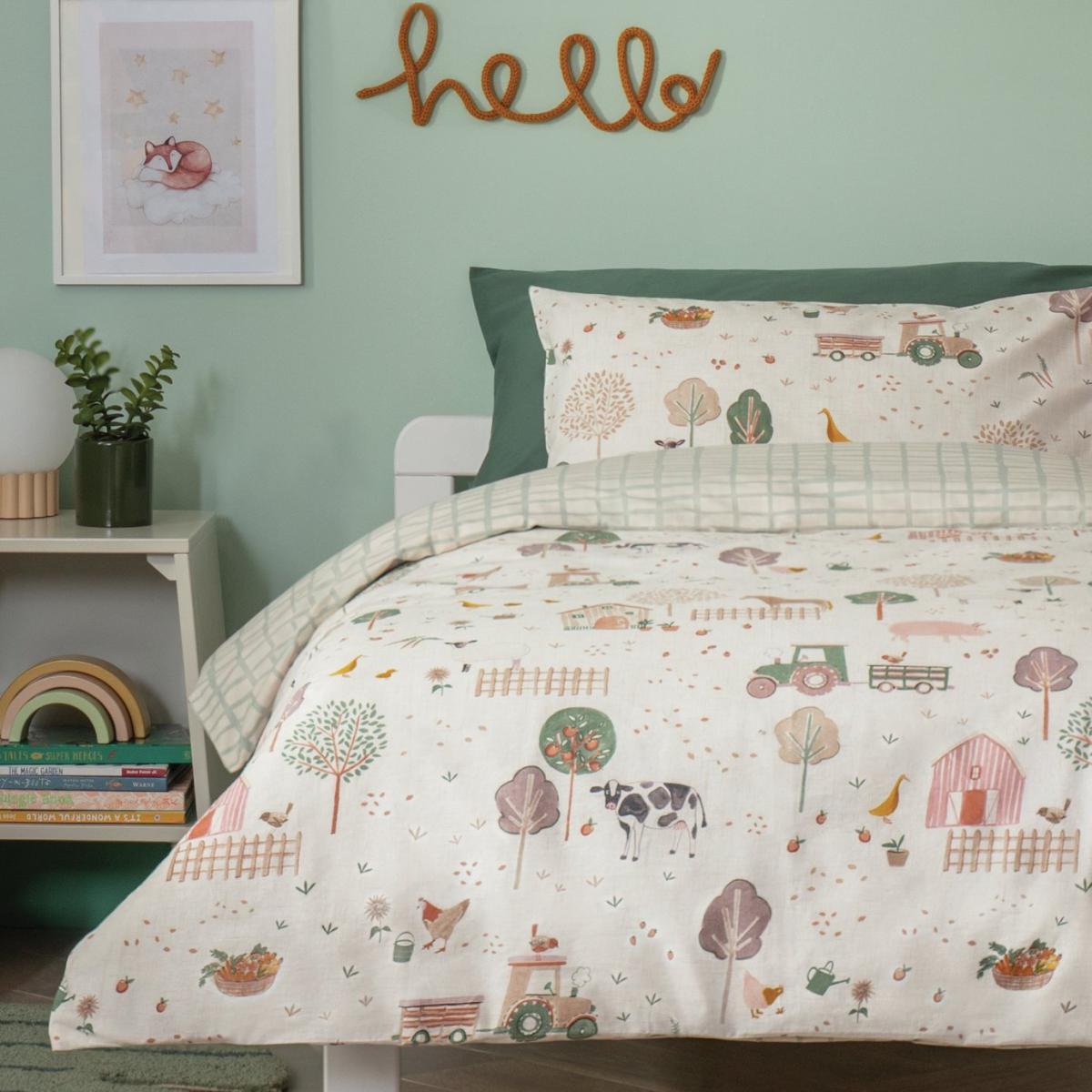 Reminiscent of the good things in life this toddler bed set has much to entertain. Quacking ducks, mooing cows, chugging tractors and fruit laden trees. Why not encourage a trip to the country in your toddler's dreams. It's sweet and soothing. And with a classic checked reverse, just switch the look when the mood takes you. This item carries the STANDARD 100 by OEKO-TEX logo, which means you can be certain that every component has been tested for harmful substances and is therefore harmless to human health. Set comprises of 1 duvet cover and 1 pillowcase. Brown. Size L150 x W120cm. Pillow case length 75cm, Width 50cm. Reversible pillowcase (s). Reversible. Machine washable. Suitable for tumble drying. 100% cotton. 144 thread count.