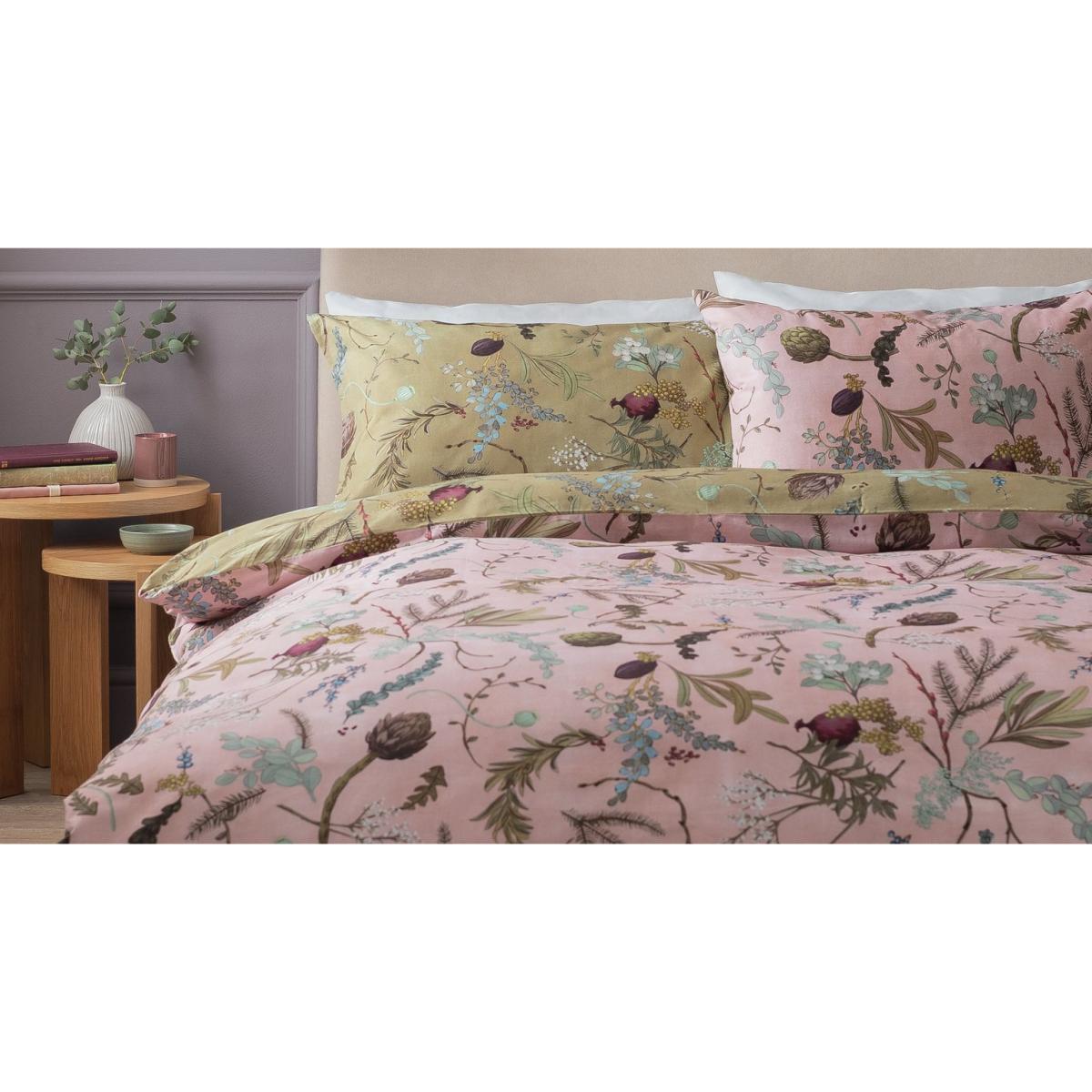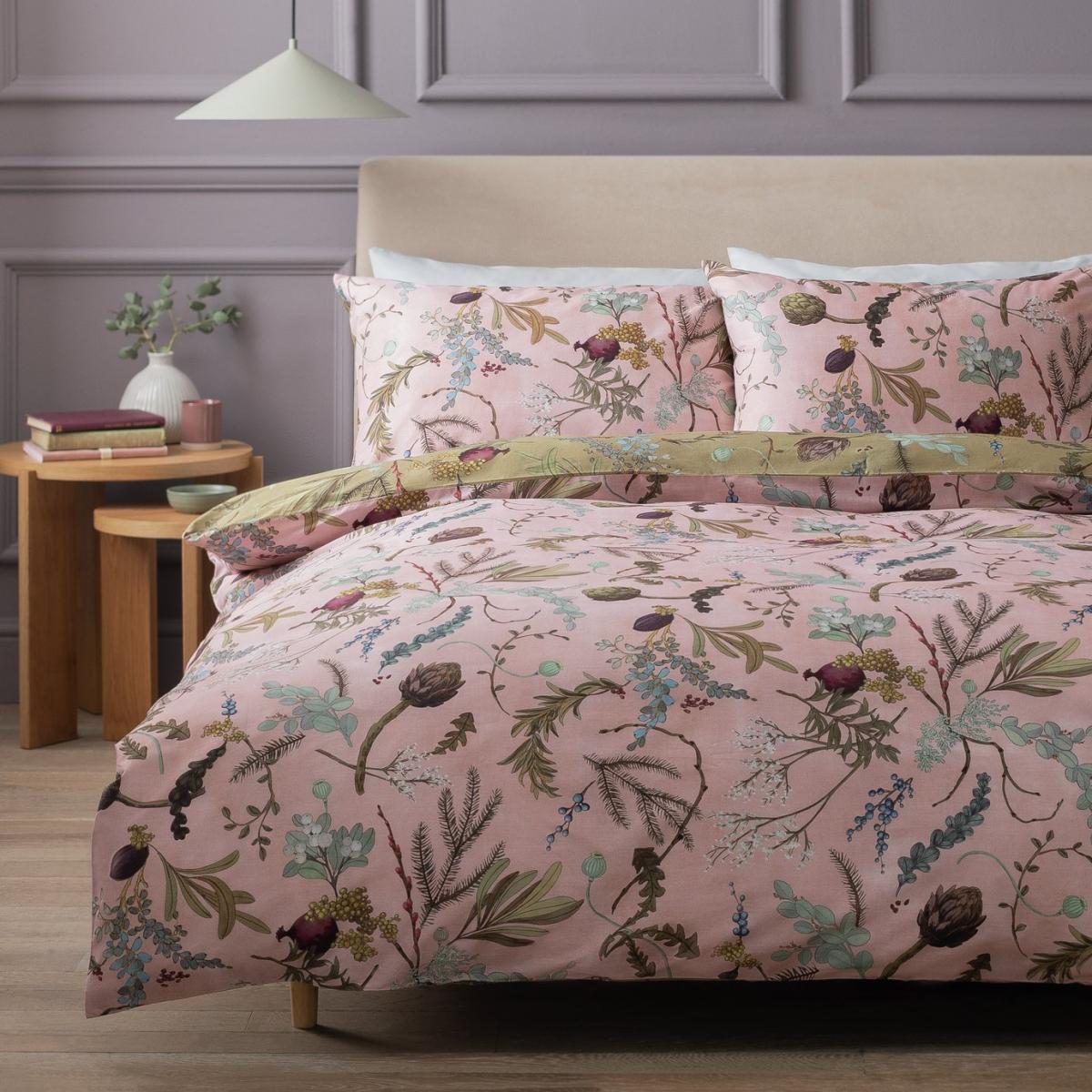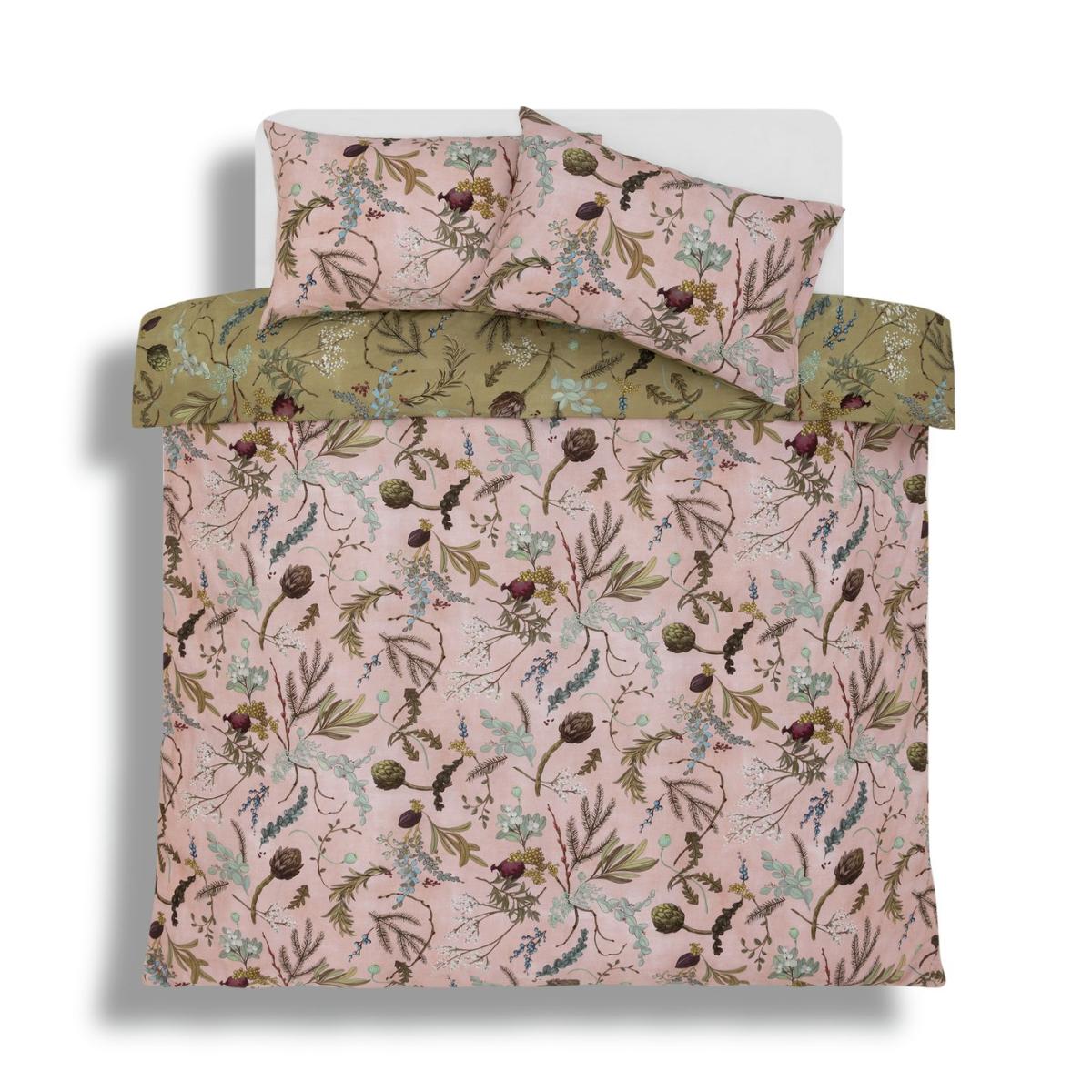 Our decadent bedding set is richly printed in winter botanicals. Inspired by the themes of William Morris to combine romantic glamour with country style. Generously designed with 2 colourways. Just turn down the duvet for contrast and flip over for a change. With a thread count of 180, it really is a fine and soft treat to slip into sleep with. This item carries the STANDARD 100 by OEKO-TEX logo, which means you can be certain that every component has been tested for harmful substances and is therefore harmless to human health. Finish: percale. 100% cotton. 180 thread count. Set includes 1 duvet cover and 2 pillowcases. Bed size: king size. Length 220cm, Width 230cm. Normal confection edging detail. Buttons for fastening. Standard pillowcase (s). Pillow case length 75cm, Width 50cm. Machine washable. Suitable for tumble drying.