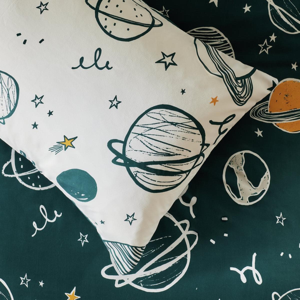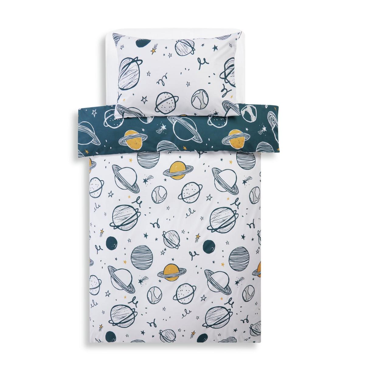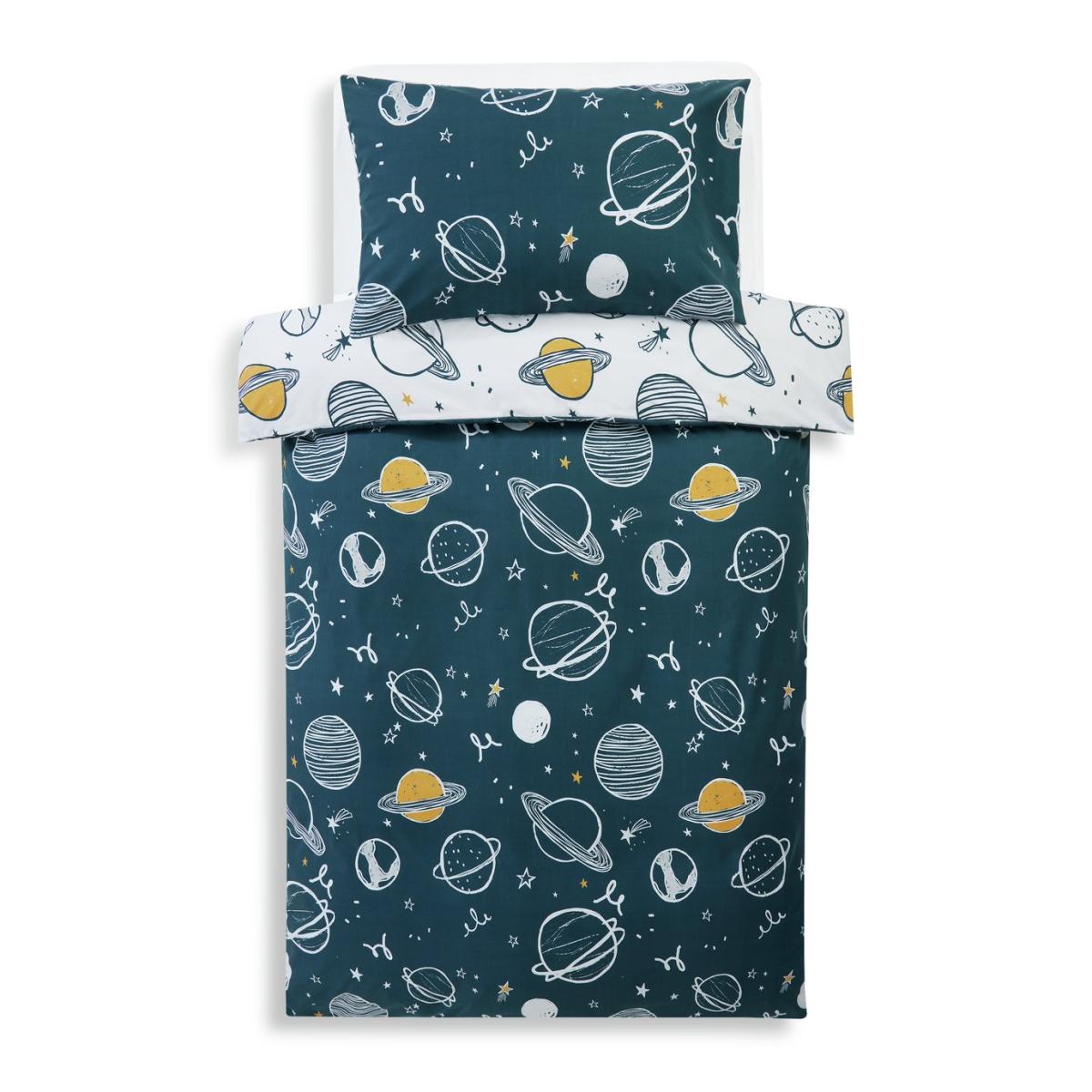 Any space loving little 'uns out there? Get ready to explore planet sleep with this big bold bedding set. The illustrative fun print looks out of this world against the deep blue background. And it's reversible. Simply show off its lighter side by flipping it over. Made from a 100% cotton so you know it's comfortably soft. What a bedtime blast. This item carries the STANDARD 100 by OEKO-TEX logo, which means you can be certain that every component has been tested for harmful substances and is therefore harmless to human health. Set comprises of 1 duvet cover and 1 pillowcase. Blue Planets pattern. Finish: percale. Size L200 x W135cm. Pillow case length 75cm, Width 50cm. Standard pillowcase (s). Reversible pillowcase (s). Reversible. Buttons for fastening. Machine washable at 40 C. Suitable for tumble drying. 100% cotton. percale.