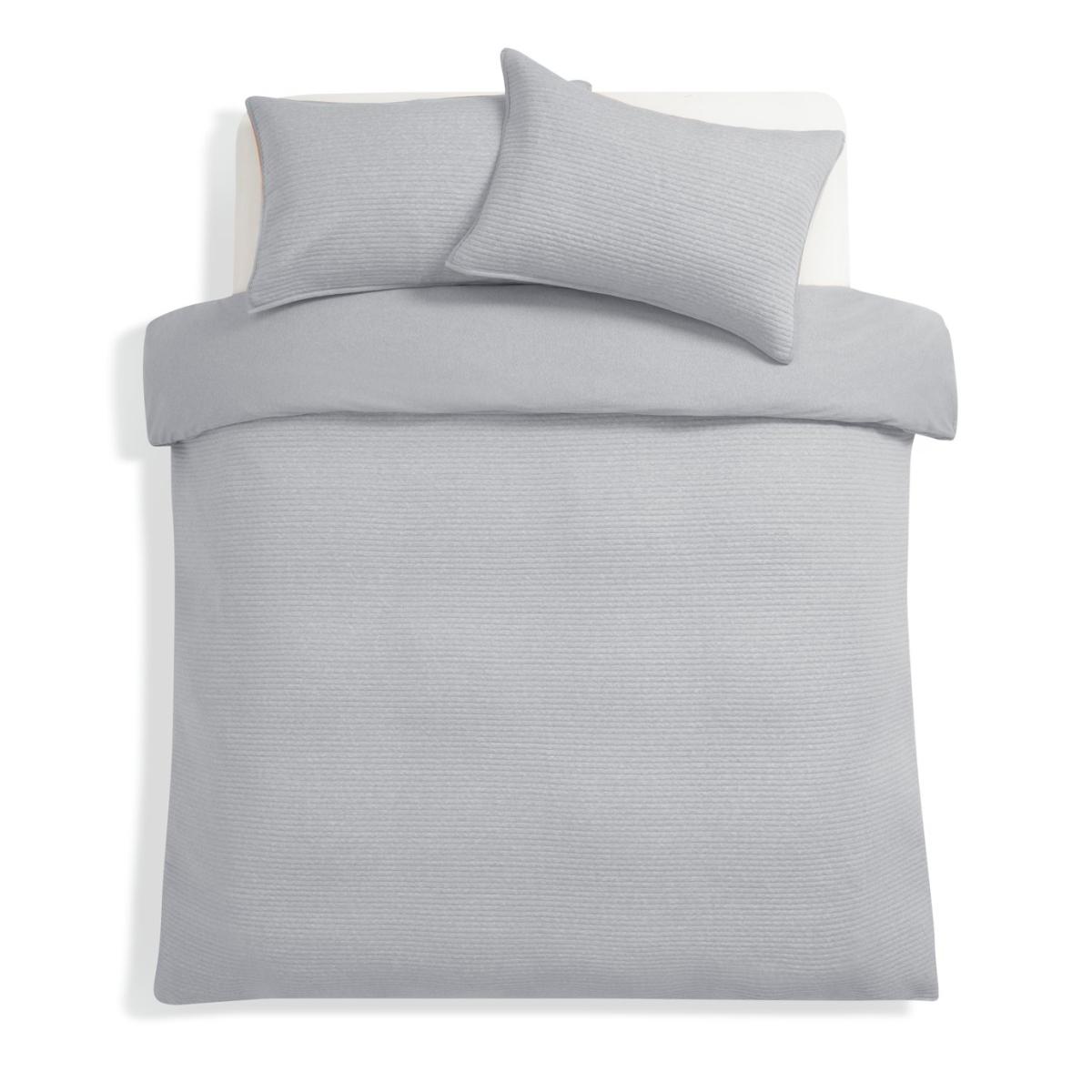 This textured 100% cotton bedding set is the perfect way to switch up your style. In a soothing shade, and comfortingly quilted, it'll brighten up any bedroom. Slip into soft Jersey bedding. Snuggly and comforting. Outer fabric 100% Cotton, filling 100% polyester. This item carries the STANDARD 100 by OEKO-TEX logo, which means you can be certain that every component has been tested for harmful substances and is therefore harmless to human health. Finish: quilted. 100% cotton. Set includes 1 duvet cover and 2 pillowcases. Bed size: double. Length 200cm, Width 200cm. Normal confection edging detail. Reversible. Buttons for fastening. Standard pillowcase (s). Pillow case length 75cm, Width 50cm. Machine washable at 40 C. Suitable for tumble drying.