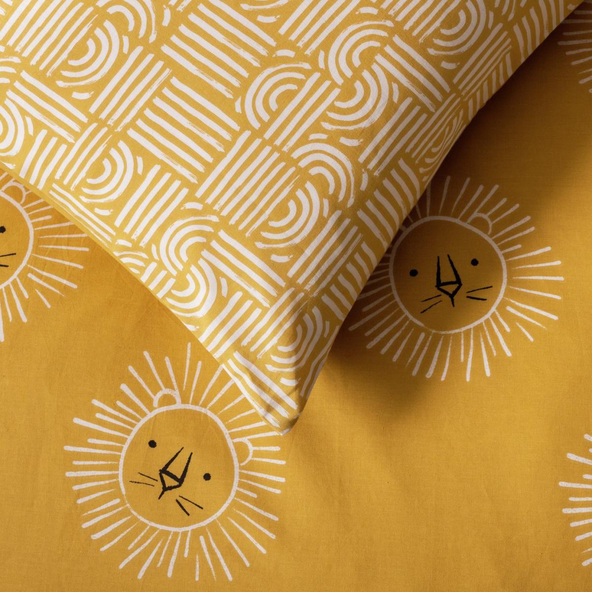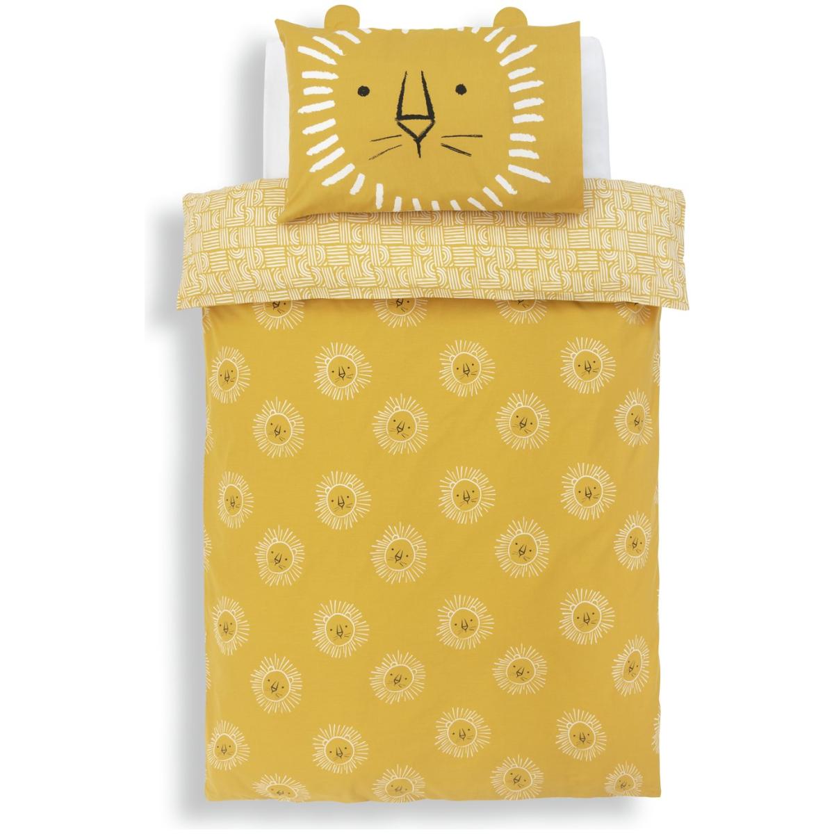 Is this the king of the duvets? In sunshine yellow our safari design bedding set is one for little adventurers. The pillowcase has a big fun lion face complete with sticky up ears. And the duvet cover is reversible with a geo pattern on the other side. Made from 100% cotton. We've lots of ways to style a youngster's room to make it their own special sanctuary. Take a look. This item carries the STANDARD 100 by OEKO-TEX logo, which means you can be certain that every component has been tested for harmful substances and is therefore harmless to human health. Set comprises of 1 duvet cover and 1 pillowcase. Yellow. Size L150 x W120cm. Pillow case length 75cm, Width 50cm. Reversible pillowcase (s). Reversible. Machine washable. Suitable for tumble drying. 100% cotton. 144 thread count.