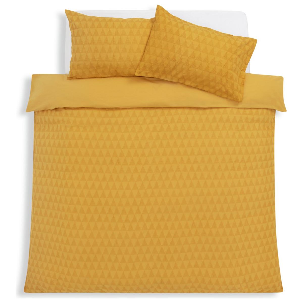 When you fancy a hot new look for your bedroom, dive into this rich mustard bedding set. Made from pure cotton it has a standout waffle geo design. On the underside it's all snuggly smooth. An easy way to quick, sleek hotel chic. This item carries the STANDARD 100 by OEKO-TEX logo, which means you can be certain that every component has been tested for harmful substances and is therefore harmless to human health. Finish: waffle. 100% cotton. Set includes 1 duvet cover and 2 pillowcases. Bed size: king size. Length 220cm, Width 230cm. Buttons for fastening. Standard pillowcase (s). Pillow case length 75cm, Width 50cm. Machine washable at 40 C. Suitable for tumble drying.