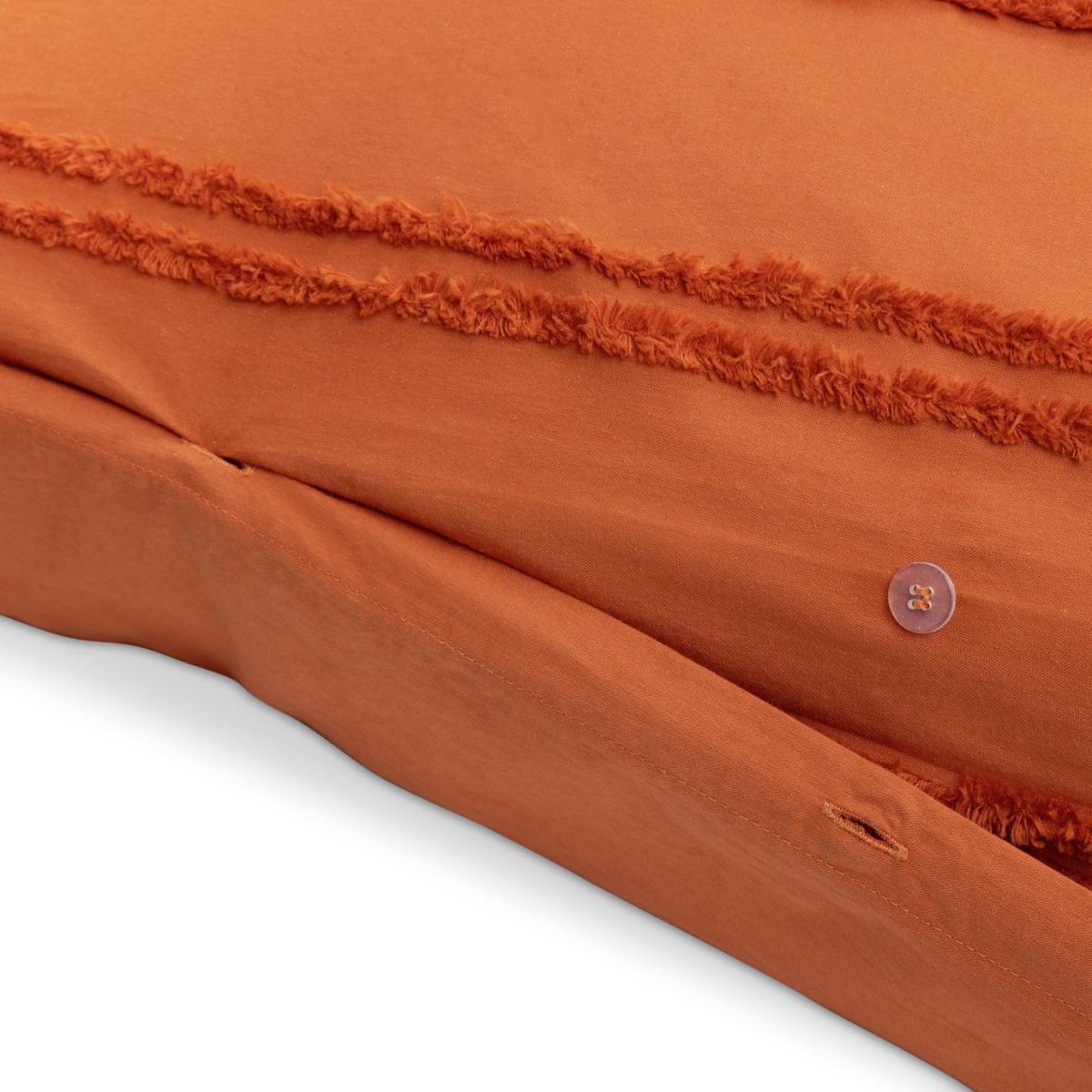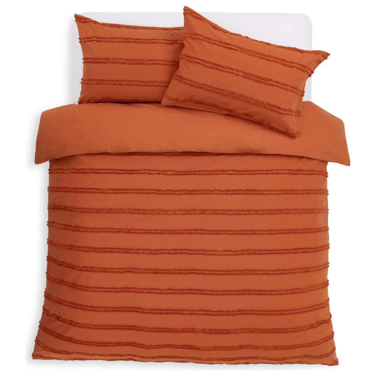 Embrace the boutique hotel luxe look. Dress your bed in our pure cotton, jewel hued duvet set. Bold and beautiful. The richness of the warm sunset orange is further enhanced by the tufted textured stripes. Contemporary, colourful and completely cosy. This item carries the STANDARD 100 by OEKO-TEX logo, which means you can be certain that every component has been tested for harmful substances and is therefore harmless to human health. Finish: tufted. 100% cotton. 144 thread count. Set includes 1 duvet cover and 1 pillowcase. Bed size: single. Length 200cm, Width 135cm. Buttons for fastening. Standard pillowcase (s). Pillow case length 75cm, Width 50cm. Machine washable at 40 C. Suitable for tumble drying.