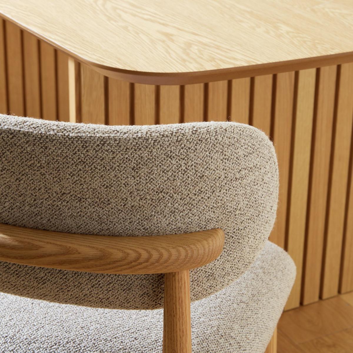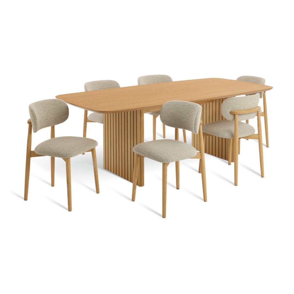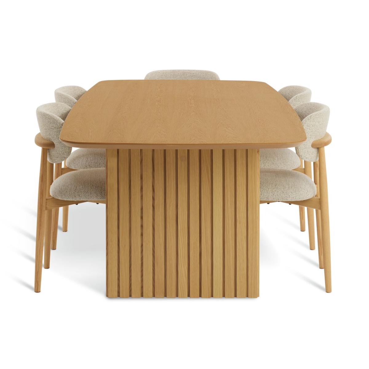 Sleek and slatted. Crafted from oak veneer, our Crishel table transforms everyday dining into something special. Two sculptural legs hold the design with confidence. Add 6 Arona chairs with gently curved backrests, padded seats and turned oak legs. Classic build with modern comfort all finished in a soft, natural tone. You're all set for long lunches and late night chats. Tuck in. Part of the Crishel collection. Table: Table size H75, W105, L220cm. Oak veneer table with oak veneer legs. Oak table top finish. Self-assembly - 2 people recommended. Chair: Includes 6 chairs. Size of each chair H80, W49, D51cm. Seat height 48cm. Oak frame with oak legs. Fabric seat pad. Self-assembly. Maximum user weight per chair 110kg. Individual chair weight 13.5kg. Package Dimensions: Table package 1 size H8, W230.5, D49.5cm. Table package 2 size H13, W76, D83.5cm. Individual chair package size H27, W65, D77.5cm. General information: Manufacturer's 1 year guarantee. Dust or wipe with a damp cloth only. By choosing FSC certified products, you are supporting responsible management of the world's forests.