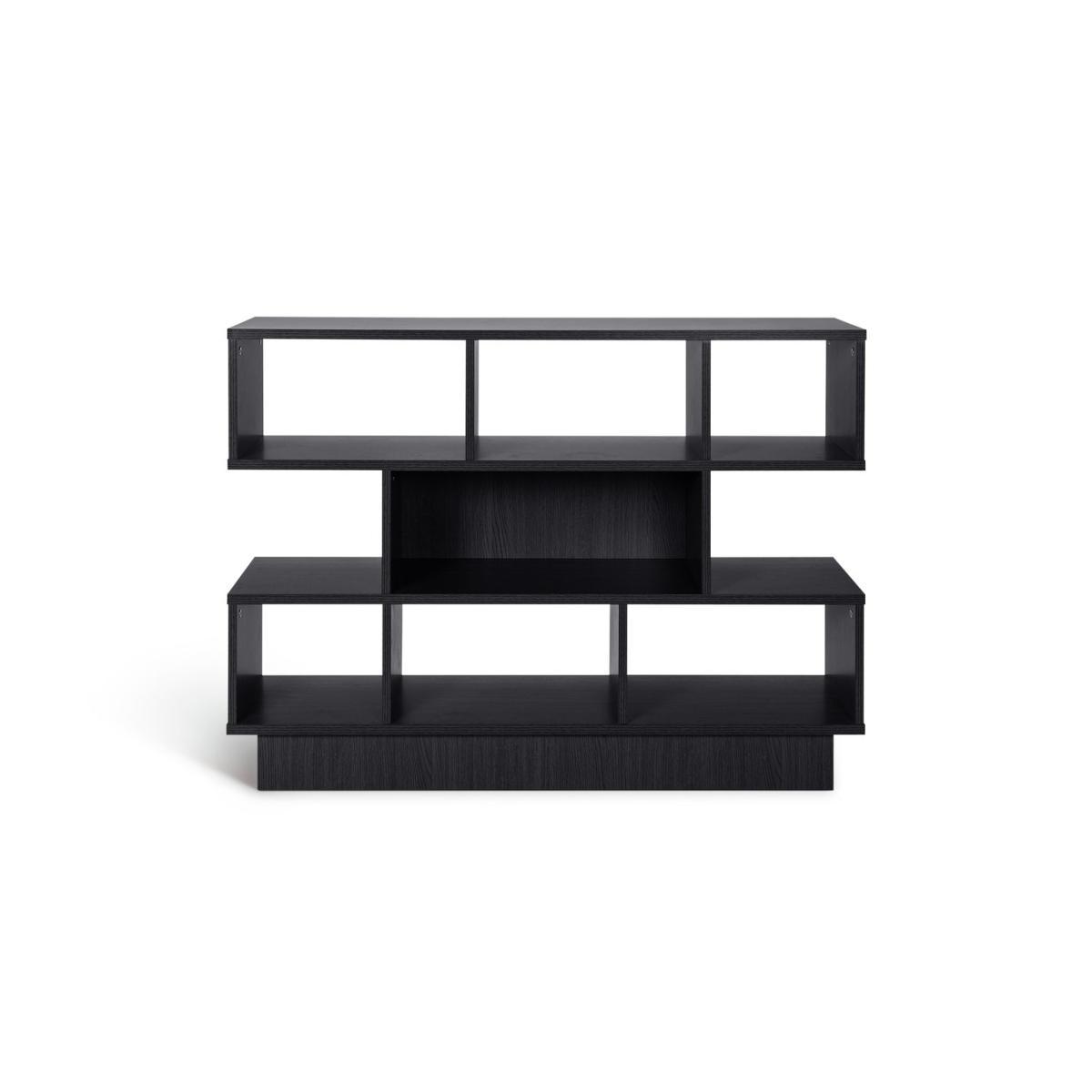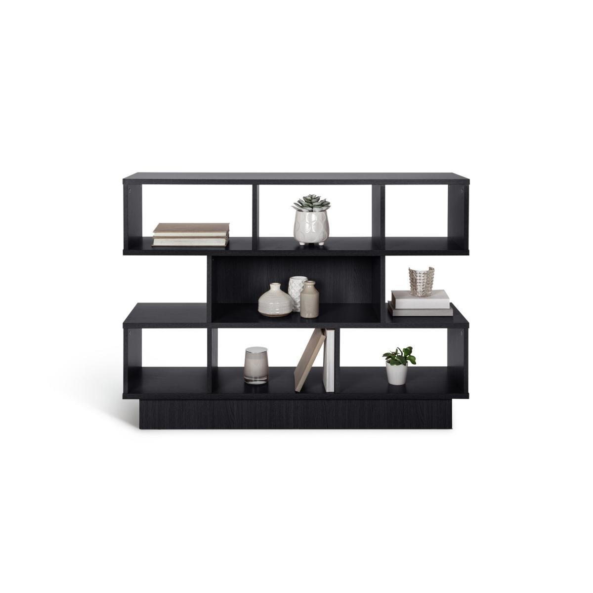 I really like this bookcase for its clean, contemporary look and versatility. The black finish makes it a great statement piece in modern or industrial interiors, but it can also work well in minimalist or monochrome schemes. Because of its wide, short design, it’s ideal for use as a room divider, media storage, or even a display shelf for decorative objects or plants. For styling tips, consider grouping books with objects of different heights and textures, or doubling up with baskets or boxes in the open sections for added organisation. Its size and shape also make it suitable for narrower spaces, so it’s quite functional while still maintaining a sleek, uncluttered feel.