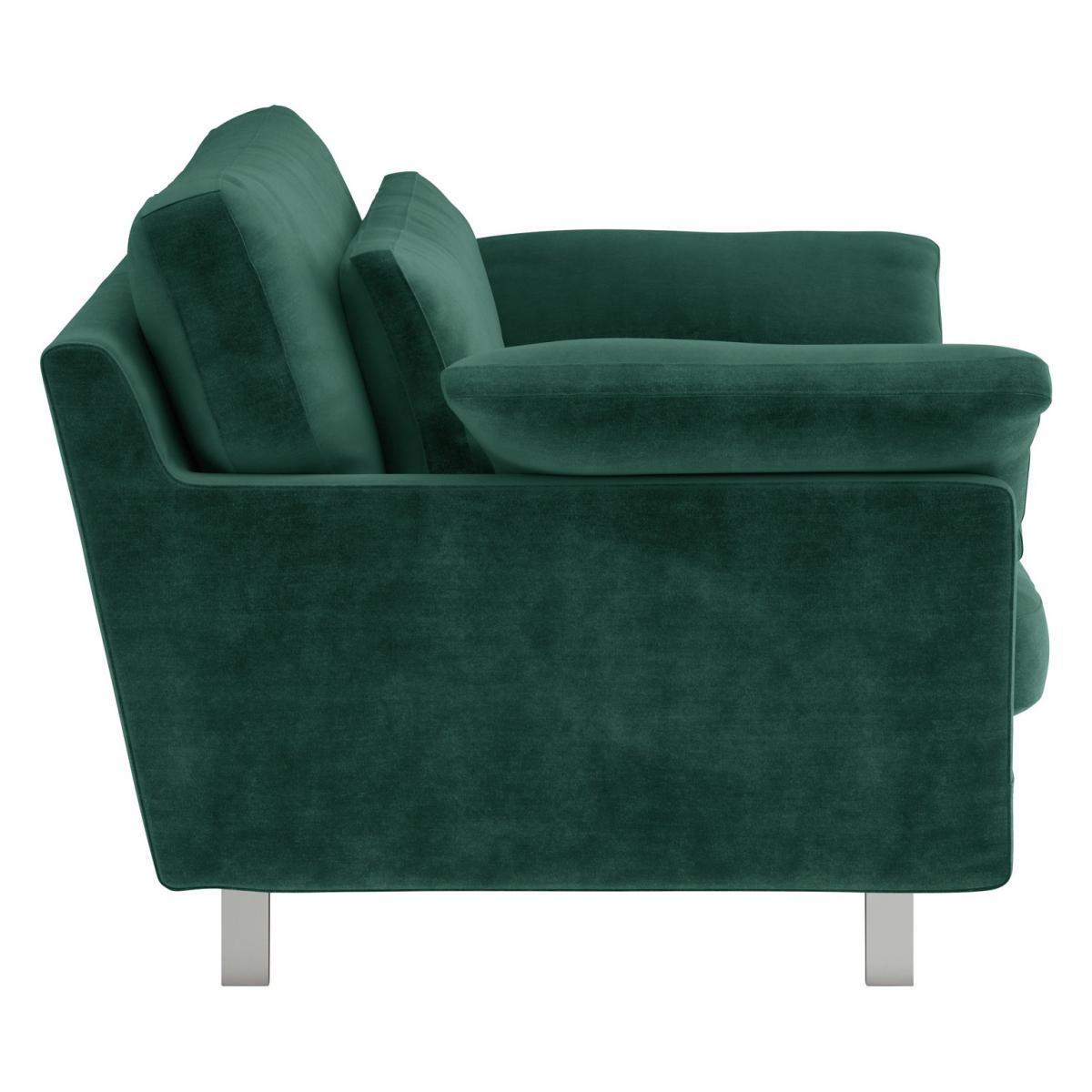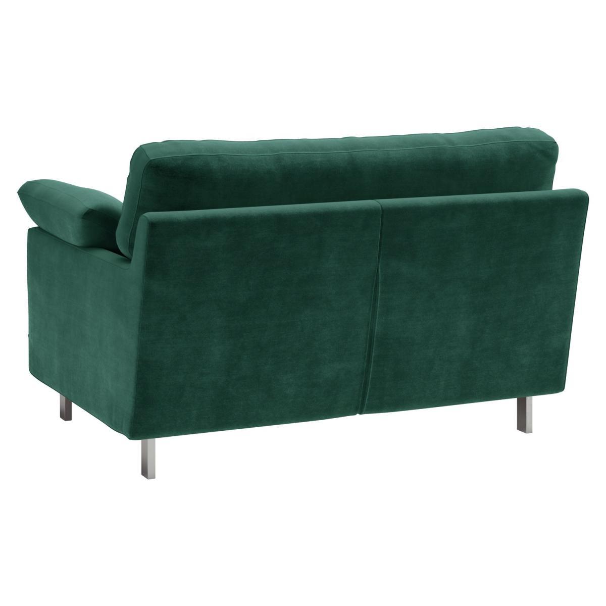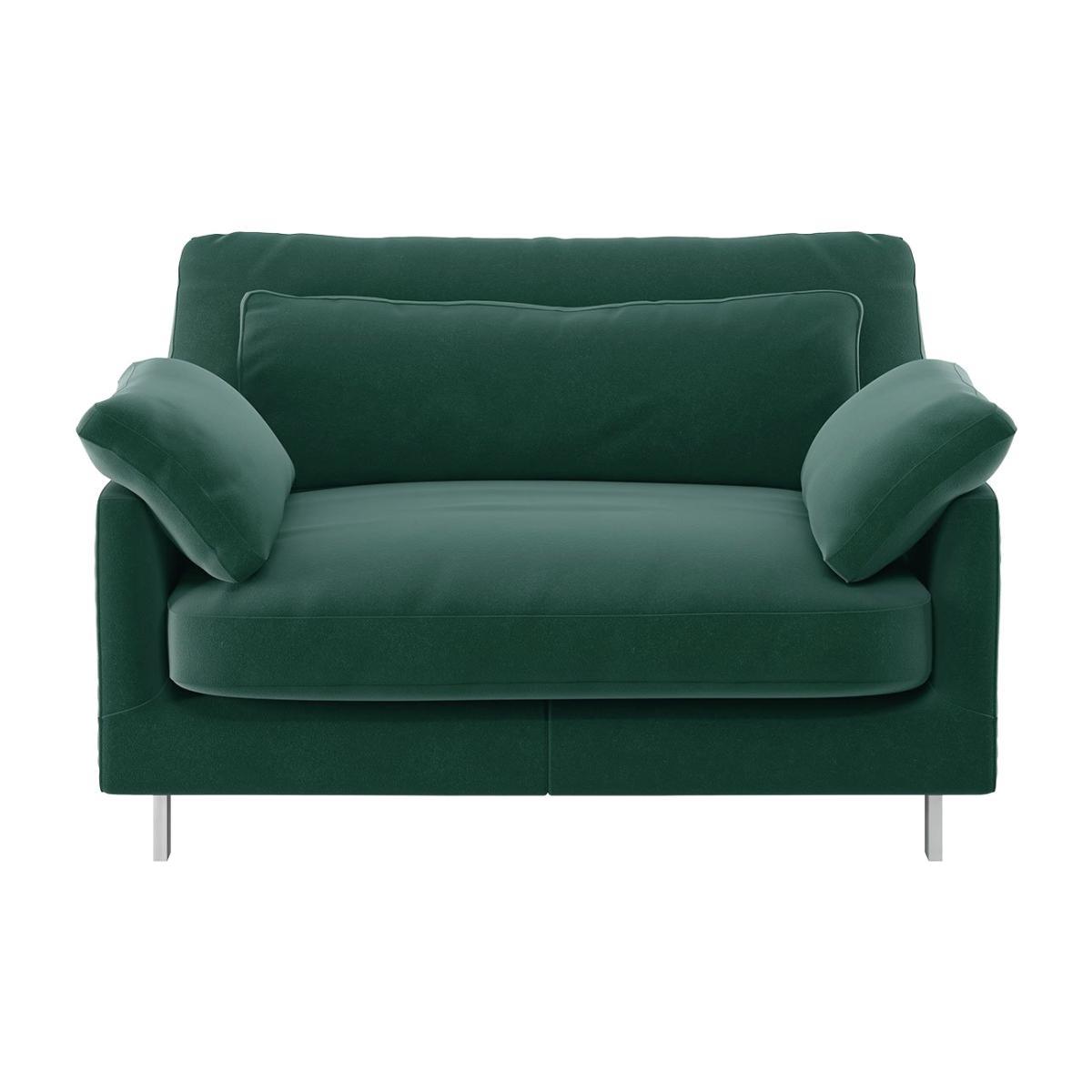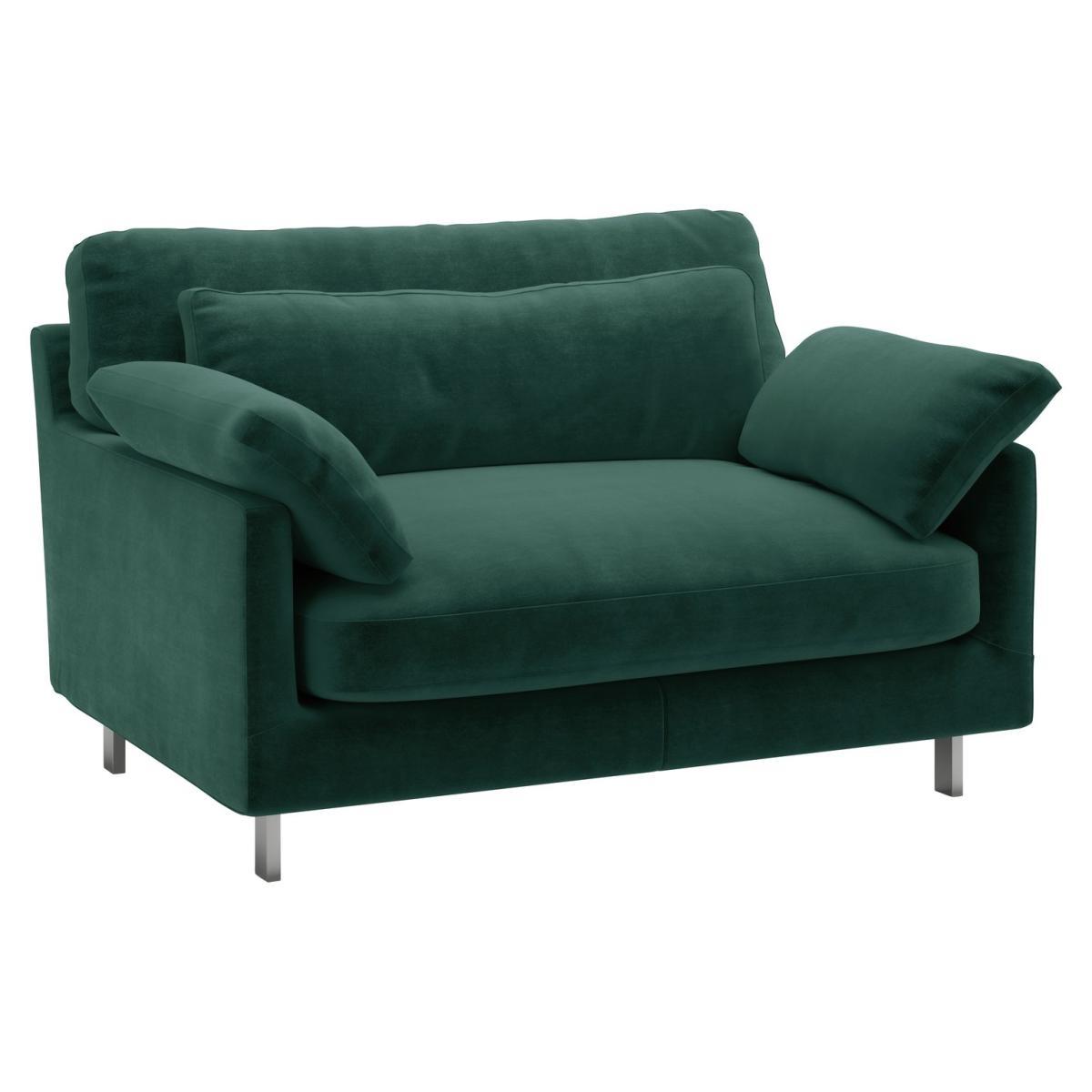 Made in Italy, the Cuscino emerald velvet compact sofa has soft, feather-filled scatter cushions for a supremely comfortable sit. With plump fibre and feather back cushions and foam and feather seat cushions, the sofa lives up to its name, while slender chrome legs keep it chic. Exclusive to Habitat, Cuscino combines luxurious design details with quality construction for everyday practical use and is available in a wide choice of fabrics, colours, sizes and configurations. Part of the Cuscino collection. Material:Made from 86% cotton and 14% modal. Metal feet. Removable seat with foam and fibre with feather topper filling. Removable cushion(s) with foam and fibre with feather topper filling. Dimensions: Size H79, W120, D99cm. Floor to seat height: 40cm. Depth of seat: 70cm. Height of seat back: 39cm. Height of arm rest: 50cm. Packaged dimensions:Package size H89, W120, D65cm. General information:Plump cushions regularly to maintain shape. Self-assembly - just add feet. Maximum individual user weight 120kg. Manufacturer's 1 year guarantee.