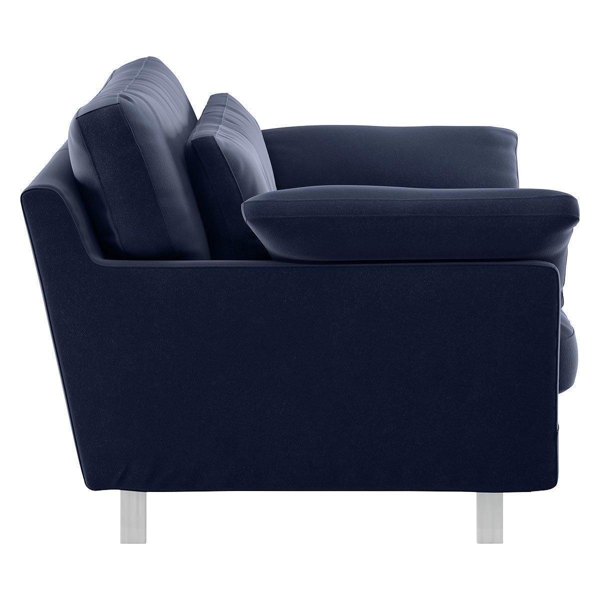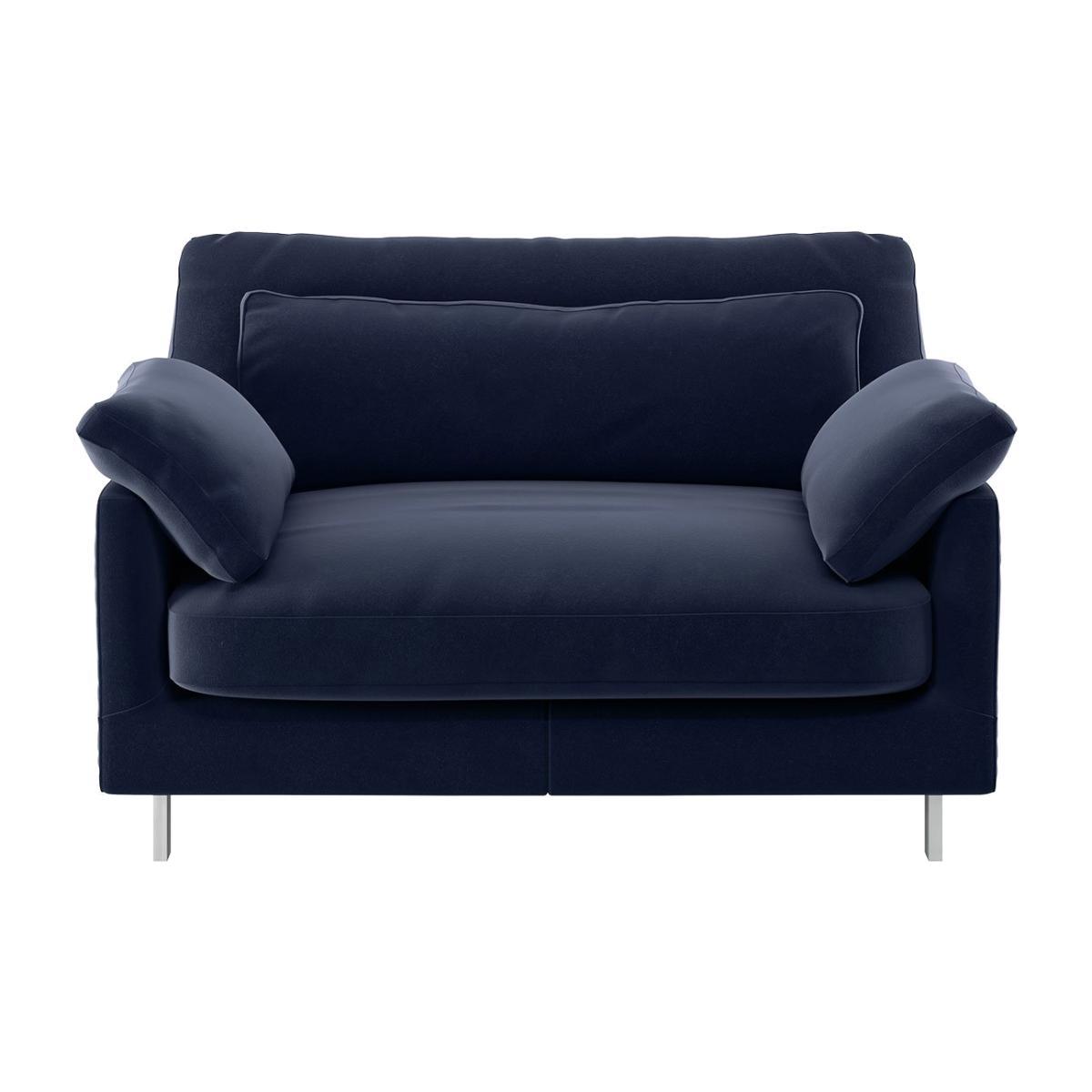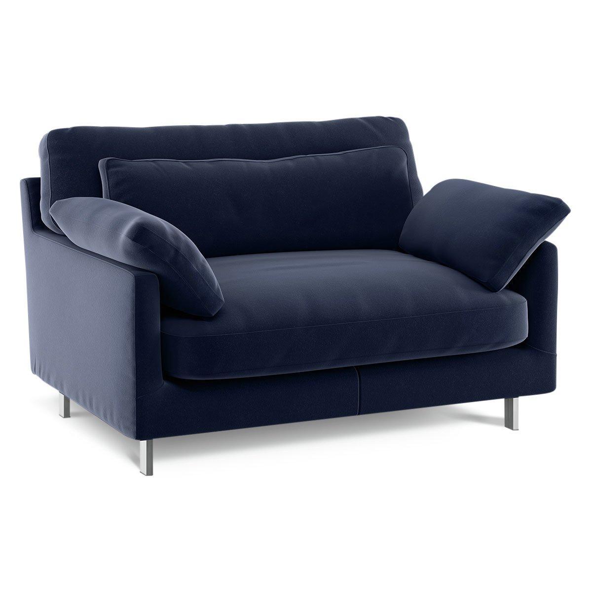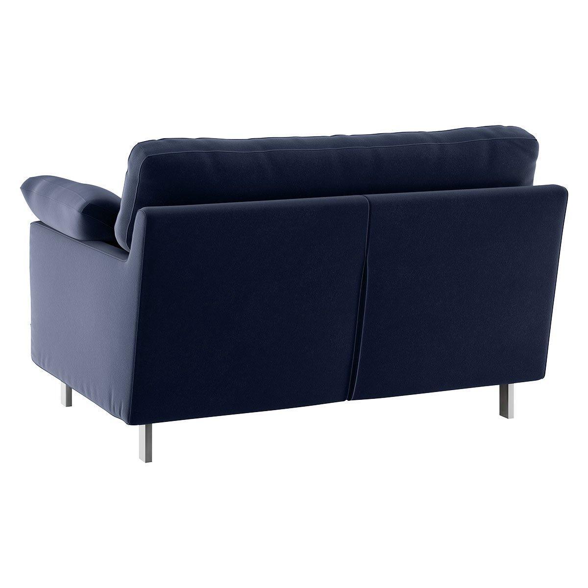 Made in Italy, the Cuscino navy velvet compact sofa has soft, feather-filled scatter cushions for a supremely comfortable sit. With plump fibre and feather back cushions and foam and feather seat cushions, the sofa lives up to its name, while slender chrome legs keep it chic. Exclusive to Habitat, Cuscino combines luxurious design details with quality construction for everyday practical use and is available in a wide choice of fabrics, colours, sizes and configurations. Part of the Cuscino collection. Material:Made from 86% cotton and 14% modal. Metal feet. Removable seat with foam and fibre with feather topper filling. Removable cushion(s) with foam and fibre with feather topper filling. Dimensions: Size H79, W120, D99cm. Floor to seat height: 40cm. Depth of seat: 70cm. Height of seat back: 39cm. Height of arm rest: 50cm. Packaged dimensions:Package size H89, W120, D65cm. General information:Plump cushions regularly to maintain shape. Self-assembly - just add feet. Maximum individual user weight 120kg. Manufacturer's 1 year guarantee.