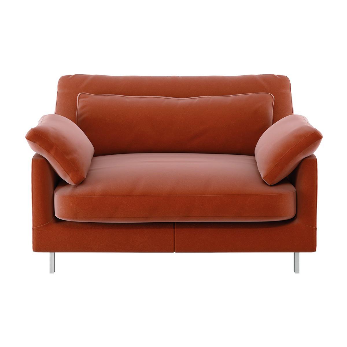 Made in Italy, the Cuscino orange velvet compact sofa has soft, feather-filled scatter cushions for a supremely comfortable sit. With plump fibre and feather back cushions and foam and feather seat cushions, the sofa lives up to its name, while slender chrome legs keep it chic. Exclusive to Habitat, Cuscino combines luxurious design details with quality construction for everyday practical use and is available in a wide choice of fabrics, colours, sizes and configurations.
