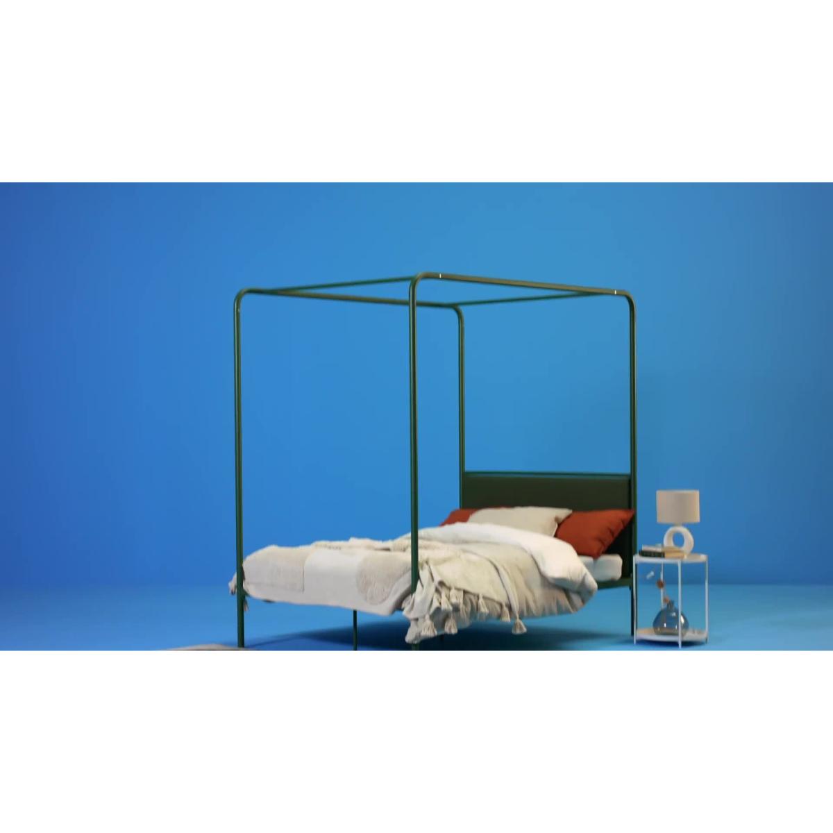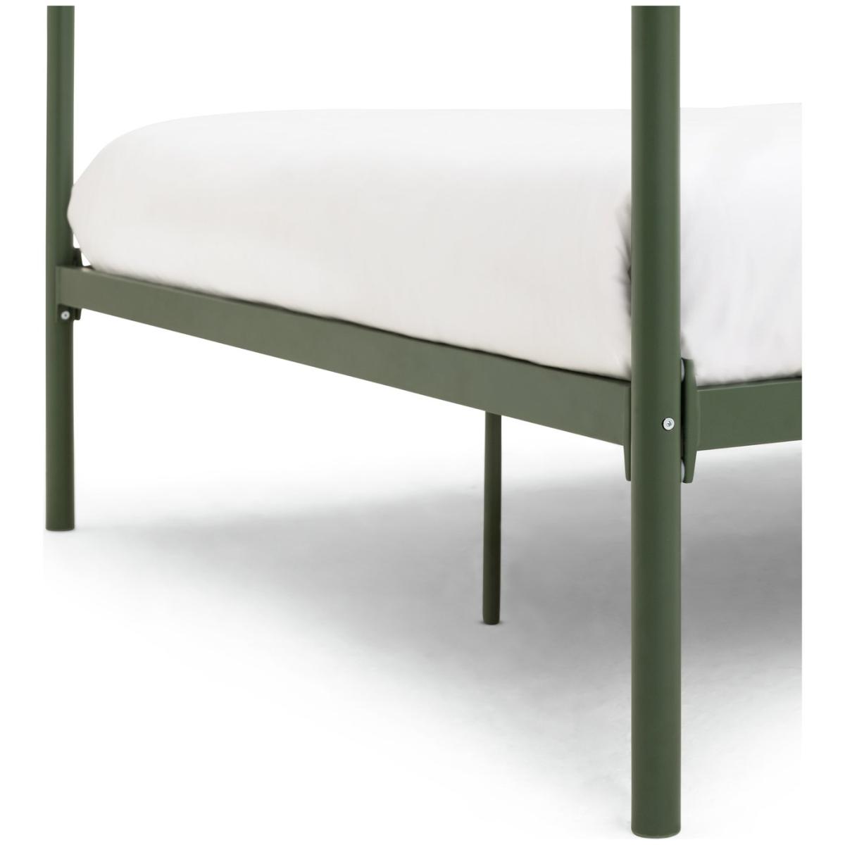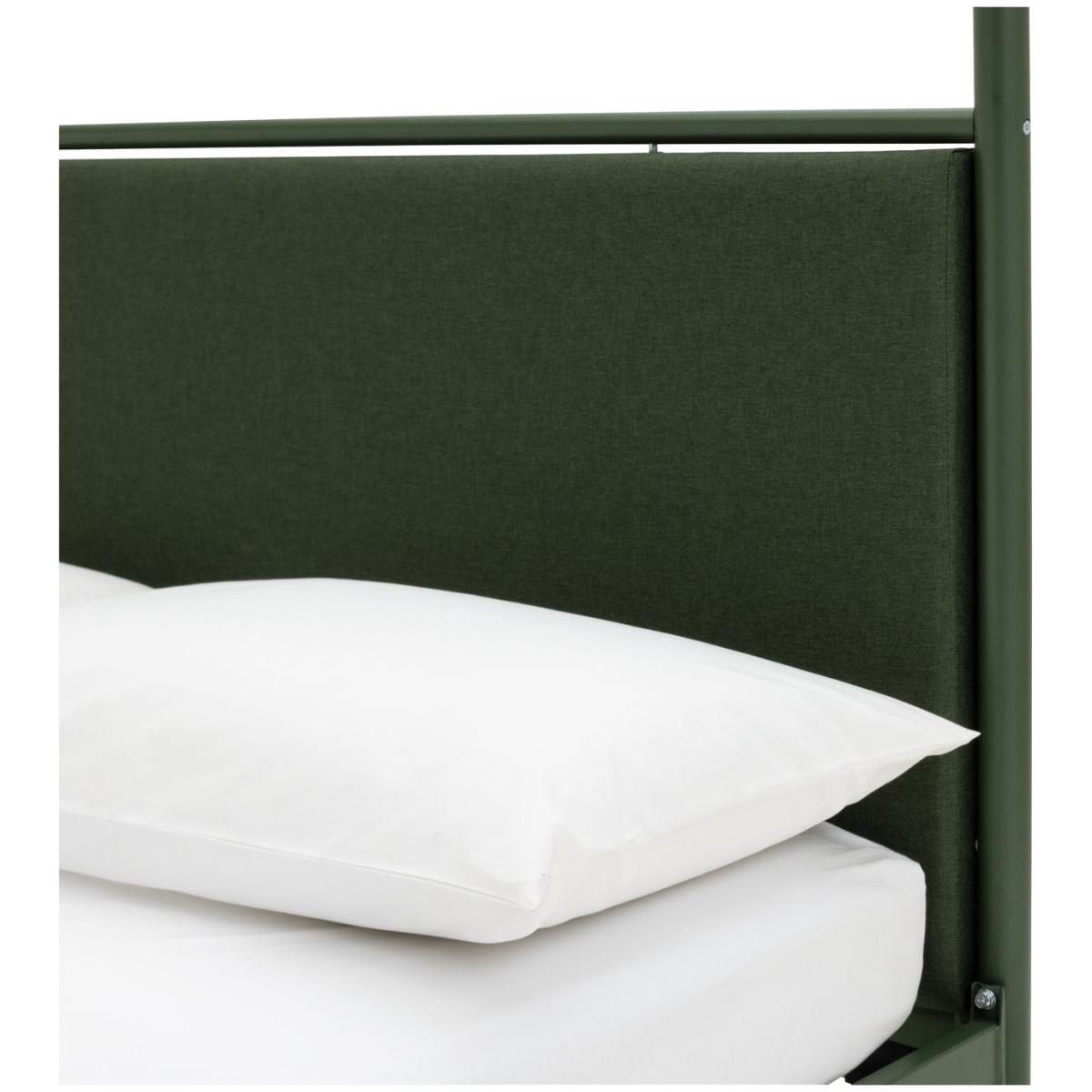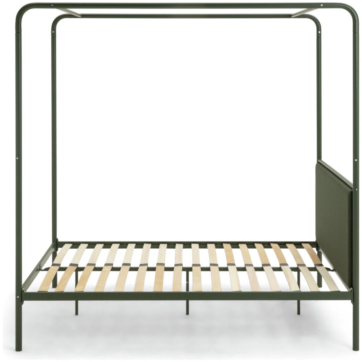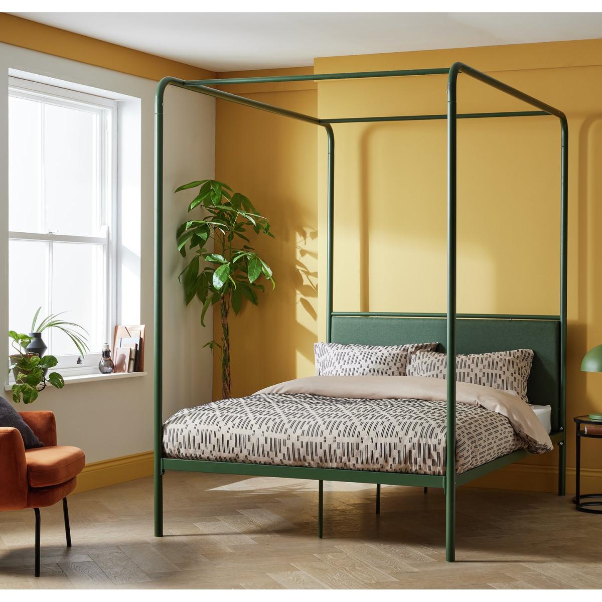 Rest your head in a 4 poster bed. Designed in deep forest green, this modern metal frame has impressive height and lines to give your sanctuary a sensational centrepiece. Keep it bold and bare, or dress with voiles for a softly romantic style. Sprung wooden slats on the base provide comfortable healthy support for your double mattress. Part of the Damon collection. Metal frame. Base with plywood slats. Size W142.8, L200.5, H210cm. Height to top of siderail 35cm. 30cm clearance between floor and underside of bed. Weight 34.6kg. Total maximum user weight 110kg. Self-assembly - 2 people recommended. Package Dimensions: Package 1 dimensions: H9, W43.5, D209.5cm. Package 1 weight: 32.8kg. Package 2 dimensions: H6.5, W64.5, D143.5cm. Package 2 weight: 5.8kg. FSC certified meaning the materials used for this product are responsibly sourced. General Information: We are excited to be welcoming some of our favourite HOME products into the Habitat range. Your product may arrive in Habitat or HOME packaging. Manufacturer's 2 year guarantee.