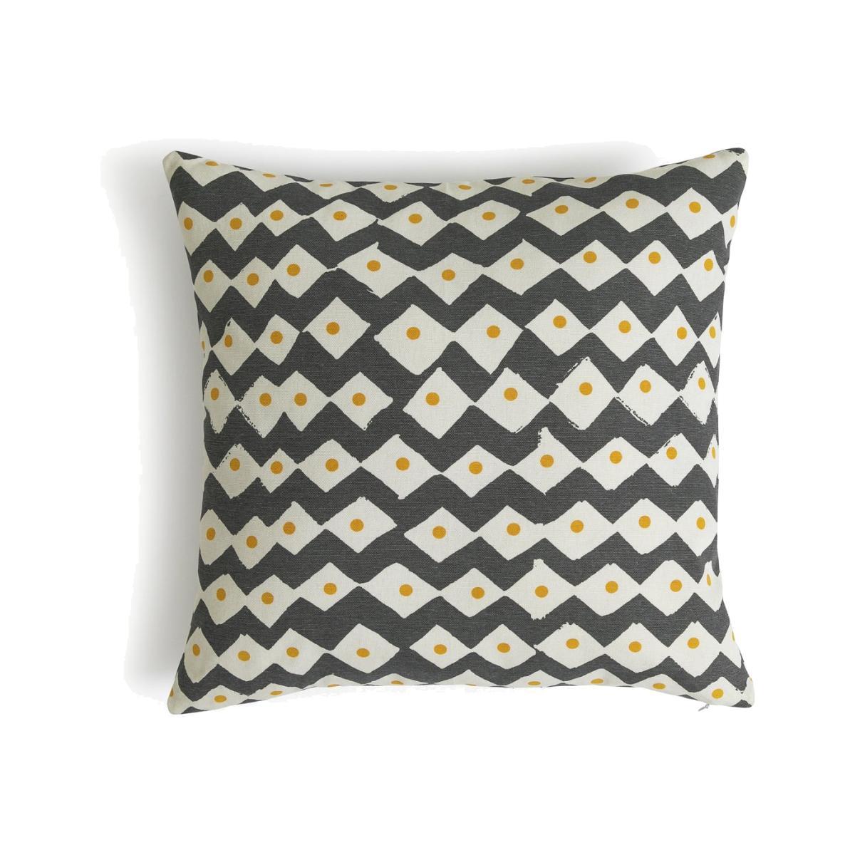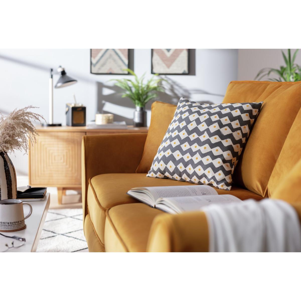 A diamond gal. Darcy loves to keep you comfy and your home looking cool. Bring a touch of the designer to your sofa or armchair with this striking pattern of zigzags, geometric shapes and sunny yellow spots. Made with recycled polyester filler, you'll be nailing the ethics and the aesthetics all in one. Check you out.