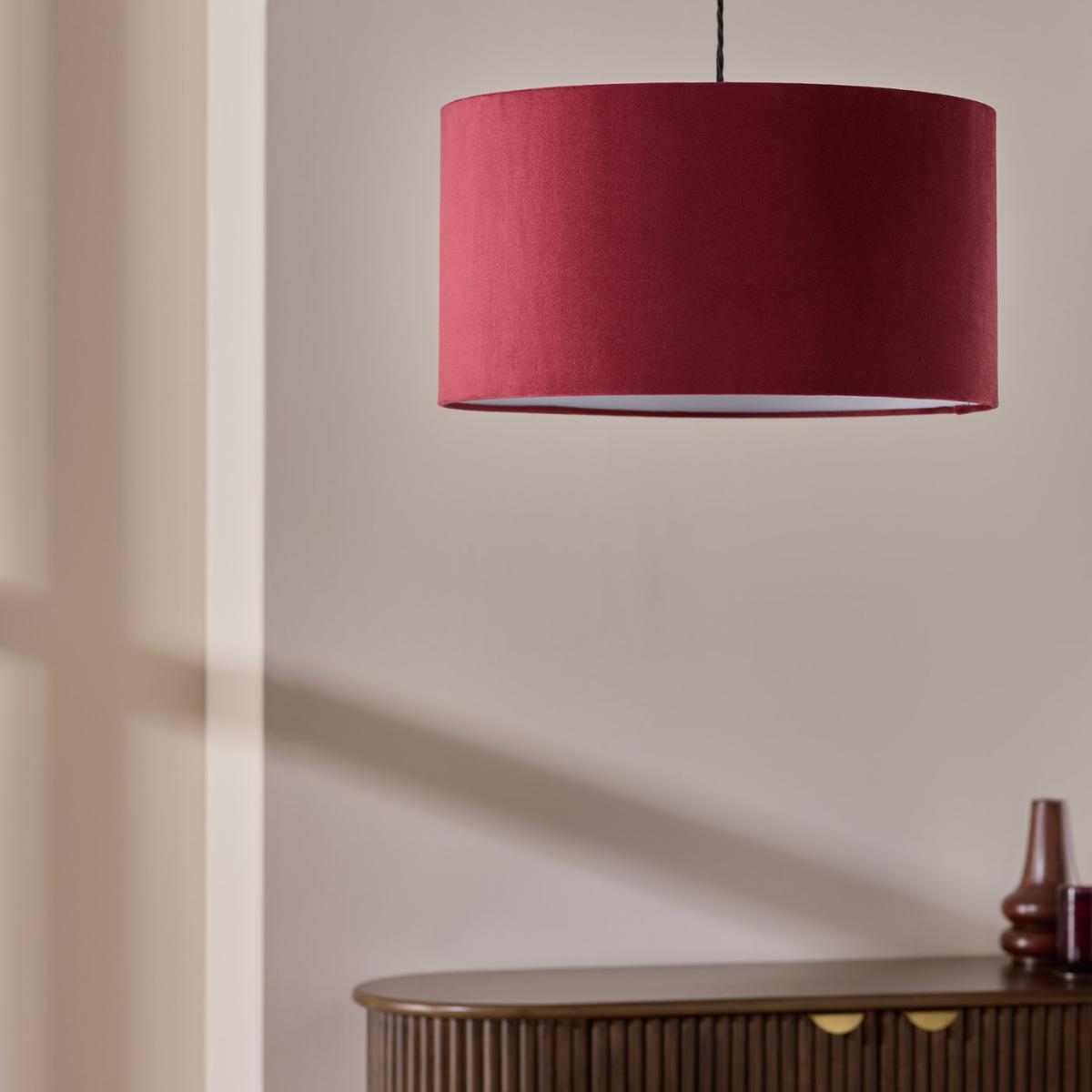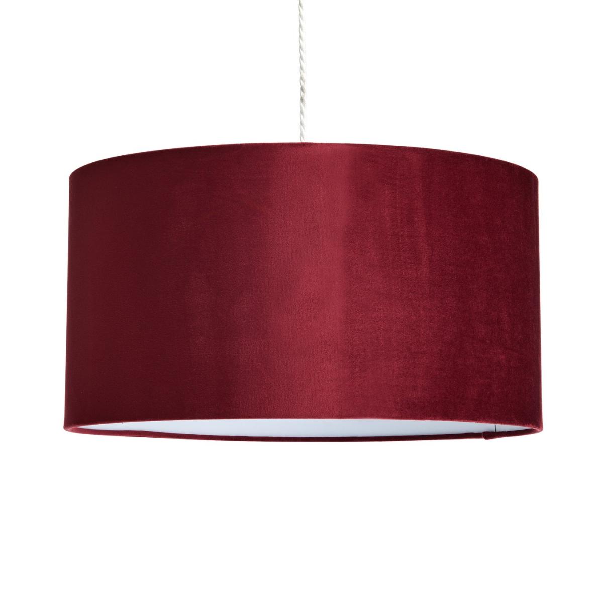 In a deep claret red, our large luxe velvet shade creates just the right mood for cosy evenings. The classic drum design effortlessly diffuses light to create a subtle, ambient glow. Easy fit, it's suitable for ceiling pendants, table and floor lamps. Simply, softly, elegant. To keep the tactile velvet shade looking pristine, dust lightly with a clean cloth now and then. Made from fabric. Size H26cm, Diameter 49cm. Recommended maximum bulb wattage 10 watts. Minimal assembly. Easy fit shade. Manufacturer's 1 year guarantee.