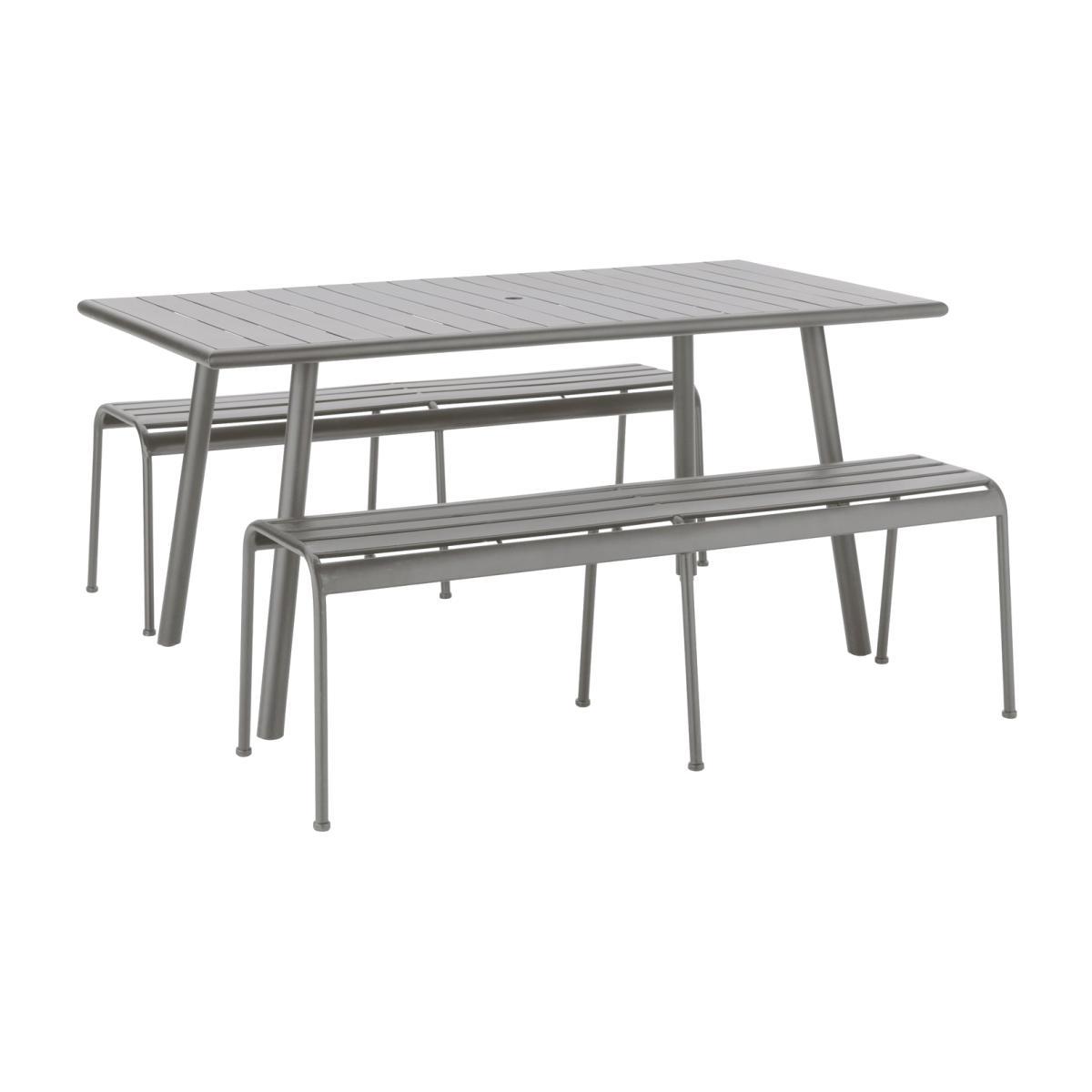 Leisurely lunches and snuggle-up suppers. Make the most of the summer sunshine with our trendy rectangular dining table and two benches. The elegantly designed table with slatted top is spacious enough for a three-course spread for six. The stylish benches with rounded edges have slatted seats so any rain will run off – clever. They're great space-savers too and a practical way to 'fit in' an extra guest – squeeze up a bit please! Dusky evenings? No problem. String lights over the patio area or wrap them around tree trunks to enhance your outdoor dining experience. Outdoor lighting looks lovely at night. Place solar lights either side of a path to light your guests' way. Garden table features:Metal table top. Metal garden table. Table size: H75, W80, L160cm. Removable legs for storage. When using a parasol in the table, always use a weighted parasol base and remove parasol in windy conditions. Garden chair features:Set seats 6 people. Seat height 45cm. Frame made from metal. Chair seat and back made from metal. Stackable chairs. Size H83, W47, D61cm. 160kg maximum user weight per chair. Parasol features:Parasol not included. Parasol hole in table diameter 4cm. General features:Suitable for garden use. Total weight 36kg. General Information: Self-assembly - 1 person required. Manufacturer's 1 year guarantee.