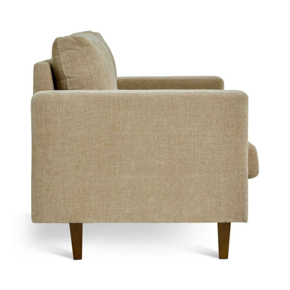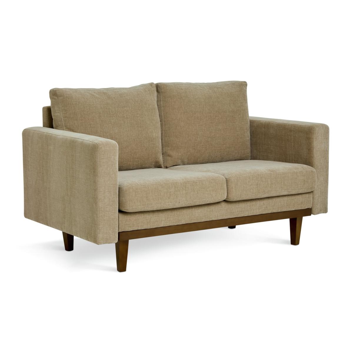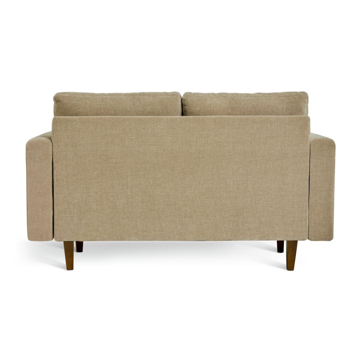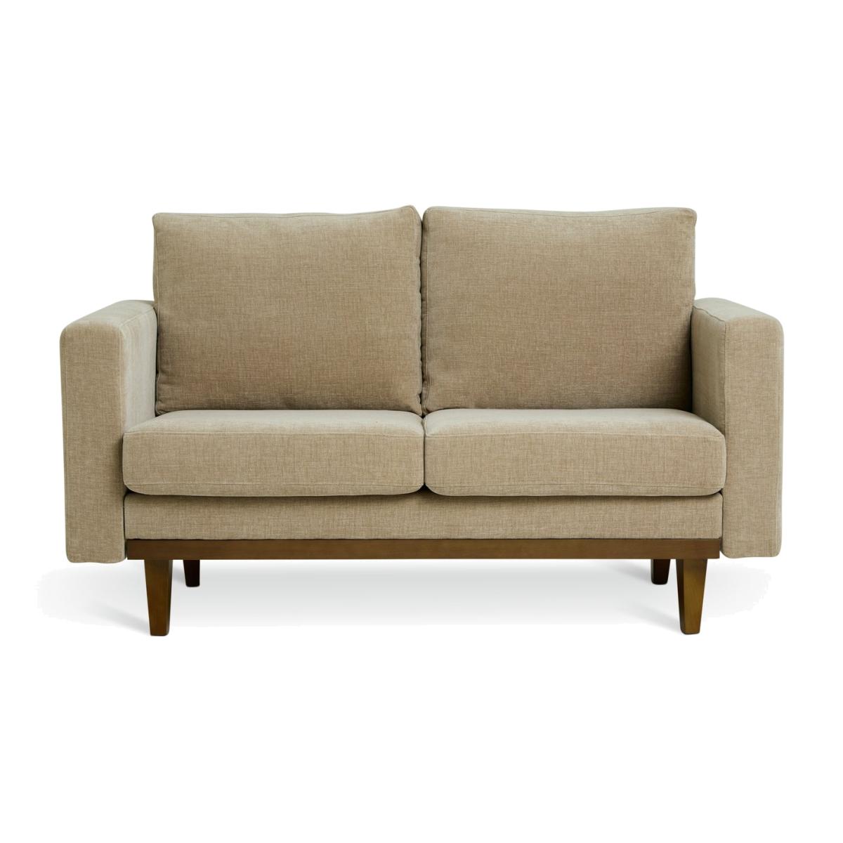 Enjoy mid-century mode straight out of the box. Clean simple lines, slim upright arms, and a fabric in blended neutral tones paired with walnut stained legs. This is a sofa that embraces mid-century design. Comfy of course. The 2 fixed seats have a foam fibre wrapped filling. And the 2 removable cushions are plumply padded for a supportive softness. And guess what? Della is a 2-seater sofa in a box. So, a doddle to deliver, simple to manoeuvre, and easy to love. Part of the Della collection. Material: Made from 100% polyester. Wooden feet - walnut. Medium firm seat cushions. Fixed seats with foam fibre wrap filling. Removable cushion(s) with fibre filling. Free fabric swatch available on this line. Dimensions: Size H95, W144, D82cm. Floor to seat height: 48cm. Depth of seat: 50cm. Height of seat back: 47cm. Width of seating area between arms: 120cm. Height of arm rest: 65cm. Weight: 41.9kg. Packaged dimensions: Package size H39, W122, D74.5cm. Second package size H25, W124, D66cm. General information: FSC certified meaning the materials used for this product are responsibly sourced. Professional clean only. Plump cushions regularly to maintain shape. Fully assembled. Maximum individual user weight: 180kg. Manufacturer's 2 year guarantee.