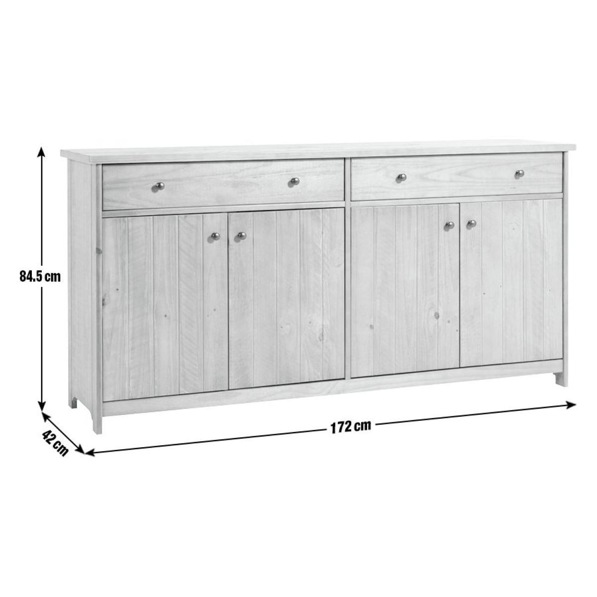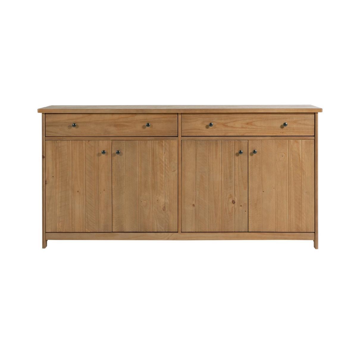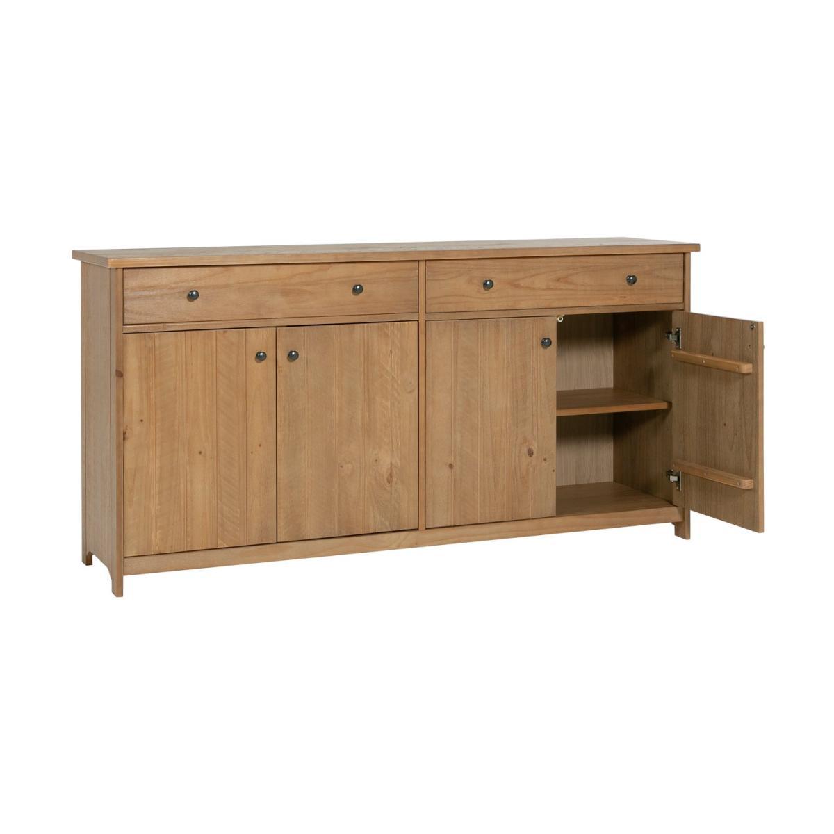 Our large wooden sideboard is one sophisticated storage solution. Crafted in pine with 4 spacious cupboards and 2 drawers, this handsome piece has a place for everything. Smooth black handles give it a timelessly traditional look. Tuck your dinnerware, games and magazines neatly inside. It makes a dashing drinks cabinet, too. Whatever you store, the adjustable internal shelf works around your needs. Now that's neat.