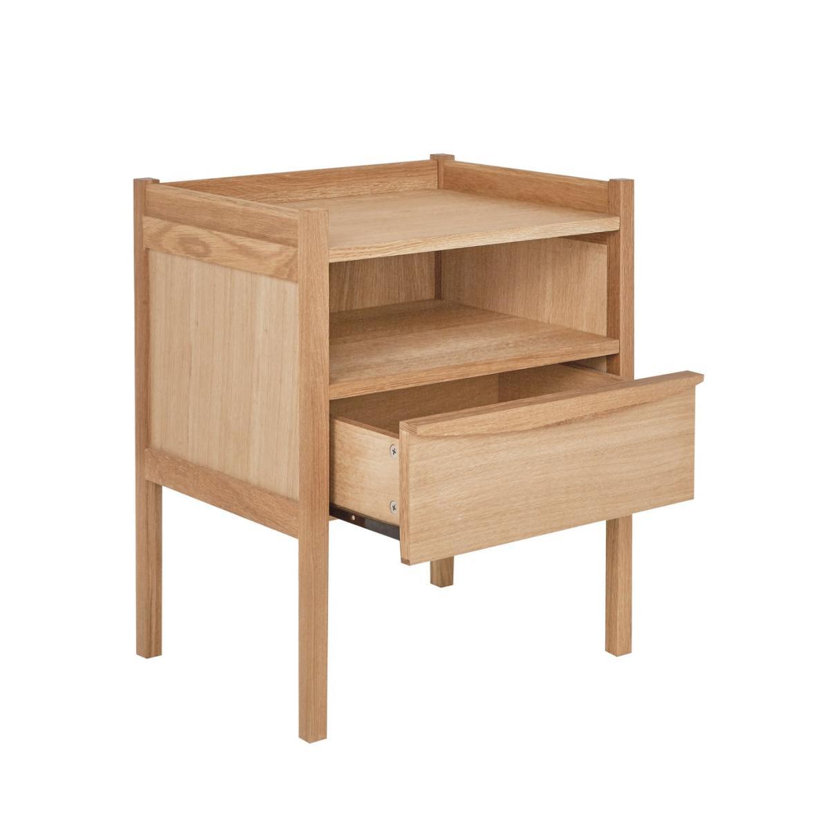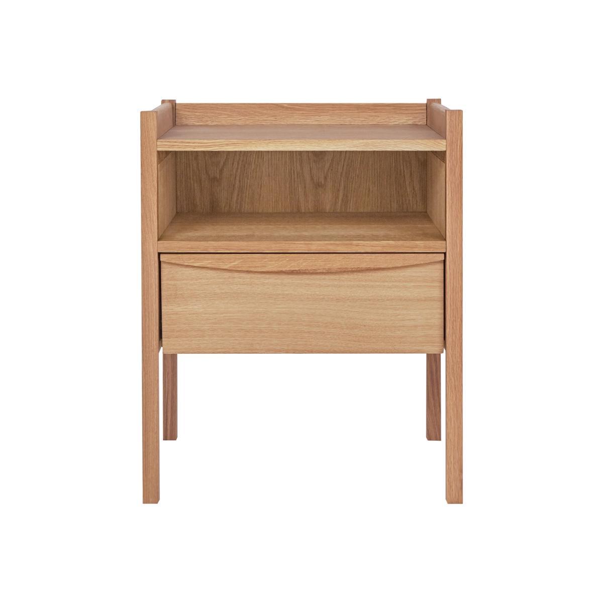 Inspired by mid-century design, the Derwent oak 1 drawer bedside table with shelf offers plenty of storage space for your accessories. Crafted from solid oiled oak and oak veneer, the drawer features a hidden groove and slides on metal runners for a smooth finish. Raised on slim legs that give lightness to the piece, the conveniently placed shelf is perfect for storing books, glasses and magazines.