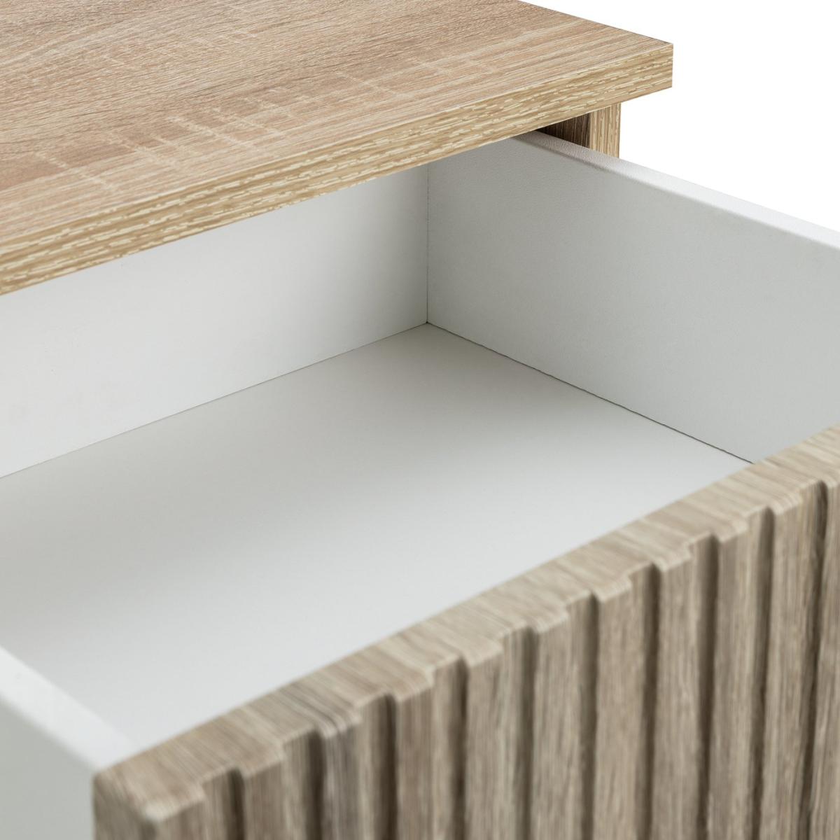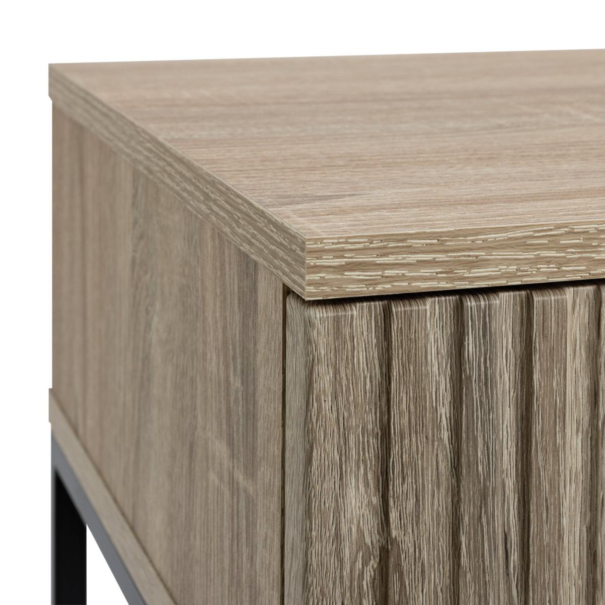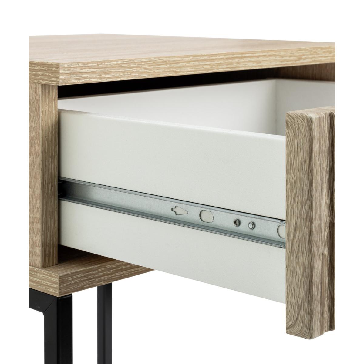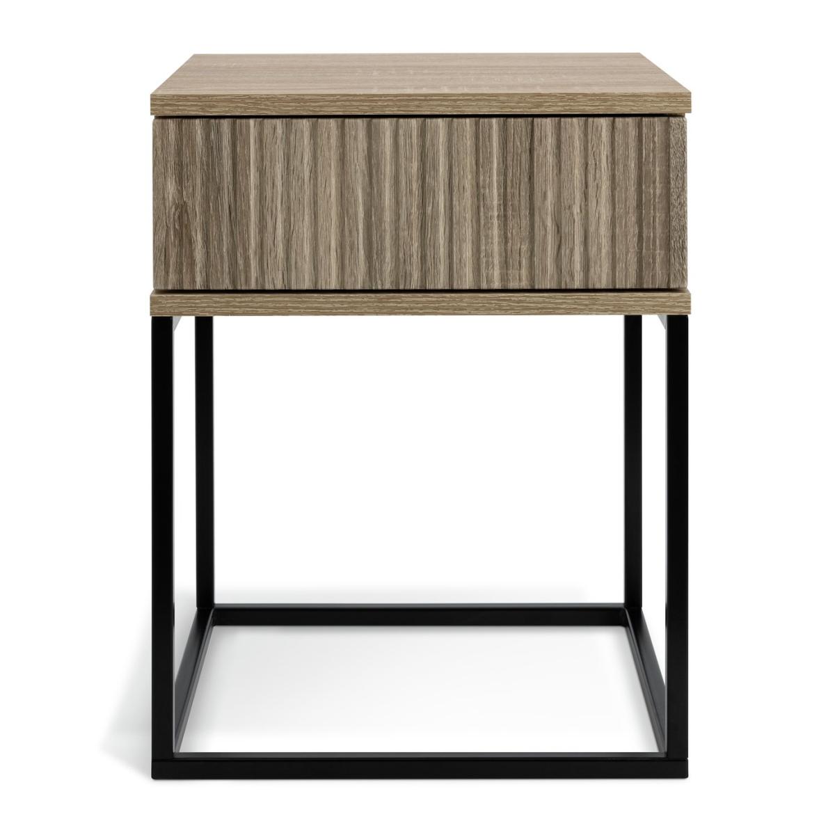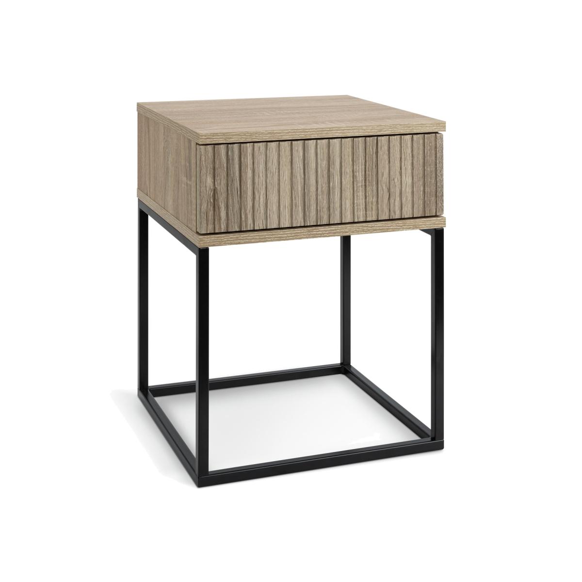 A bedside table with an industrial edge. Just check out the oak like ribbed exterior and black metal legs. The generous easy glide drawer provides plenty of room to stash away nighttime stuff. Pop a reading lamp on top and let this design shine. Part of the Digby collection. Made of particleboard and stainless steel. 1 drawer with metal runners. Self-assembly (includes wall fixings). If this product is over 60cm high it must be securely attached to the wall to prevent overturning. Dimensions: Size H51.7, W9.8, D38.5cm. Internal drawer H8.5, W33.3, D30cm. Weight 8.8kg. Package Dimensions: Package 1 dimensions: H10.8, W49.3, D41.7cm. Package 1 weight: 9.8kg. General information: FSC certified meaning the materials used for this product are responsibly sourced. Manufacturer's 2 year guarantee.