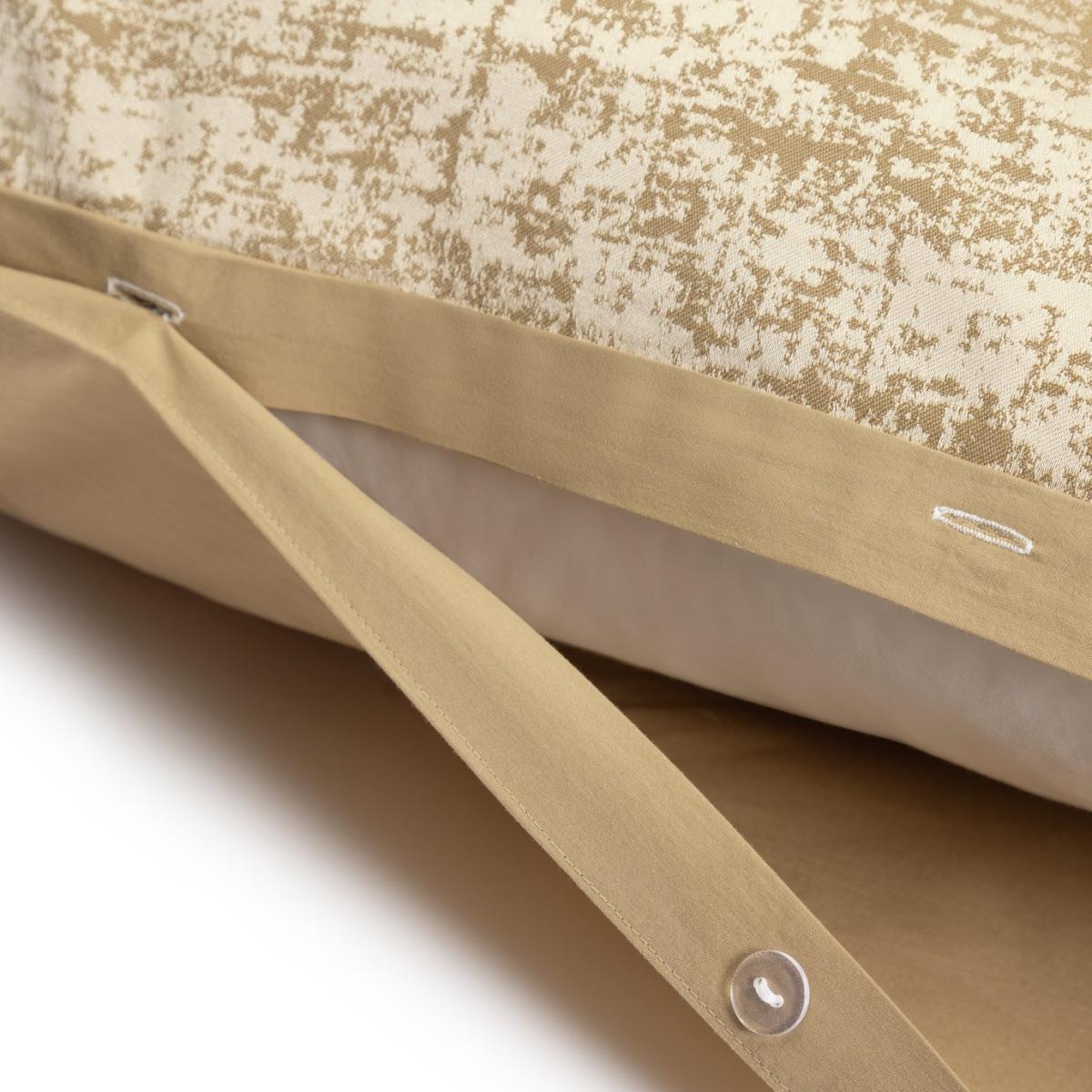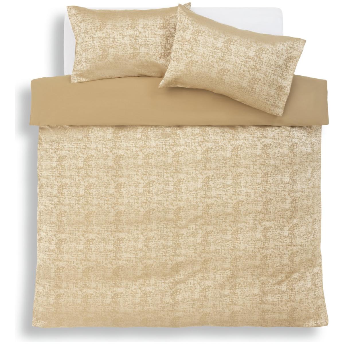 Go for gold. With a distressed jacquard finish, this dazzling duvet set will add a glam touch to your bedroom. An easy way to instantly bring in some opulence. This item carries the STANDARD 100 by OEKO-TEX logo, which means you can be certain that every component has been tested for harmful substances and is therefore harmless to human health. Finish: jaquard. 100% polyester. 50% polyester, 50%cotton. Set includes 1 duvet cover and 2 pillowcases. Bed size: king size. Length 220cm, Width 230cm. Buttons for fastening. Standard pillowcase (s). Pillow case length 75cm, Width 50cm. Machine wash as synthetic at 40 C. Suitable for tumble drying.