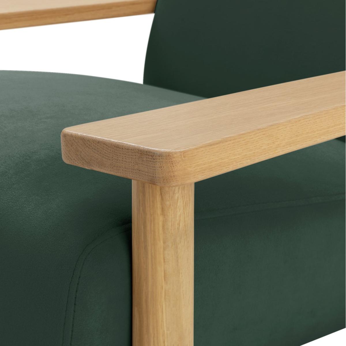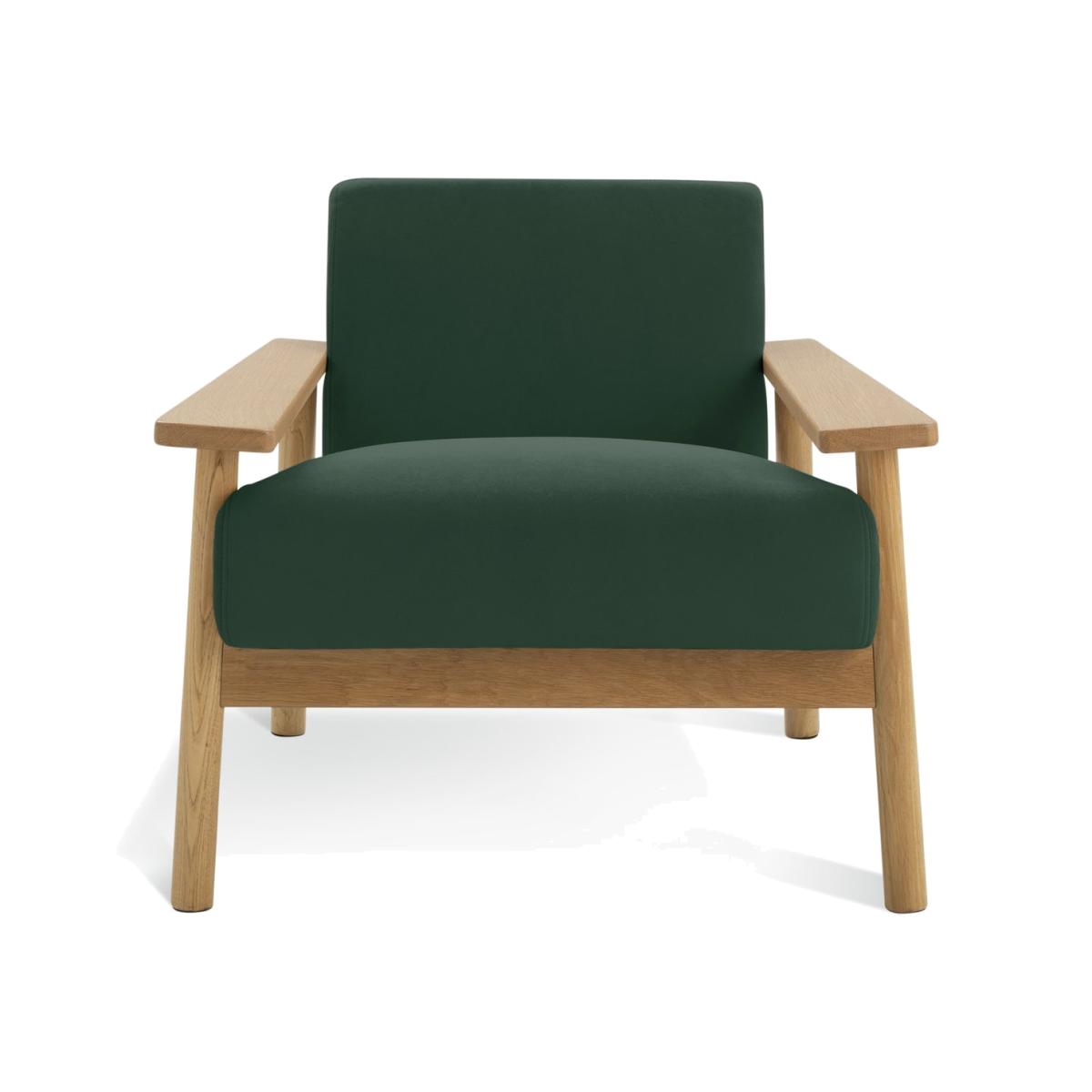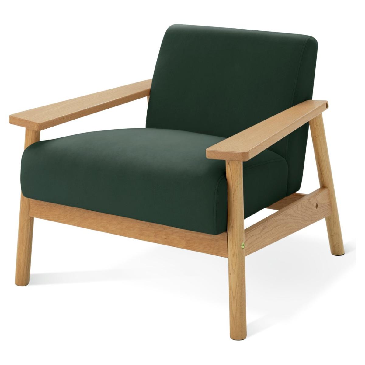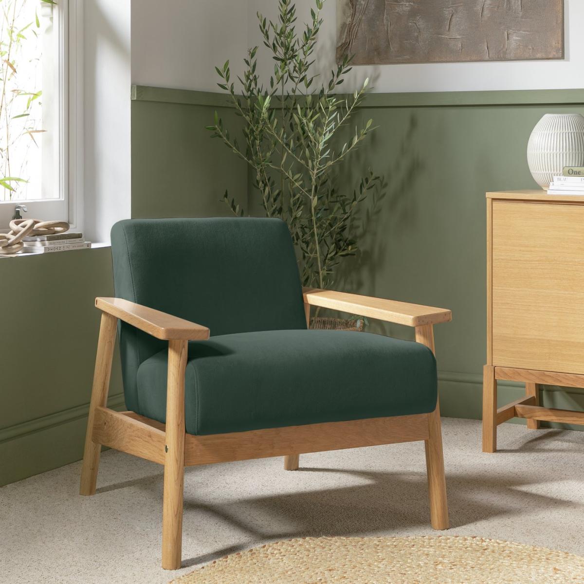 Lazy Sunday afternoons. The inspiration behind the design of our Dore accent chair. Crafted for casual comfort in smooth, solid light oak. Featuring a deep, matt velvet seat cushion and soft supportive back. Lovely for lounging. The thick and wide ergonomic armrests are a perfect glass or mug perch. It's a natural choice for relaxing. Switch off, settle down and perhaps add a page turner. Your chair, your downtime. Part of the Dore collection. Material: Made from 100% polyester. Wooden feet. Fixed seat with foam filling. Fixed cushion(s) with foam filling. Dimensions: Size H69, W80, D79cm. Floor to seat height: 45cm. Depth of seat: 54cm. Width of seating area between arms: 52cm. Height of arm rest: 50cm. Weight 20kg. Dust or wipe with a damp cloth only. Self-assembly. Maximum individual user weight 110kg. Packaged dimensions: Package size H80, W43, D57cm. FSC certified meaning the materials used for this product are responsibly sourced. General information: Manufacturer's 2 year frame guarantee.