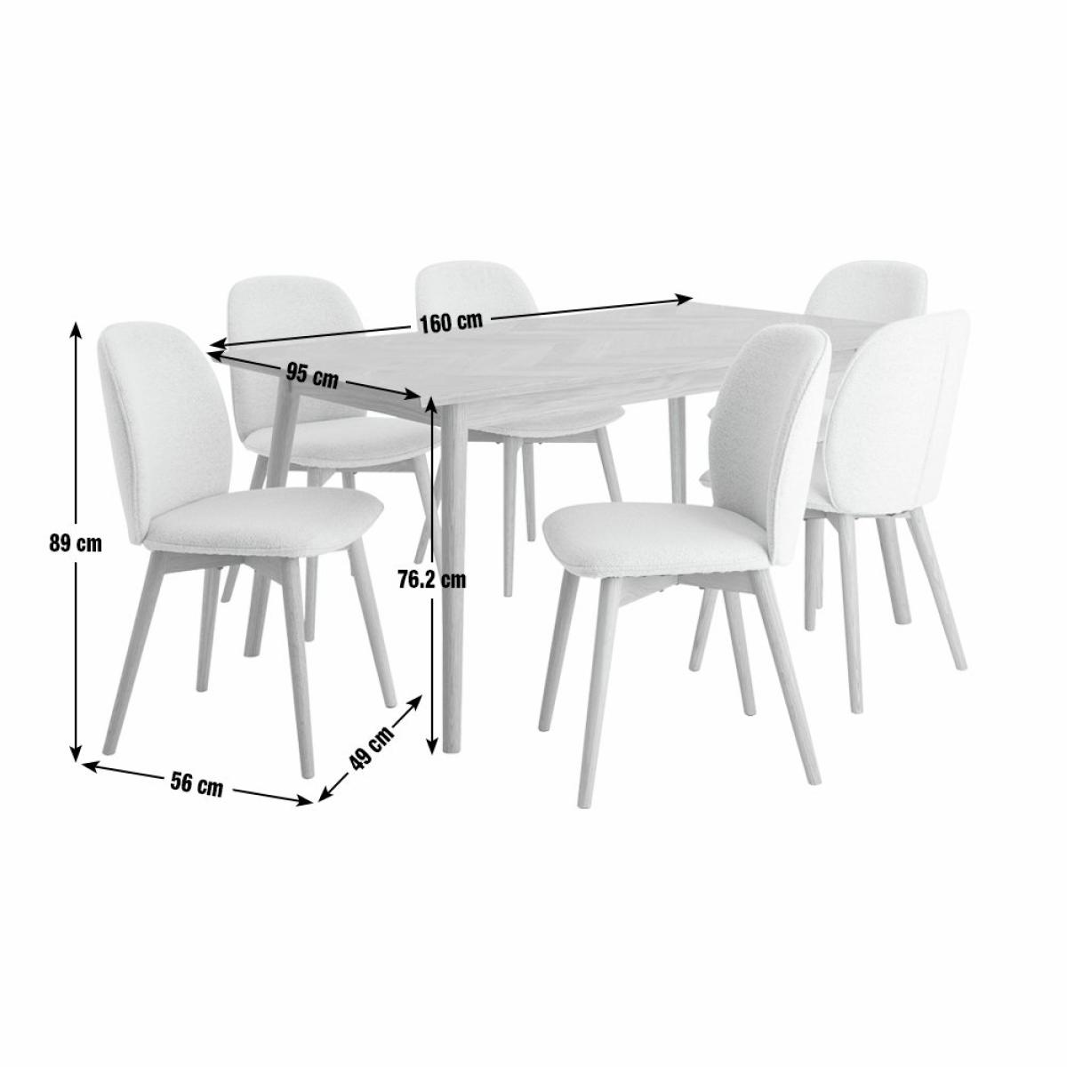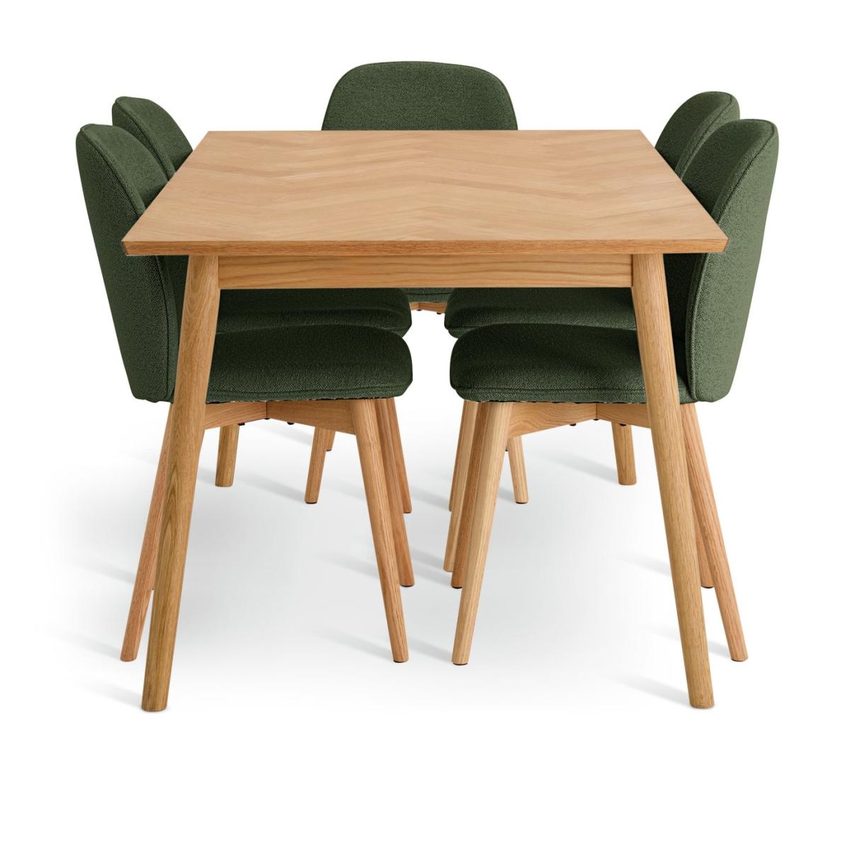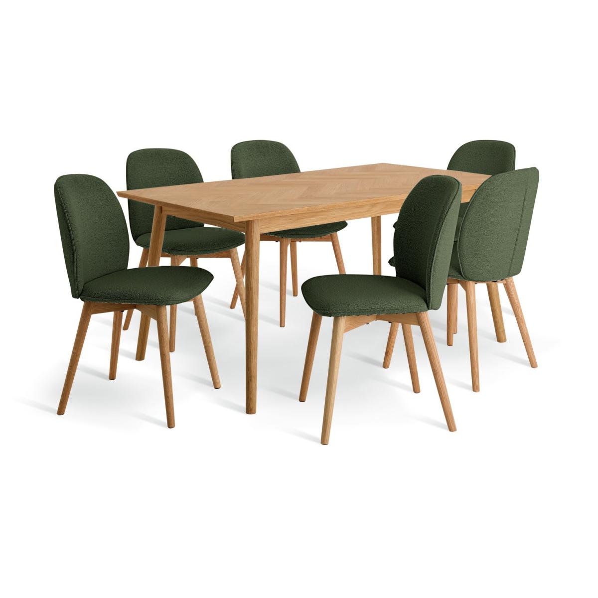 Pull up a chair – or six. Spacious Dorney comfortably caters for all occasions, from Tuesday night takeaways to dinner party spreads. The warm, oak veneer tabletop with its distinctive herringbone pattern offers the beauty of real wood, minus the maintenance. Soft green seats set in an oak-effect frame encourage diners to linger longer. Part of the Dorney collection. Table: Table size H76.2, W95, L160cm. Oak veneer table with oak veneer legs. Oak table top finish. Self-assembly - 2 people recommended. Chair: Includes 6 chairs. Size of each chair H89, W49, D56cm. Seat height 50cm. Wood effect frame with oak legs. Fabric seat pad. Self-assembly. Maximum user weight per chair 110kg. Individual chair weight 15.2kg. Package Dimensions: Table package 1 size H13, W167, D103cm. Individual chair package size H55, W68, D38cm. General information: Manufacturer's 1 year guarantee. Wipe clean or lightly vacuum. By choosing FSC certified products, you are supporting responsible management of the world's forests.