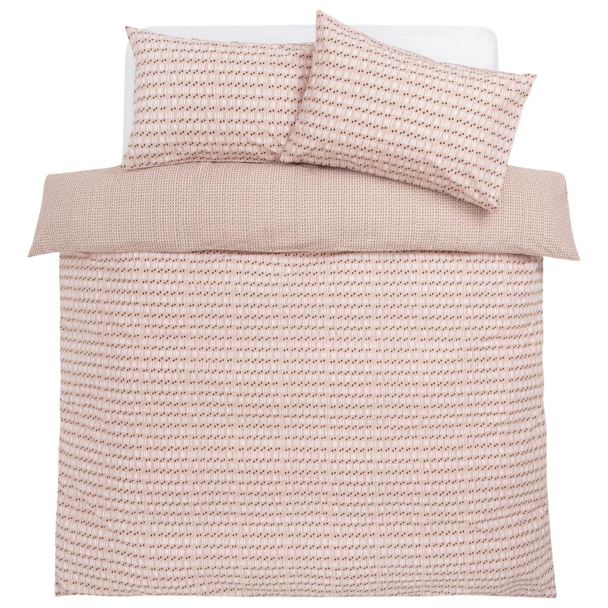 Is our dot dash bedding set code for hotel chic? We think so. The contemporary pattern and warm inviting colours bring an instant va va voom to a room. And it's reversible. With a complimentary repeat pattern on the other side. Style message received. Over and out. This item carries the STANDARD 100 by OEKO-TEX logo, which means you can be certain that every component has been tested for harmful substances and is therefore harmless to human health. 50% polyester , 50% cotton. 144 thread count. Set includes 1 duvet cover and 1 pillowcase. Bed size: single. Length 200cm, Width 135cm. Reversible. Buttons for fastening. Standard pillowcase (s). Pillow case length 75cm, Width 50cm. Reversible pillowcase (s). Wash before use. Suitable for tumble drying.