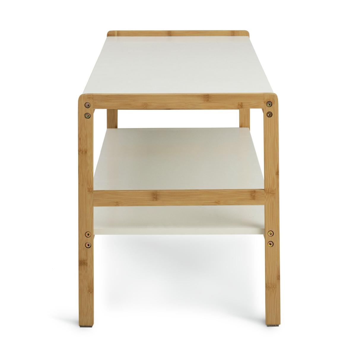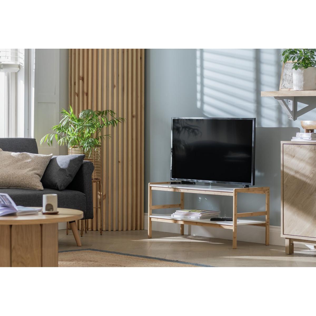 Meet the marvelously barely there Drew. Minimalism at its best. An unassuming open Skandi TV unit. Crafted from strong bamboo with a painted finish and with a spacious under shelf, it's a go-to option for seekers of light and airy interiors. Part of the Drew collection. Made from bamboo and MDF with a painted finish. Size H 45, W 98, D 39cm. Weight 10kg. 2 shelves. 1 media storage section. Largest height of media equipment sections 21cm. Easy cable access. Suitable for screen sizes up to 37in. Maximum weight of TV 30kg. Self-assembly - 2 people recommended. Package Dimensions: Package 1 dimensions: H11.5, W101.5, D46.5cm. Package 1 weight: 13.5kg. General information: We are excited to be welcoming some of our favourite HOME products into the Habitat range. Your product may arrive in Habitat or HOME packaging.