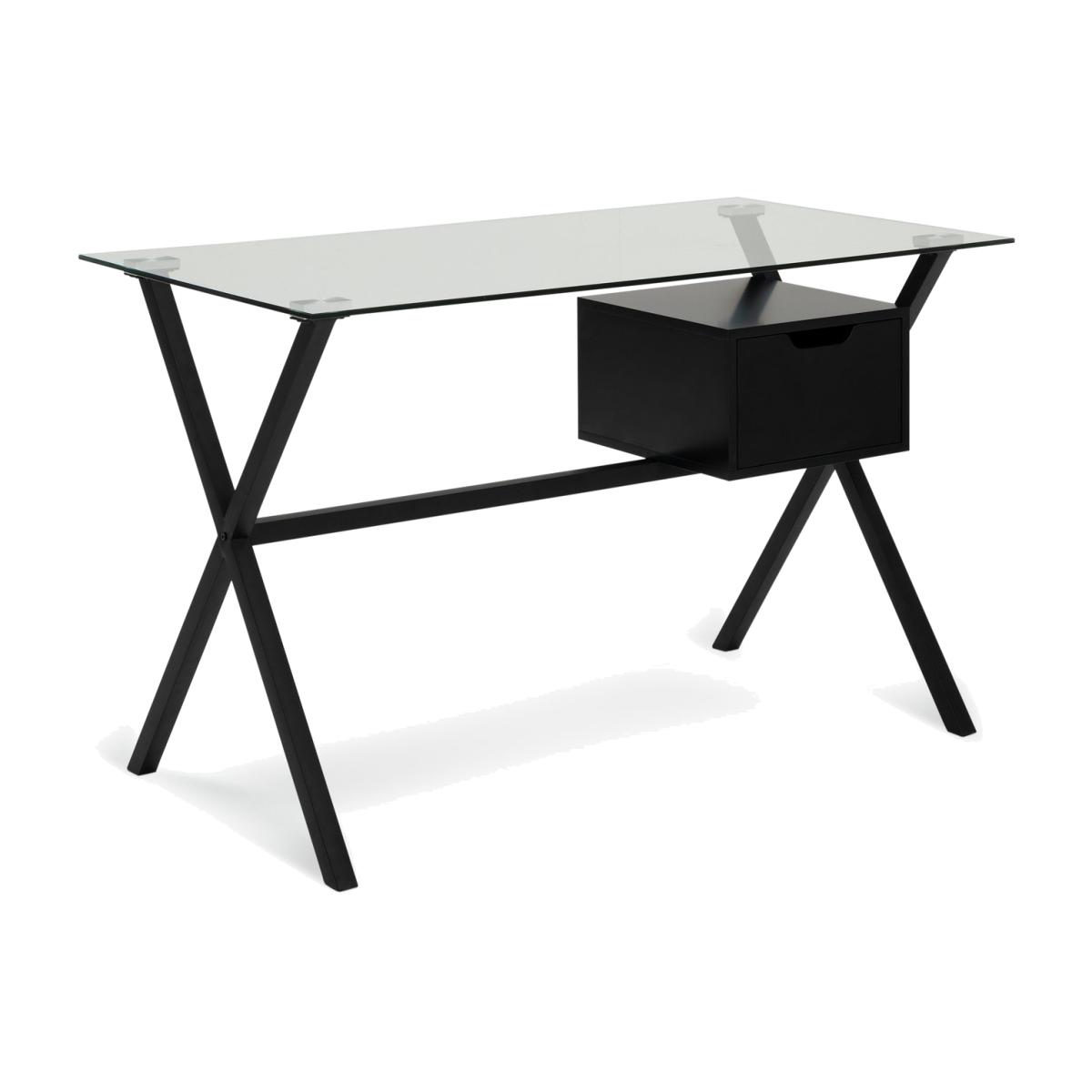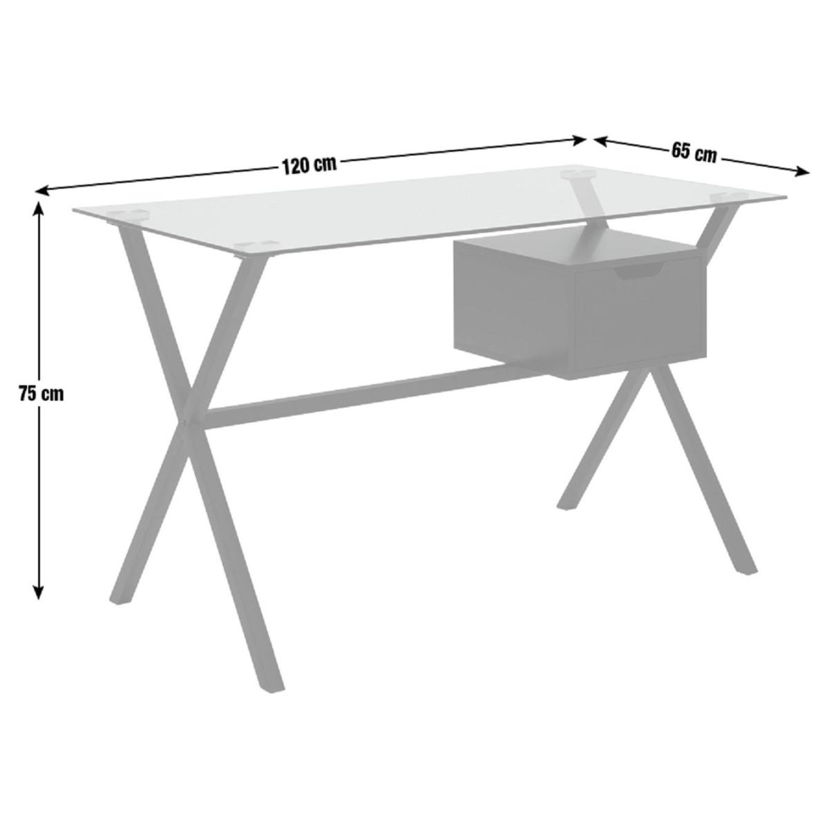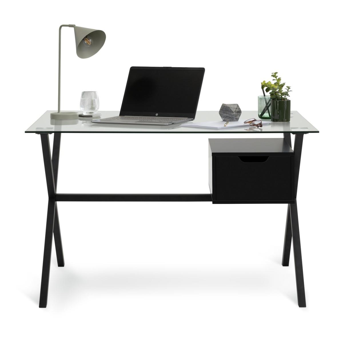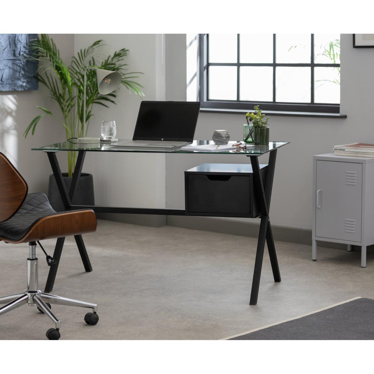 The power of wow. Install yourself at this stylish desk that looks fit for a tech guru. Minimal in glass and steel with an easy glide wooden drawer on metal runners. Takes working from home to a new level. Just add seat. Part of the Dria collection. Made from steel and steel with a painted finish with MDF handles. 1 drawer with metal runners. No easy cable access. Packed flat - 2 people recommended. General information: We are excited to be welcoming some of our favourite HOME products into the Habitat range. Your product may arrive in Habitat or HOME packaging. Manufacturer's 1 year guarantee. Dimensions: Size H75, W120, D65cm. Under desk chair space H39, W104cm. Maximum load capacity of desk 25kg. Weight 26.4kg. Packaged dimensions: Package dimensions H10, W77, D123cm. Second package H6, W70, D129cm. FSC certified meaning the materials used for this product are responsibly sourced.