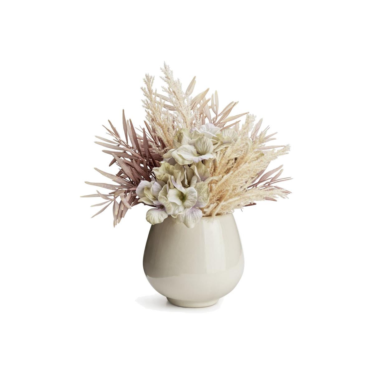 Beautiful beige blossoms. Love the bloom but hate the fuss? Our ceramic pot with dried flowers is just the thing. Pretty stems and sprigs in pale pastel hues sit gently in the glossy pot. Spruce up your decor with this fine floral find. Refresh your interior with more pretty pastel accessories. Size H30.5, W23,. Diameter 23cm.