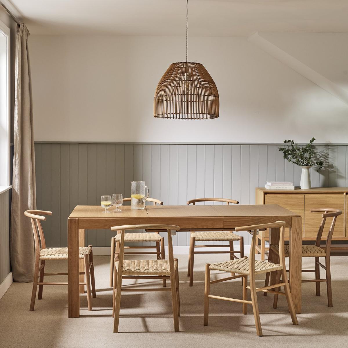 Need a table for 4, or more? Come dine with Drio. This 4-seater extending dining table can expand to accommodate up to a crowd pleasing 10. Wow. Made with a solid oak frame with a natural veneer surface, it has a smart, yet homely feel. Drio, the small table that thinks big. Part of the Drio collection. Table: Table size: H75, L120, W95cm. Size of table extended: L240cm. Integral table extension. Removable table extension. Centre leaf extension type. Real wood veneer table with solid wood legs. Self-assembly - 2 people recommended. Weight of table 57kg. Package Dimensions: Table packaging size: H18.5, W133, D107cm. General information: Manufacturer's 1 year guarantee.
