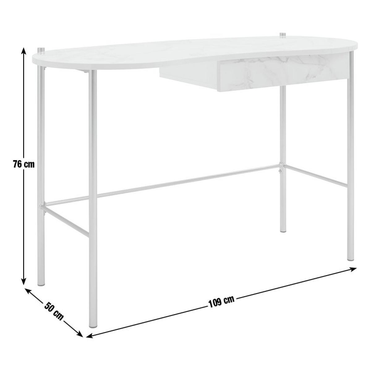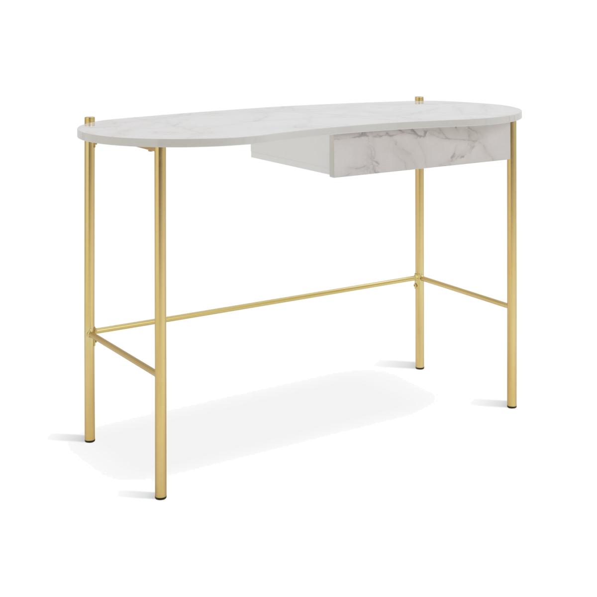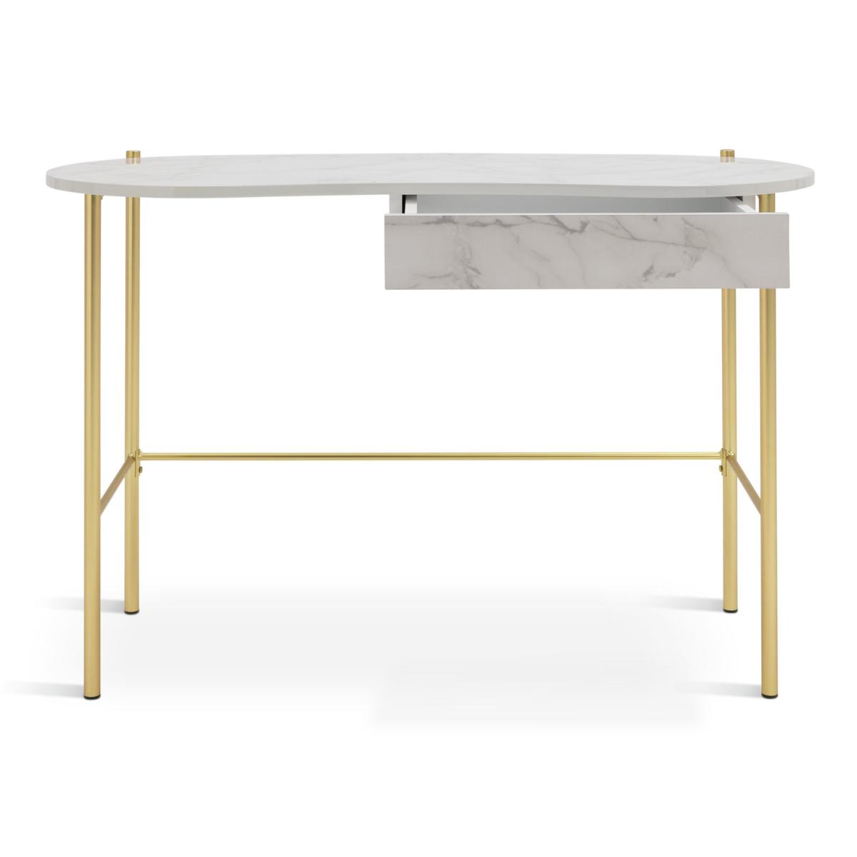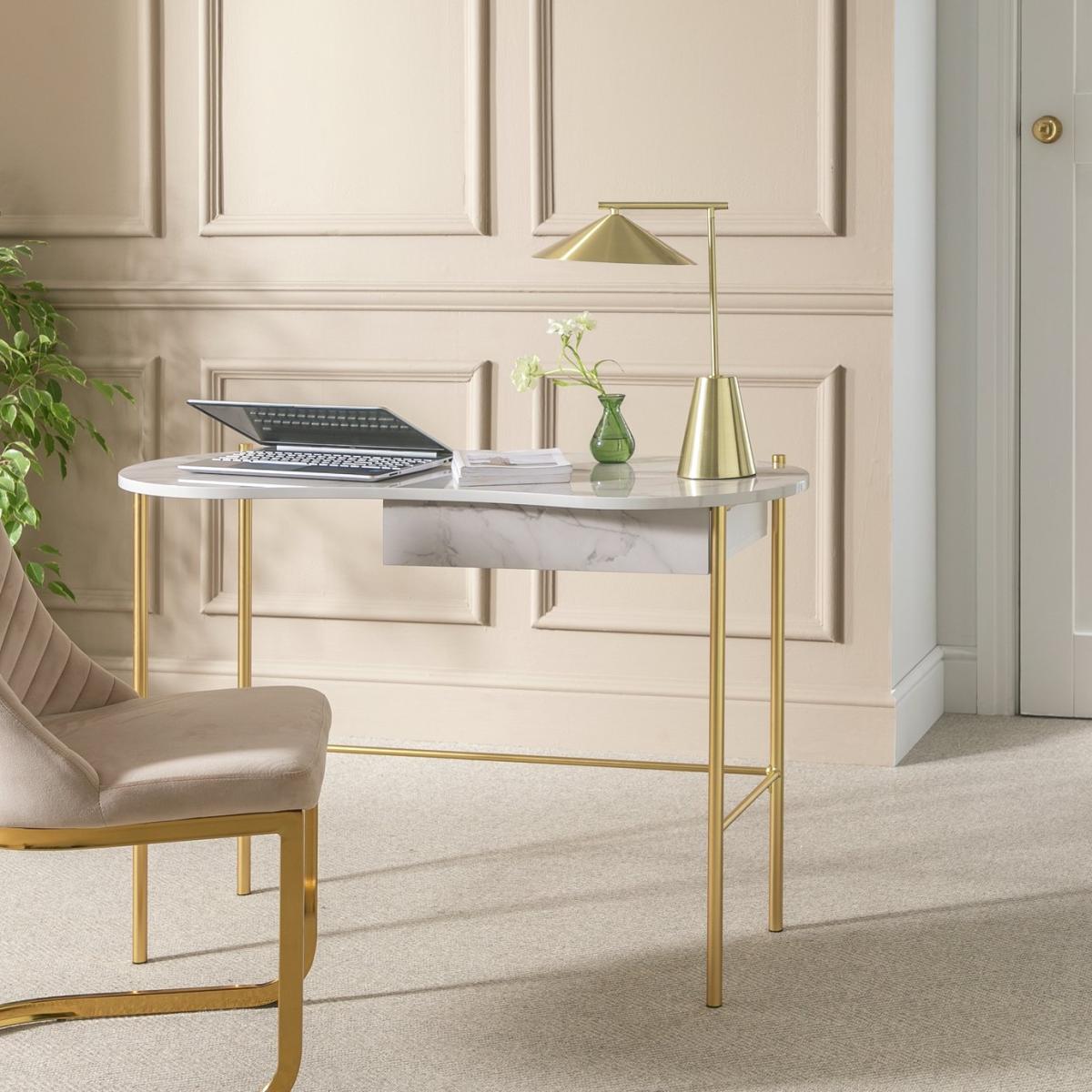 A modern marble marvel. Our Dulcie desk brings a pop of polished professionalism to a home office. The marble effect detailing, and painted gold legs have more than a hint of Italian charm. With an easy-glide drawer to tuck away documents and stationery. Made from MDF. 1 drawer with metal runners. No easy cable access. Self-assembly - 2 people recommended. Wall fixing recommended. If this product is over 60cm high it must be securely attached to the wall to prevent overturning. General information: Manufacturer's 1 year guarantee. Dimensions: Size H76, W109, D50cm. Under desk chair space H73.2, W88.8cm. Maximum load capacity of desk 20kg. Weight 13.5kg. Packaged dimensions: Package dimensions H10, W119, D55cm. FSC certified meaning the materials used for this product are responsibly sourced.