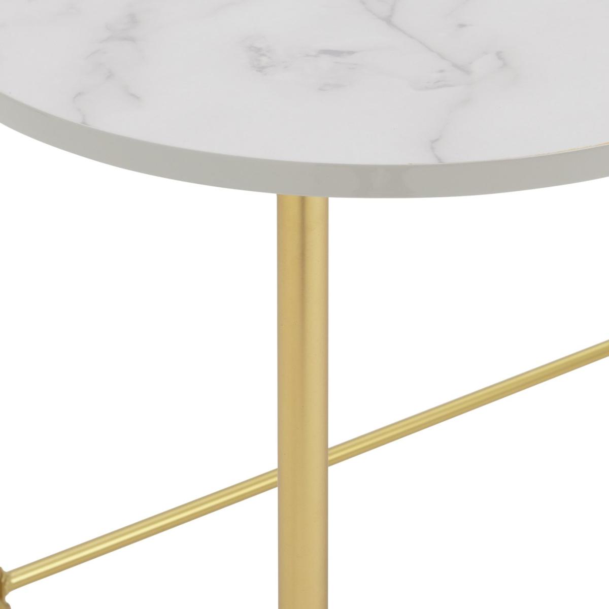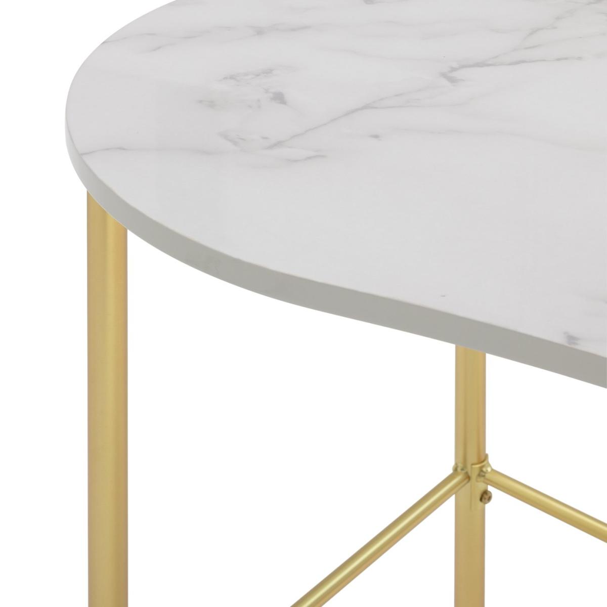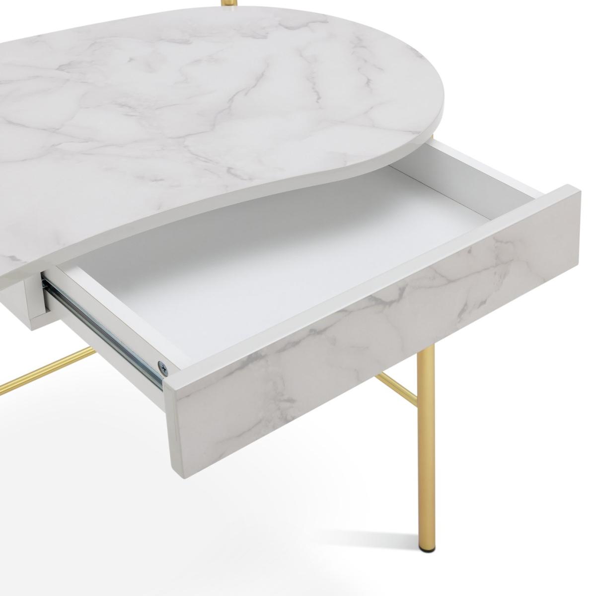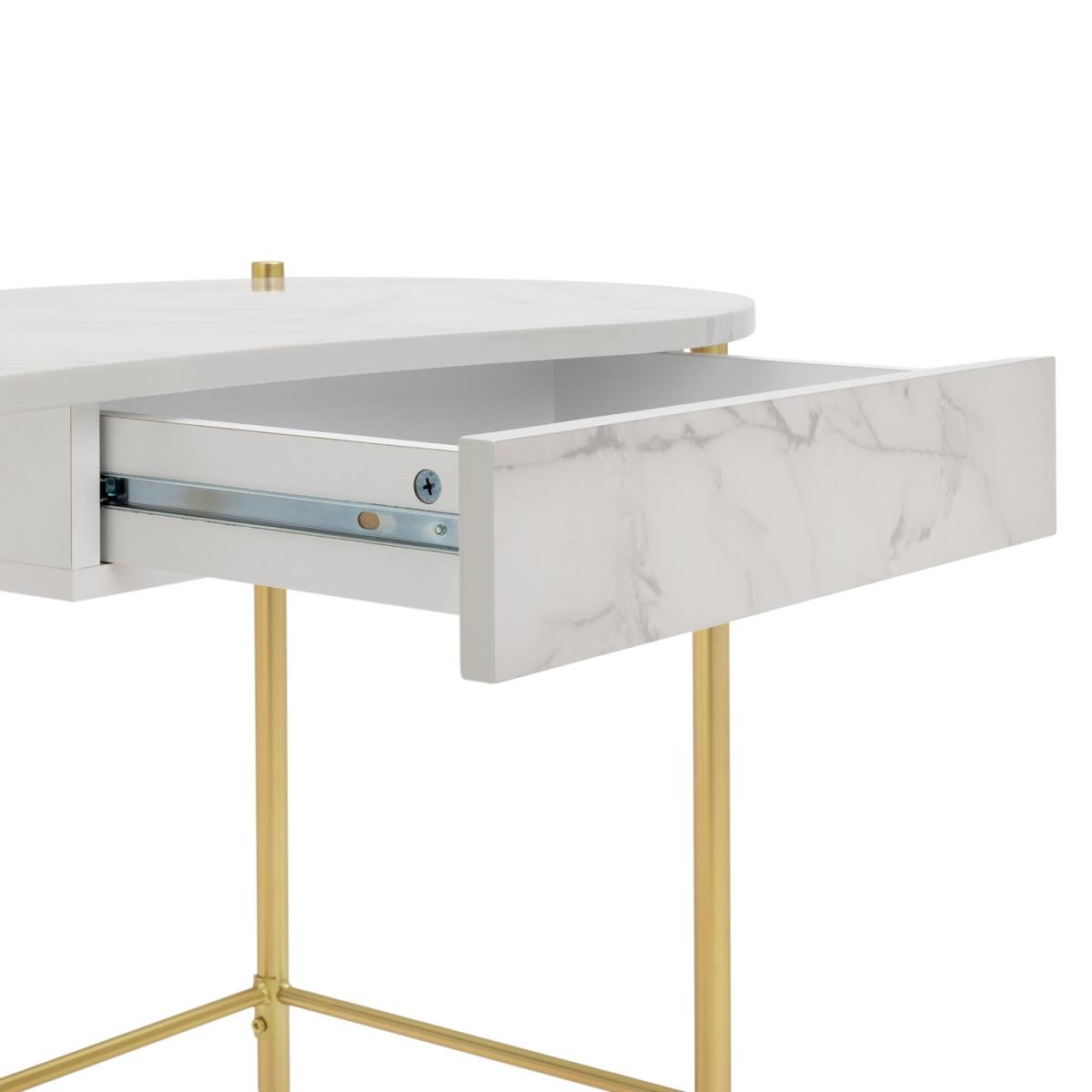 A modern marble marvel. Our Dulcie desk brings a pop of polished professionalism to a home office. The marble effect detailing, and painted gold legs have more than a hint of Italian charm. With an easy-glide drawer to tuck away documents and stationery. Made from MDF. 1 drawer with metal runners. No easy cable access. Self-assembly - 2 people recommended. Wall fixing recommended. If this product is over 60cm high it must be securely attached to the wall to prevent overturning. General information: Manufacturer's 1 year guarantee. Dimensions: Size H76, W109, D50cm. Under desk chair space H73.2, W88.8cm. Maximum load capacity of desk 20kg. Weight 13.5kg. Packaged dimensions: Package dimensions H10, W119, D55cm. FSC certified meaning the materials used for this product are responsibly sourced.